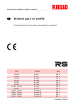 Instructions pour installation, utilisation et entretien F Brûleurs gaz à air soufflé Fonctionnement à deux allures progressif ou modulant Code Modèle Type 3787032 RS 70/E 828 T2 3787033 RS 70/E 828 T2 3787232 RS 100/E 829 T2 3787233 RS 100/E 829 T2 3787432 RS 130/E 830 T2 3787433 RS 130/E 830 T2 3787630 - 3787632 RS 190/E 836 T2 20052617 RS 190/E 836 T2 3789200 - 3789210 RS 250/E MZ 866 T1 3789201 - 3789211 RS 250/E MZ 866 T1 3789230 - 3789240 RS 250/E MZ 866 T1 3789231 - 3789241 RS 250/E MZ 866 T1 2916368 (8) - 09/2013 Déclaration de conformité d'après ISO / IEC 17050-1 Fabricant: RIELLO S.p.A. Adresse: Via Pilade Riello, 7 37045 Legnago (VR) Produit: Brûleur gaz à air soufflé Modèle: RS 70/E RS 100/E RS 130/E RS 190/E RS 250/E MZ Ces produits sont conformes aux normes techniques suivantes: EN 676 EN 12100 Conformément aux dispositions des Directives Européennes: GAD MD LVD EMC 2009/142/CE 2006/42/CE 2006/95/CE 2004/108/CE Directive appareils à gaz Directive machines Directive basse tension Compatibilité électromagnétique ces produits sont marqués comme indiqué par la suite: CE-0085AQ0708 (RS 70-100-130/E) CE-0085BT0657 (RS 190/E) CE-0085BT0061 (RS 250/E MZ) Legnago, 30.05.2012 Direction Division Brûleurs RIELLO S.p.A. Ing. I. Zinna La qualité est garantie grâce à un système de qualité et de gestion certifié conforme à UNI EN ISO 9001. Déclaration du constructeur RIELLO S.p.A. déclare que les produits suivants respectent les valeurs limite d'émission de NOx imposés par la norme allemande «1. BImSchV revision 26.01.2010». Produit Type Modèle Puissance Brûleur gaz à air soufflé 866 T1 RS 250/E MZ 600-2650 kW Legnago, 30.05.2012 Direction Division Brûleurs RIELLO S.p.A. 6368 Ing. I. Zinna 3 F Index Section 1 2 3 4 5 Page Informations et avertissements généraux 3 1.1 1.2 3 3 Sécurité et prévention 4 2.1 2.2 4 4 5 3.1 3.2 3.3 3.4 3.5 3.6 3.7 3.8 3.9 3.10 3.11 3.12 5 5 5 6 6 7 7 8 9 9 10 11 Désignation brûleurs Modèles disponibles Catégories du brûleur - pays de destination Données techniques Données électriques Poids brûleur Dimensions d'encombrement Plages de travail Composants du brûleur Matériel fourni Boîte de contrôle du rapport air/combustible Servomoteurs Installation 12 4.1 4.2 4.3 4.4 4.5 4.6 4.7 4.8 4.9 12 12 12 12 13 15 17 18 19 Indications concernant la sécurité pour l'installation Manutention Contrôles préliminaires Position de fonctionnement Fixation du brûleur à la chaudière Réglage de la tête de combustion Montage de la rampe gaz Raccordements électriques Réglage du relais thermique Mise en fonction, réglage et fonctionnement du brûleur 20 5.1 20 5.17 5.18 7 Avant propos Formation du personnel Description technique du brûleur 5.2 5.3 5.4 5.5 5.6 5.7 5.8 5.9 5.10 5.11 5.12 5.13 5.14 5.15 5.16 6 Informations sur le manuel d'instructions Garantie et responsabilités Indications concernant la sécurité pour la première mise en fonction Opérations avant la mise en fonction Démarrage du brûleur Réglage final des pressostats Panneau opérateur avec afficheur LCD Modes d'affichage et programmation Séquence de fonctionnement du brûleur Procédure de démarrage Fonction CALC Réglage du brûleur Fonctionnement de régime Absence d'allumage Extinction du brûleur en marche Arrêt du brûleur Mesurage du courant d'ionisation Contrôle de la pression de l'air et du gaz à la tête de combustion Contrôles finaux (avec brûleur en marche) Liste des paramètres 20 21 21 23 24 29 30 32 32 33 33 33 33 33 33 33 34 Inconvénients - Causes - Remèdes 38 6.1 38 Liste codes d'erreur Entretien 42 7.1 7.2 7.3 7.4 42 42 43 43 Indications concernant la sécurité pour l'entretien Programme d'entretien Ouverture brûleur Fermeture brûleur A Appendice - Schéma tableau électrique 44 B Appendice - Accessoires (à la demande) 50 C Appendice - Pression d’alimentation du gaz 52 D Appendice - Plage de travail en fonction de la densité de l’air 55 6368 4 F Informations et avertissements généraux 1 1.1 Informations sur le manuel d’instructions Introduction Le manuel d’instruction est fourni avec le brûleur: DANGER COMPOSANTS SOUS PRESSION il est une partie intégrante et fondamentale du produit et ne doit jamais être séparé de ce dernier; il doit toujours être conservé avec soin pour pouvoir être consulté au besoin et il doit accompagner le brûleur si celui-ci doit être cédé à un autre propriétaire ou utilisateur, ou bien s’il doit être déplacé sur une autre installation. S’il a été endommagé ou égaré demander une autre copie au Service d’Assistance à la clientèle de Zone; DANGER Autres symboles PROTECTION DE L’ENVIRONNEMENT Ce symbole donne des indications pour utiliser la machine en respectant l’environnement. il a été réalisé pour être utilisé par du personnel compétent; il donne des indications et des informations importantes sur la sécurité de l’installation, la mise en fonction, l’utilisation et l’entretien du brûleur. DANGERS DE CARACTÈRE GÉNÉRIQUE Il existe trois niveaux de danger comme indiqué ci-après. ATTENTION ATTENTION 1.2 Livraison de l’installation et du manuel d’instruction Lorsque l’on reçoit l’installation il faut que: Le manuel d’instruction soit remis à l’utilisateur par le constructeur, avec la recommandation de le conserver dans la pièce où le générateur de chaleur doit être installé. Sur le manuel d’instruction soient reportés: le numéro d’immatriculation du brûleur; l’adresse et le numéro de téléphone du Centre d’Assistance à la clientèle; Le fournisseur de l’installation informe soigneusement l’utilisateur à propos de: - l’utilisation de l’installation, - les éventuels essais pouvant être nécessaires avant l’activation de l’installation, - l’entretien et la nécessité de faire contrôler l’installation au moins une fois par an par une personne chargée de cette opération par le Const