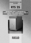 CHAUDIÈRES EN ACIER RTS 2S INSTRUCTIONS POUR LE RESPONSABLE DE L’INSTALLATION, POUR L’INSTALLATEUR ET POUR LE SERVICE D’ASSISTANCE TECHNIQUE CONFORMITÉ Les chaudières r RTS 2S sont conformes à la Directive Rendements 92/42/CEE. Quand elles sont associées à un brûleur gaz à air soufflé, portant le marquage CE, elles répondent aussi à la Directive Gaz 2009/142/CE (jusqu’au 20 avril 2018) et Règlement (UE) 2016/426 (à partir du 21 avril 2018) et aux parties applicables de la Directive Compatibilité Électromagnétique 2014/30/UE et Basse Tension 2014/35/UE. GAMME MODÈLE CODE RTS 115 2S 20039921 RTS 150 2S 20033204 RTS 200 2S 20033205 RTS 247 2S 20033206 RTS 319 2S 20033207 RTS 410 2S 20033209 RTS 526 2S 20033210 RTS 736 2S 20040152 RTS 850 2S 20047146 RTS 1012 2S 20041609 RTS 1200 2S 20047147 RTS 1355 2S 20043557 RTS 1500 2S 20047148 RTS 1850 2S 20046225 CARACTERISTIQUES -- Haut rendement -- Faibles émissions polluantes (quand elles sont associées à des brûleurs Low NOx). 2 Cher Client, Nous vous remercions d’avoir choisi une chaudière r RTS 2S, un produit moderne, de qualité et à haut rendement, à même de vous assurer pendant longtemps un bien-être total et de remarquables caractéristiques de fiabilité et de sécurité ; en particulier si vous confiez votre chaudière à un Service d’Assistance Technique r, qui a été spécifiquement préparé et formé pour effectuer l’entretien périodique, de manière à garantir un niveau d’efficacité maximal avec des coûts de service inférieurs, et qui dispose, au besoin, de pièces de rechange d’origine. Cette notice technique contient d’importantes informations et des conseils qui doivent être suivis pour une installation plus simple et une utilisation optimale de la chaudière r RTS 2S. Cordialement. Riello S.p.A. 3 SOMMAIRE GÉNÉRALITÉS Avertissements généraux Règles fondamentales de sécurité Description de l’appareil Tableaux de commande Brûleurs conseillés pour l’association Identification Données techniques page 5 “ 5 “ 6 “ 7 “ 7 “ 10 “ 10 RESPONSABLE DE L’INSTALLATION Mise en service Arrêt temporaire Arrêt pour de longues périodes Nettoyage Entretien Informations utiles page 11 “ 12 “ 13 “ 13 “ 14 “ 14 INSTALLATEUR Réception du produit Dimensions et poids Manutention Local d’installation de la chaudière Montage sur des installations anciennes ou à moderniser Raccordements hydrauliques Pompe anti-condensats Évacuation des produits de la combustion Charnières de la porte Variation du sens d’ouverture de la porte Raccordement de mise à la terre Montage de l’habillage Positionnement des sondes SERVICE D’ASSISTANCE TECHNIQUE Préparation à la première mise en service Première mise en service Contrôles pendant et après la première mise en service Entretien - Ouverture de la porte - Réglage de la porte Nettoyage de la chaudière Éventuelles anomalies et solutions page 15 “ 16 “ 16 “ 17 “ “ “ “ “ “ “ “ “ 18 18 18 20 20 21 25 26 28 page 29 “ 30 “ “ “ “ “ “ 31 32 32 32 33 34 Les symboles qui suivent sont utilisés dans certaines parties de cette notice : b ATTENTION = actions nécessitant des précautions particulières et une préparation adéquate a INTERDIT = actions qui NE DOIVENT EN AUCUN CAS être accomplies Cette notice Code 20041991 Rév. 16 (12/17) contient 36 pages. 4 SOMMAIRE AVERTISSEMENTS GÉNÉRAUX bbLe produit est livré dans des colis séparés ; s’assu- rer que la fourniture est intacte et complète et, en cas de différence par rapport à ce qui a été commandé, s’adresser à l’Agence r ayant vendu la chaudière. bbL’installation des chaudières r RTS 2S doit être effectuée par une entreprise agréée conformément à la législation en vigueur. Au terme du travail, ladite entreprise doit délivrer au propriétaire une déclaration de conformité attestant que l’installation a été réalisée selon les règles de l’art, c’est-à-dire conformément aux normes en vigueur et aux indications fournies par r dans la notice d’instructions. bbLa chaudière ne doit être destinée qu’à l’utilisation prévue par r, pour laquelle elle a été spécialement réalisée. r décline toute responsabilité contractuelle et extracontractuelle en cas de dommages causés à des personnes, des animaux ou des biens, dus à des erreurs d’installation, de réglage ou d’entretien ou, encore, à une utilisation anormale. bbEn cas de fuites d’eau, débrancher la chaudière du réseau d’alimentation électrique, fermer l’alimentation hydraulique et faire appel le plus rapidement possible au Service d’Assistance Technique r ou à des professionnels qualifiés. bbVérifier périodiquement que la pression de service de l’installation hydraulique est supérieure à 1 bar et inférieure à la limite maximale prévue pour l’appareil. Dans le cas contraire, contacter le Service d’Assistance Technique r ou des professionnels qualifiés. bbEn cas de non-utilisation de la chaudière pendant une longue période, il est conseillé de faire appel au Service d’Assistance Technique r ou à des professionnels qualifiés qui devront effectuer au moins les opérations suivantes : - mettre l’interrupteur principal de l’appareil et l’interrupteur général de l’installation sur « arrêt » ; - fermer les robinets du combustible et de l’eau de l’installation thermique ; - vidanger l’installation thermique s’il y a un risque de gel. bbEffectuer l’entretien de la chaudière au moins une fois par an. bbCette notice fait partie intégrante de la chaudière et doit par conséquent être conservée avec soin et TOUJOURS l’accompagner même en cas de cession à un autre propriétaire ou utilisateur ou de transfert sur une autre installation. Si la notice a été abîmée ou perdue, en demander un autre exemplaire au Service d’Assistance Technique r le plus proche. RÈGLES 