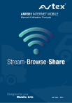 AMR985 INTERNET MOBILE Manuel d'utilisation Français Contenu Installation d'antennes .............................................. 2 Avertissement d'installation ....................................... 5 AMR985 paramètres de base ................................... 8 Routeur ...................................................................................................................... 8 Appareil SMART ............................................................................................................. 11 Ordinateur Windows ................................................................................................. 12 Connexion à Avtex Smart TV ................................................................................... 13 Accès à l'interface Web ............................................................................................ 14 Affichage des appareils SMART ..................................................................................... 15 Transition LTE / WiFi ................................................................................................ 16 Contrôle de l'utilisation des données AMR985 .......................................................... 17 AMR985 Redémarrage / Réinitialisation d'usine ....................................................... 19 Spécifications pour AMR985 ................................... 20 Mobile ...................................................................................................................... 20 Sans fil............................................................................................................................ 20 Nutrition .......................................................................................................................... 20 Spécifications physiques .......................................................................................... 21 Conditions de garantie .............................................. 22 1 Installation de l’antenne Cette antenne n'a pas besoin d'un plan de masse pour fonctionner et peut donc être monté sur un panneau de toit en métal ou en plastique. Étape 1 Si l'antenne est montée avec d'autres antennes ou sur le toit L'équipement doit être placé, essayez un espace d'au moins 30 cm (12 ») autour de l'antenne pour créer des problèmes d'interférencesempêcher. L'antenne tient sur un panneau d'une épaisseur allant jusqu'à 9 mm – Le kit d'extension est inclus pour les panneaux plus épais. Étape 2 Masquez la zone autour de la position du trou autour de la peinture et de la Vedette. Percez un petit trou, puis utilisez une fraise de la bonne taille ou augmenter le diamètre du trou à 19 mm (ou 25 mm si vous utilisez un boulon d'extension), en s'assurant La perceuse/fraise n'entre pas en contact avec la garniture de toit interne. Nettoyez la zone autour du trou et enlevez soigneusement toute la saleté et la graisse. Étape 3 25mm lors de l'utilisation du boulon d'extension L'antenne est fixée au moyen de la surface autocollante fournie de sorte que la rotation pendant l'installation est empêchée et le joint entre l'antenne et la plaque de montage s'améliorent. Il est recommandé d'installer ne doit pas être effectué à des températures inférieures à 10 °C (50 °F). 2 Étape 4 Retirez le dos protecteur au bas de l'antenne et Faites passer les câbles coaxiaux à travers le panneau. Placez l'antenne sur le trou et entretenez-la pour un endroit sûr approprié. Collez l'antenne au panneau en appliquant une pression ferme vers le bas. L'antenne peut être utilisée et fixée dans n'importe quelle direction. . Étape 5 Si vous le souhaitez, un boulon d'extension est inclus qui peut être appliqué sur le boulon peut être attaché rendant l'antenne avec différents Les épaisseurs de toit peuvent être montées. Étape 6 Pour simplifier l'assemblage sur les câbles coaxiaux, il y a un écrou fendu prévoir. Lors du montage de l'écrou, il est important de s'assurer que les câbles Maintenu au centre pendant que l'écrou est correctement tordu sur le fil. L'écrou doit être ajusté librement à la main et ne doit être utilisé qu'avec une clé. être resserré. Montez l'écrou et la rondelle par le bas et serrez-les à un couple de 5 Nm (3,6 ft/lb). Assurez-vous que le couvercle d'étanchéité est bon comprimé. 3 Dans la mesure du possible, nous vous recommandons de tester le système avant d'utiliser le système Avtex recommande l'installation par un professionnel installateur. L'antenne peut être utilisée dans n'importe quelle direction Placé. L'antenne est conçue pour une installation permanente et peut être sous Les conditions normales, une fois installées, ne seront pas supprimées. Si vous le souhaitez, du silicone supplémentaire peut être appliqué autour de la base. 4 Avertissemnt pendant l'installation Guidage et connexion du ou des kable(s) coaxial(s) Connectez les rallonges coaxiales à l'antenne et acheminez les câbles vers l’équipement. Lors de la pose des câbles, veillez à ce qu'ils ne longent pas le câblage existant du véhicule ou ne contaminent pas les pièces mobiles du véhicule. Les câbles ne doivent pas passer devant un système d'airbag. Si nécessaire, fixez des connecteurs coaxiaux ou des adaptateurs appropriés aux câbles. Contactez votre revendeur si des câbles d'extension sont nécessaires. test Vérifiez les câbles : • Continuité de la mise à la terre: le corps du connecteur à la terre du véhicule doit mesurer <0,2Ω (le cas échéant). • Pour les éléments LTE, le boîtier du connecteur à la broche centrale doit mesurer une faible résistance (les éléments sont mis à la terre CC). Les éléments WiFi doivent mesurer le circuit ouvert avec le même test. • Effectuez une vérification VSWR – le VSWR sur tous les flux doit répondre aux spécificités de la fiche technique profuct. • Connectez les kables cellulaire/LTE et