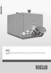12/2017 cod. 20065941 rev. 17 RTQ FR INSTRUCTIONS POUR LE RESPONSABLE DE L’INSTALLATION, POUR L’INSTALLATEUR ET POUR LE SERVICE D’ASSISTANCE TECHNIQUE GAMME MODÈLE RTQ 50 RTQ 64 RTQ 82 RTQ 105 RTQ 154 RTQ 203 RTQ 235 RTQ 297 RTQ 323 RTQ 357 RTQ 418 RTQ 467 RTQ 537 RTQ 597 RTQ 715 RTQ 837 Cher Client, Nous vous remercions d'avoir choisi une chaudière R, un produit moderne, de qualité, à même de garantir pendant très longtemps confort, fiabilité et sécurité ; notamment si vous confiez votre chaudière à un Service d’Assistance Technique R, qui a été spécifiquement préparé et formé pour en effectuer l'entretien périodique, à moindre coût et en utilisant, au besoin, des pièces détachées d'origine ; entretien indispensable pour que votre appareil fonctionne longtemps à son niveau maximum d'efficacité. Cette notice d’instructions contient des informations et des conseils importants qui doivent être respectés pour utiliser au mieux la chaudière RTQ. CODE 20029726 20029727 20029729 20029731 20008935 20008937 20008938 20008940 20008941 20008942 20008943 20008944 20113300 20113301 20008947 20107214 Cordialement Riello S.p.A. CONFORMITÉ Les chaudières R RTQ sont conformes à : −− Directive Rendements 92/42/CEE et Annexe E du DPR italien du 26 août 1993 n° 412 (**). Quand elles sont associées à un brûleur gaz à air soufflé, portant le marquage CE, elles répondent aussi à : −− Directive Gaz 2009/142/CE (jusqu’au 20 avril 2018) et Règlement (UE) 2016/426 (à partir du 21 avril 2018) −− parties applicables de la Directive Compatibilité Électromagnétique 2014/30/UE −− parties applicables de la Directive Basse Tension 2014/35/ UE ACCESSOIRES Pour la liste complète des accessoires et les informations relatives à leur couplage, consulter le Catalogue. FRANÇAIS 2 Sommaire SOMMAIRE 1 GÉNÉRALITÉS . . . . . . . . . . . . . . . . . . . . . . . . . . . . . . . . . . . . . . 4 1.1 1.2 1.3 1.4 1.5 1.6 1.7 Avertissements généraux . . . . . . . . . . . . . . . . . . . . . . . 4 Règles fondamentales de sécurité . . . . . . . . . . . . . . . . 4 Description de l’appareil . . . . . . . . . . . . . . . . . . . . . . . 4 Tableaux de commande . . . . . . . . . . . . . . . . . . . . . . . . 6 Brûleurs conseillés pour l’accouplement . . . . . . . . . . . . 7 Identification . . . . . . . . . . . . . . . . . . . . . . . . . . . . . . . . 9 Données techniques . . . . . . . . . . . . . . . . . . . . . . . . . . 10 2 INSTALLATION . . . . . . . . . . . . . . . . . . . . . . . . . . . . . . . . . . . . . 12 2.1 2.2 2.3 2.4 2.5 2.6 2.7 2.8 2.9 2.10 2.11 2.12 2.13 2.14 2.15 2.16 2.17 2.18 2.19 2.20 Réception du produit . . . . . . . . . . . . . . . . . . . . . . . . . . 12 Dimensions et poids . . . . . . . . . . . . . . . . . . . . . . . . . . 13 Manutention . . . . . . . . . . . . . . . . . . . . . . . . . . . . . . . . 15 Local d’installation . . . . . . . . . . . . . . . . . . . . . . . . . . . . 15 Installation de chaudières de petite puissance . . . . . . 15 Montage sur des installations anciennes ou à moderniser . . . . . . . . . . . . . . . . . . . . . . . . . . . . . . . . . 16 Raccordements hydrauliques . . . . . . . . . . . . . . . . . . . . 16 Pompe anti-condensats . . . . . . . . . . . . . . . . . . . . . . . 19 Évacuation des produits de la combustion . . . . . . . . . . 20 Charnières de la porte . . . . . . . . . . . . . . . . . . . . . . . . . 20 Modification du sens d’ouverture de la porte . . . . . . . 21 Montage de l’isolation et des turbulateurs . . . . . . . . . . 23 Raccordement de mise à la terre . . . . . . . . . . . . . . . . . 25 Montage de la carrosserie . . . . . . . . . . . . . . . . . . . . . . 25 Préparation à la première mise en service . . . . . . . . . . 30 Première mise en service . . . . . . . . . . . . . . . . . . . . . . . 30 Contrôles pendant et après la première mise en service31 Entretien . . . . . . . . . . . . . . . . . . . . . . . . . . . . . . . . . . . 32 Nettoyage de la chaudière . . . . . . . . . . . . . . . . . . . . . . 33 Guide de dépannage . . . . . . . . . . . . . . . . . . . . . . . . . . 35 3 UTILISATION . . . . . . . . . . . . . . . . . . . . . . . . . . . . . . . . . . . . . . . 36 3.1 3.2 3.3 3.4 3.5 3.6 Mise en service . . . . . . . . . . . . . . . . . . . . . . . . . . . . . . . 36 Arrêt temporaire . . . . . . . . . . . . . . . . . . . . . . . . . . . . . . 37 Arrêt pour de longues périodes . . . . . . . . . . . . . . . . . . 37 Nettoyage . . . . . . . . . . . . . . . . . . . . . . . . . . . . . . . . . . 37 Entretien . . . . . . . . . . . . . . . . . . . . . . . . . . . . . . . . . . 38 Informations utiles . . . . . . . . . . . . . . . . . . . . . . . . . . . . 39 Cette notice - Rév. contient pages. Ces symboles sont utilisés dans certaines parties de cette notice : 99ATTENTION = actions nécessitant des précautions particulières et une préparation adéquate. 00INTERDICTION = actions NE DEVANT EN AUCUN CAS être accomplies. Cette notice 20065941 - Rév. 17 (12/2017) contient 40 pages. 3 GÉNÉRALITÉS GÉNÉRALITÉS 1 00Il est interdit de toucher la chaudière si on est pieds nus ou GÉNÉRALITÉS avec des parties du corps mouillées ou humides. 1.1 00Il est interdit d’effectuer toute intervention technique ou de Avertissements généraux nettoyage avant d’avoir débranché la chaudière du réseau d’alimentation électrique en mettant l’interrupteur général de l’installation ainsi que l’interrupteur principal du panneau de commande sur « Arrêt ». 99Le produit est livré dans des colis séparés ; s'assurer que la fourniture est intacte et complète et, en cas de différence par rapport à ce qui a été commandé, s'adresser à l'Agence R ayant vendu l'appareil. 00Il est interdit de modifier les dispositifs de sécurité ou de régulation sans l’autorisation du fabricant. 99L’installation du produit doit être effectuée par une entre- 0