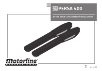 FR PERSA 400 NOTICE POUR L’UTILISATEUR/INSTALLATEUR V4.5 REV. 12/2024 00. CONTENU 01. AVIS DE SÉCURITÉ INDEX Ce produit est certifié selon les normes de sécurité de la Communauté Européenne (CE). 01. AVIS DE SECURITÉ DES NORMES À SUIVRE Ce produit est conforme à la directive 2011/65/ UE du Parlement européen et du Conseil sur la limitation de l’utilisation de certaines substances dangereuses dans les équipements électriques et électroniques et à la directive déléguée (UE) 2015/863 de la Commission. 1B 02. L’ EMBALLAGE DANS L’EMBALLAGE 4A 03. L’ AUTOMATISME CARACTERÍSTIQUES TÉCHNIQUES 4B VÉRROUILLER/DÉVERROUILLER L’ AUTOMATISME (Applicable dans les pays avec des systèmes de recyclage). Ce marquage sur le produit, ou de la littérature indique que le produit et les accessoires électroniques (ex. Chargeur, câble USB, le matériel électronique, les télécommandes, etc.) ne doivent pas être jeté avec les autres déchets ménagers à la fin de sa vie utile. Pour éviter des éventuels dommages à l’environnement ou à la santé humaine provenant de l’élimination incontrôlée des déchets, nous vous prions de séparer ces éléments des autres types de déchets et à les recycler de façon responsable pour promouvoir la réutilisation durable des ressources matérielles. Les particuliers doivent contacter un revendeur où ils ont acheté ce produit ou une Agence de l’Environnement National, pour savoir où et comment ils peuvent prendre ces articles pour leur recyclage. Les utilisateurs professionnels doivent contacter leur fournisseur et vérifier les termes et conditions du contrat d’achat. Ce produit et ses accessoires électroniques ne doivent pas être mélangés avec d’autres déchets commerciaux. 5A 04. INSTALLATION QUOTAS D’ INSTALLATION VERTICAUX 5B QUOTAS D’ INSTALLATION HORIZANTAUX 6A PROCÉS D’ INSTALLATION 7A RÉGLAGE DES MICROS INSTALLATION EN IMAGE 8A 9 05. SCHÉMA DE RACCORDEMENTS MOTOR A 230V/110V 10A MOTOR A 24V 10A 06. DES ESSAIS AUX COMPOSANTS MOTOR A 24V 10B MOTOR A 230V/110V 11 07. ENTRETIEN ENTRETIEN 12 Ce marquage indique que les piles ne doivent pas être jetées comme les autres déchets ménagers à la fin de leur vie utile. Les piles doivent être remises pour recyclage à des points de collecte distincts. 08. SOLUTION DE PANNES INSTRUCTIONS POUR CONSOMMATEURS 13 INSTRUCTIONS POUR TECHNICIENS QUALIFIÉS 13 Les différents types d’emballages (carton, plastique, etc.) doivent être collectés séparément pour être recyclés. Séparez les emballages et recyclez-les de manière responsable. Ce marquage indique que le produit et les accessoires électroniques (ex. Chargeur, câble USB, les équipements électroniques, les télécommandes, etc.), sont soumis à des décharges électriques. Soyez prudent lors de la manipulation du produit et suivre toutes les règles de sécurité indiquée dans cette notice. 1A FR FR 1B 01. AVIS DE SÉCURITÉ AVERTISSEMENTS GÉNÉRAUX • Ce manuel contient des informations importantes sur la sécurité et l’utilisation. Lisez attentivement toutes les instructions avant de commencer les procédures d’installation / d’utilisation et conservez ce manuel dans un endroit sûr, où vous pourrez le consulter à tout moment. • Ce produit est destiné à être utilisé uniquement comme décrit dans ce manuel. Toute autre application ou opération non prise en compte est expressément interdite car elle pourrait endommager le produit et / ou mettre les personnes en danger de causer des blessures graves. • Ce manuel s’adresse principalement aux installateurs professionnels et n’empêche pas l’utilisateur de lire la section “Normes d’utilisation” afin de garantir le fonctionnement correct du produit. • L’installation et la réparation de cet équipement doivent être effectuées que par des techniciens qualifiés et expérimentés, en veillant à ce que toutes ces procédures soient effectuées en conformité avec les lois et les réglementations en vigueur. Il est expressément interdit aux utilisateurs non professionnels et inexpérimentés de prendre des mesures sauf sur demande expresse de techniciens spécialisés. • Les installations doivent être fréquemment inspectées afin de détecter tout déséquilibre et toute trace d’usure ou de détérioration des câbles, des ressorts, des charnières, des roues, des supports ou de tout autre élément d’assemblage mécanique. • N’utilisez pas l’équipement si une réparation ou un réglage est nécessaire. • Lors de la maintenance, du nettoyage et du remplacement de pièces, le produit doit être débranché de l’alimentation électrique. Cela inclut également toute opération nécessitant l’ouverture du capot du produit. • L’utilisation, le nettoyage et la maintenance de ce produit peuvent être effectués par des personnes âgées de huit ans et plus et des personnes dont les capacités physiques, sensorielles ou mentales sont réduites, ou par des personnes ignorant le fonctionnement du produit, à condition qu’elles aient supervision ou des instructions données par des personnes expérimentées dans l’utilisation du produit de manière sûre et qui comprennent les risques et les dangers encourus. • Les enfants ne doivent pas jouer avec le produit ou des dispositifs d’ouverture afin d’empêcher le déclenchement involontaire de la porte ou du portail motorisé. • Si le câble d’alimentation est endommagé, il doit être remplacé par le fabricant, le service après-vente ou une personne de qualification similaire afin d’éviter tout danger. • L’appareil doit être débranché du réseau électrique lors du retrait de la batterie. • Veiller à éviter tout blocage entre la partie actionnée et les parties fixes adjacentes dû au mouvement d’ouverture de la partie actionnée. AVERTISSEMENT POUR L’INSTALLATEUR • Avant de commencer les procédures d’installati