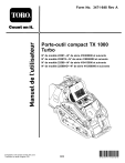 Form No. 3471-648 Rev A Porte-outil compact TX 1000 Turbo N° de modèle 22587—N° de série 418300000 et suivants N° de modèle 22587G—N° de série 418000000 et suivants N° de modèle 22588—N° de série 418413000 et suivants N° de modèle 22588HD—N° de série 418300000 et suivants Enregistrez votre produit à www.Toro.com. Traduction du texte d'origine (FR) *3471-648* Vous commettez une infraction à la section 4442 ou 4443 du Code des ressources publiques de Californie si vous utilisez cette machine dans une zone boisée, broussailleuse ou recouverte d'herbe à moins d'équiper le moteur d'un pare-étincelles en bon état, tel que défini à la section 4442, ou à moins de construire, équiper et entretenir le moteur de manière à prévenir les incendies. pour vous-même et pour les personnes à proximité. Ne modifiez pas la machine ou ses outils. Cette machine doit être utilisée, révisée et réparée uniquement par des professionnels connaissant bien ses caractéristiques ainsi que les procédures de sécurité pertinentes. Utilisez cette machine à des températures ambiantes comprises entre -18 et 38 °C. Contactez votre concessionnaire-réparateur agréé pour connaître les dispositions nécessaires pour utiliser cette machine dans des températures extrêmes. Le manuel du propriétaire du moteur ci-joint est fourni à titre informatif concernant la réglementation de l'Agence américaine pour la protection de l'environnement (EPA) et la réglementation antipollution de l'état de Californie relative aux systèmes antipollution, à leur entretien et à leur garantie. Vous pouvez vous en procurer un nouvel exemplaire en vous adressant au constructeur du moteur. Lisez attentivement cette notice pour apprendre comment utiliser et entretenir correctement votre produit, et éviter ainsi de l'endommager ou de vous blesser. Vous êtes responsable de l'utilisation sûre et correcte du produit. ATTENTION Rendez-vous sur www.Toro.com pour tout document de formation à la sécurité et à l'utilisation des produits, pour tout renseignement concernant un produit ou un accessoire, pour obtenir l'adresse des concessionnaires ou pour enregistrer votre produit. CALIFORNIE Proposition 65 - Avertissement L'état de Californie considère les gaz d'échappement des moteurs diesel et certains de leurs composants comme susceptibles de provoquer des cancers, des malformations congénitales et autres troubles de la reproduction. Les bornes de la batterie et accessoires connexes contiennent du plomb et des composés de plomb. L'état de Californie considère ces substances chimiques comme susceptibles de provoquer des cancers et des troubles de la reproduction. Lavez-vous les mains après avoir manipulé la batterie. L'utilisation de ce produit peut entraîner une exposition à des substances chimiques considérées pas l'état de Californie comme capables de provoquer des cancers, des anomalies congénitales ou d'autres troubles de la reproduction. Pour obtenir des prestations de service, des pièces d'origine Toro ou des renseignements complémentaires, munissez-vous des numéros de modèle et de série du produit et contactez un concessionnaire-réparateur agréé ou le service client Toro. La Figure 1 indique l'emplacement des numéros de modèle et de série sur le produit. Inscrivez les numéros dans l'espace réservé à cet effet. Important: Avec votre appareil mobile, vous pouvez scanner le QR code sur l'autocollant du numéro de série (le cas échéant) pour accéder aux renseignements sur la garantie, les pièces détachées et autres informations concernant le produit. Introduction Cette machine est un porte-outil compact prévu pour transporter la terre et autres matériaux utilisés dans les travaux de paysagement et de construction. Elle est conçue pour fonctionner avec un large choix d'outils spécialisés. L'utilisation de ce produit à d'autres fins que celle prévue peut être dangereuse © 2025—The Toro® Company 8111 Lyndale Avenue South Bloomington, MN 55420 2 Contactez-nous sur www.Toro.com. Imprimé aux États-Unis Tous droits réservés d'ordre mécanique spécifiques, et Remarque pour souligner des informations d'ordre général méritant une attention particulière. Table des matières Sécurité .................................................................... 4 Consignes de sécurité générales........................ 4 Consignes de sécurité pour l'utilisation sur les pentes ....................................................... 5 Autocollants de sécurité et d'instruction .............. 6 Vue d'ensemble du produit ...................................... 13 Commandes .................................................... 13 Affichage de l'InfoCenter ............................... 17 Caractéristiques techniques ............................ 20 Outils et accessoires......................................... 21 Avant l'utilisation .................................................. 21 Contrôles de sécurité avant l'utilisation ............. 21 Ajout de carburant ............................................ 22 Procédures d'entretien quotidien ...................... 23 Pendant l'utilisation ............................................. 24 Consignes de sécurité pendant l'utilisation ..................................................... 24 Démarrage du moteur....................................... 25 Démarrage du moteur par temps froid............... 26 Conduire la machine......................................... 26 Réglage de la vitesse de déplacement maximale ...................................................... 26 Arrêt du moteur................................................. 27 Utilisation des outils .......................................... 27 Comprendre le système de déplacement Smart Power® .............................................. 29 Après l'utilisation ................................................. 30 Consignes de sécur