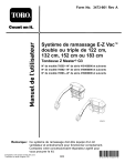Form No. 3473-661 Rev A Système de ramassage E-Z Vac™ double ou triple de 122 cm, 132 cm, 152 cm ou 183 cm Tondeuse Z Master® G3 N° de modèle 78555—N° de série 418160000 et suivants N° de modèle 78562—N° de série 418000000 et suivants N° de modèle 78563—N° de série 418000000 et suivants Remarque: Ce système de ramassage doit être équipé d'un kit ventilateur et entraînement pour fonctionner correctement. Contactez votre concessionnaire-réparateur agréé pour vous procurer le kit. Enregistrez votre produit à www.Toro.com. Traduction du texte d'origine (FR) *3473-661* Ce produit est conforme à toutes les directives européennes pertinentes. Pour plus de renseignements, reportez-vous à la Déclaration d'incorporation (DOI) à la fin de ce document. ATTENTION CALIFORNIE Proposition 65 - Avertissement L'utilisation de ce produit peut entraîner une exposition à des substances chimiques considérées pas l'état de Californie comme capables de provoquer des cancers, des anomalies congénitales ou d'autres troubles de la reproduction. g009306 Figure 1 Numéro de série du système de ramassage de 122 et 132 cm 1. Emplacement des numéros de modèle et de série du système de ramassage Introduction Lisez attentivement cette notice pour apprendre comment utiliser et entretenir correctement votre produit, et éviter ainsi de l'endommager ou de vous blesser. Vous êtes responsable de l'utilisation sûre et correcte du produit. Rendez-vous sur www.Toro.com pour tout document de formation à la sécurité et à l'utilisation des produits, pour tout renseignement concernant un produit ou un accessoire, pour obtenir l'adresse des concessionnaires ou pour enregistrer votre produit. g009416 Figure 2 Numéro de série du système de ramassage de 152 et 183 cm 1. Emplacement des numéros de modèle et de série du système de ramassage Pour obtenir des prestations de service, des pièces d'origine Toro ou des renseignements complémentaires, munissez-vous des numéros de modèle et de série du produit et contactez un concessionnaire-réparateur agréé ou le service client Toro. La Figure 1 et la Figure 2 indiquent l'emplacement des numéros de modèle et de série du produit. Inscrivez les numéros dans l'espace réservé à cet effet. N° de modèle N° de série Les mises en garde de ce manuel soulignent des dangers potentiels et sont signalées par le symbole de sécurité (Figure 3), qui indique un danger pouvant entraîner des blessures graves ou mortelles si les précautions recommandées ne sont pas respectées. g000502 Figure 3 1. Symbole de sécurité Ce manuel utilise deux termes pour faire passer des renseignements essentiels. Important pour attirer © 2025—The Toro® Company 8111 Lyndale Avenue South Bloomington, MN 55420 2 Contactez-nous sur www.Toro.com. Imprimé aux États-Unis Tous droits réservés l'attention sur des informations d'ordre mécanique spécifiques et Remarque pour souligner des informations d'ordre général méritant une attention particulière. Dépistage des défauts ............................................ 34 Table des matières Sécurité .................................................................... 4 Autocollants de sécurité et d'instruction .............. 4 Mise en service ......................................................... 6 1 Préparation de la machine ............................... 7 2 Montage des pare-chocs latéraux .................... 7 3 Montage des supports de fixation du système de ramassage ................................... 8 4 Installation des bacs sur les armatures ............. 9 5 Montage du capot et des bacs........................ 10 6 Montage du déflecteur de silencieux .............. 12 7 Acheminement de la courroie de ventilateur dans le ventilateur ......................................... 12 8 Montage du ventilateur .................................. 13 9 Montage des tubes d'éjection......................... 15 10 Pose du protège-courroie ............................ 19 11 Montage des masses ................................... 20 12 Montage des butées .................................... 22 13 Réglage du frein de stationnement ............... 22 14 Contrôle de la pression des pneus................ 23 Utilisation ................................................................ 23 Positionnement du déflecteur réglable .............. 24 Vider les bacs à herbe ...................................... 24 Élimination des obstructions dans le système de ramassage ............................................... 25 Dépose du système de ramassage ................... 25 Utilisation du déflecteur d'herbe........................ 26 Transport de la machine ................................... 26 Conseils d'utilisation ........................................ 26 Entretien ................................................................. 29 Programme d'entretien recommandé .................. 29 Nettoyage de la grille du capot .......................... 29 Nettoyage du système de ramassage et des bacs .............................................................. 29 Contrôle de la courroie du ventilateur ................ 29 Remplacement de la courroie de ventilateur sur les tondeuses de 152 et 183 cm ............... 29 Remplacement de la courroie de ventilateur sur les tondeuses de 122 et 132 cm ............... 30 Contrôle et réglage du verrou du ventilateur ..................................................... 31 Graissage du bras de tension ........................... 31 Contrôle du système de ramassage.................. 32 Contrôle des lames de coupe............................ 32 Montage des lames du plateau de coupe ............................................................ 32 Remplacement du déflecteur d'herbe ............... 32 Remisage ............................................................... 33 3 Sécurité • N'utilisez jamais la machine si le déflecteur d'éjectio
