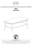octobre, 2023 CPH12 TABLE BASSE Instructions de montage – Important: Déballez soigneusement le colis et identifiez chaque composant avant de tenter un montage. Référez-vous à la liste des pièces jointe. Veuillez prendre soin lors du montage de l’unité et posez toujours les pièces sur une surface propre et lisse. Si vous avez besoin d’assistance en ce qui concerne le montage, les pièces ou si vous souhaitez recevoir des informations sur d’autres produits, veuillez visiter notre site Web: www.officestar.net, ou écrivez-nous par courriel ou par la poste. 1. Ne pas utiliser ce produit à moins que toutes les vis et tous les boulons soient resserrés. 2. Vérifier à tous les trois mois ou au besoin que toutes les vis et tous les boulons sont resserrés. 3. Éliminer les matériaux de conditionnement d’une manière convenable. Ne pas utiliser la couverture en plastique pour couvrir la tête à cause du risque d’étouffement. 4. Ne pas utiliser ce produit comme un escabeau. 5. Ce produit ne doit servir qu’à l’usage pour lequel il a été conçu. 6. POUR USAGE INTÉRIEUR ET RÉSIDENTIEL SEULEMENT. GARANTIE LIMITÉE OSP Home Furnishings® garantit à l’acheteur original que ce produit sera exempt de tout défaut de pièces et de main d’œuvre tel que décrit ci-dessous. OSP Home Furnishings® réparera ou remplacera, à sa discrétion, sans frais à l’acheteur original seulement, les produits ou les pièces défectueux/défectueuses durant une période d’un (1) an à compter de la date d’achat. Les pièces de rechange ne peuvent être fournies que lorsque celles-ci sont disponibles. Les pièces d’articles discontinués peuvent ne pas être disponibles. Cette garantie est effective pour la période de temps applicable à compter de la date d’achat indiquée sur votre reçu de vente original. Cette garantie est votre seul recours pour les défauts de produits et exclut les défauts liés à ou découlant d’un abus ou d’une mauvaise utilisation d’un produit, à l’utilisation d’une modification, ou d’accessoires, d’un produit, et aux produits ou pièces utilisés, entretenus ou installés contrairement aux directives d’installation, d’entretien ou autres applicables de l’entreprise. Il n’existe aucune autre garantie, expresse ou implicite, autre que celle expressément décrite, y compris, mais sans s’y limiter, toute garantie implicite de qualité marchande ou d’adéquation à un usage particulier. OSP Home Furnishings® ne sera pas tenue responsable des dommages directs ou indirects. Certains États ne permettent pas l’exclusion ou la limitation des dommages accidentels ou consécutifs, et donc les limitations ou exclusions susmentionnées peuvent ne pas s’appliquer à vous. Cette garantie vous donne des droits légaux spécifiques comme vous pouvez également avoir d’autres droits qui peuvent varier d’un État à un autre. Nos normes de qualité sont parmi les meilleures de l’industrie. Parfois, et malgré toutes nos tentatives, il existe des moments où les pièces peuvent être endommagées ou manquantes. Notre service des pièces de rechange fera tout son possible pour remédier rapidement à ce problème. Contactez-nous par courriel [email protected], par télécopieur 1-909-930-5629 ou par téléphone au numéro sans frais du service des pièces 1-800-950-7262, du lundi au vendredi de 8h00 à 15h30, heure du Pacifique. Pour faire une réclamation de garantie, contacter le service des pièces. Fournir le numéro de modèle, preuve de paiement, et une description du problème. À sa discrétion, OSP Home Furnishings®: (a) fournira des pièces compatibles de produits courants (b) réparera la pièce du client. Le client doit payer d’avance les frais de transport de toute pièce retournée à l’usine. Les frais de transport de retour pour des pièces encore sous garantie seront payés par OSP Home Furnishings®. 3. Rename all English discriptions to French discriptions. LISTE DES PIÈCES (A) Haut (1 PC) (B) Étagère (1 PC) (C) Jambe (4 PCS) LISTE DU MATÉRIEL DESCRIPTION TAILLE QUANTITÉ 1 Boulon 1/4” x 50mm 8 PCS 2 Vis 4 x 30mm 4 PCS 3 Rondelle plate Ø15 x Ø8x1mm 8 PCS 4 Rondelle Ø11 x Ø8x1mm 8 PCS 5 Clé Allen 4 x 58mm 1 PC ÉT. DESSIN Le tourne-a-vis de phillips est aussi besoin pour l’assemblage (non fourni). ÉTAPE 1 (3) (4) (1) (5) (C) (A) NE PAS SERRER LES BOULONS. ÉTAPE 2 (2) (B) (2) NE PAS SERRER LES VIS. ÉTAPE 3 (B) (2) (C) (1) (5) (4) (3) TOURNER EN POSITION VERTICALE, APPLIQUER PRESSION FIRME POUR ALIGNER ET SERRER ENTIÈREMENT TOUTES LES VIS (2) AVEC LE TOURNE-A-VIS DE PHILLIPS (NON FOURNI). SERREZ TOUTES LES BOULONS (1). ">