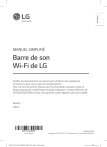 FRANÇAIS MANUEL SIMPLIFIÉ Barre de son Wi-Fi de LG Veuillez lire attentivement ce manuel avant d’utiliser votre appareil et conservez-le pour vous y reporter ultérieurement. Pour voir les instructions relatives aux fonctionnalités avancées, visitez le http://www.lg.com et téléchargez le guide d’utilisation. Certains éléments de ce manuel pourraient ne pas correspondre à votre appareil, selon son modèle. MODÈLE SN8YG MFL71828454 2104_Rev03 SN8YG.DCANLLK_SIMPLE_FRE(CAN)_MFL71828454.indd 1 www.lg.com Copyright © 2020-2021 LG Electronics Inc. Tous droits réservés. 2021-04-12 1:12:23 Panneau avant Raccordement du caisson de basses Microphone Placez le caisson de basses sans fil près de la barre de son et suivez les étapes ci-dessous. a Branchez le cordon d’alimentation de la barre de son et du caisson de basses sans fil dans la prise de courant. b Mettez la barre de son sous tension. • La barre de son et le caisson de basses sans fil se connectent automatiquement. Le voyant à DEL vert du caisson de basses s’allume. Voyant à DEL de l’Assistant Google 1 (Alimentation) · · · · · · · · · · Mise sous tension ou hors tension de l’appareil F (Fonction) · · · · · · · · · · · · · · · · · · Sélection d’une fonction p/o (Volume) · · · · · · · · · · · · · · · · · · Réglage du volume N · · · · · · · · · · · · · · · · · · · · · · · · · · · · · · · · · · · · · Lecture/Pause > (Sourdine du micro) · · · Activation ou désactivation de la reconnaissance vocale · · · · Pause ou arrêt de la rétroaction de l’Assistant Google Réinitialisez l’appareil Maintenez enfoncé le bouton > de l’appareil jusqu’à ce que vous entendiez un signal sonore. Panneau arrière DC IN · · · · · · · · · · · · · · · · · Connexion à un adaptateur c.a. HDMI IN · · · · · Connexion à un appareil avec sortie HDMI HDMI OUT (TV eARC/ARC) · · · · · · · · · Connexion à un téléviseur OPTICAL IN · · · · · · · · Connexion à un appareil optique Port USB · · · · · · · · · · · · · · · · · · Connexion à un appareil USB Connexion manuelle du caisson de basses Si le caisson de basses n’émet pas de son, essayez de le connecter manuellement. a Appuyez sur le bouton Pairing (Jumelage) à l’arrière du caisson de basses sans fil. • Le voyant à DEL vert à l’arrière du caisson de basses sans fil clignote rapidement. (Si le voyant à DEL vert ne clignote pas, appuyez sur le bouton Pairing (Jumelage) et maintenez-le enfoncé.) b Mettez la barre de son sous tension. • Le jumelage est terminé. Le voyant à DEL vert à l’arrière du caisson de basses sans fil s’allume. Pour éviter les interférences entre les équipements sans fil, la barre de son et le caisson de basses doivent être à une distance d’au moins 1 m (3,3 pi) de tout appareil (comme un routeur sans fil, un four à micro-ondes, etc.). !1 m (3,3 pi) Si le câble optique n’est pas connecté dans le bon sens, cela peut endommager la prise optique. SN8YG.DCANLLK_SIMPLE_FRE(CAN)_MFL71828454.indd 2 2021-04-12 1:12:24 Raccordement du téléviseur Raccordez la barre de son au téléviseur à l’aide des prises optique ( ) ou HDMI ARC ( ). Connexion au réseau a c Raccordement optique a Raccordez la barre de son au téléviseur à l’aide d’un câble optique. b Sélectionnez [Haut-parleur externe (Optique)] dans le menu des paramètres du téléviseur. Téléviseur Raccordement HDMI (TV eARC/ARC) a Raccordez la barre de son au téléviseur à l’aide d’un câble HDMI. b Sélectionnez [Haut-parleur externe (HDMI ARC)] dans le menu des paramètres du téléviseur. b a Vérifiez l’état du réseau. Un routeur connecté au réseau doit être installé. b Connectez votre appareil intelligent à votre réseau domestique. c Branchez la barre de son à la source d’alimentation. Tous les appareils doivent être connectés au même routeur. Étape 1. Installer l’application Google Home Téléchargez l’application Google Home à partir de la boutique Google Play ou de l’App Store. Téléviseur Étape 2. Configurer la connexion Wi-Fi avec l’application a Connectez votre appareil intelligent au réseau Wi-Fi que vous utiliserez pour votre haut-parleur. • La connexion HDMI n’est pas disponible si votre téléviseur ne prend pas en charge HDMI ARC. • Si l’appareil est connecté simultanément aux entrées OPTICAL et ARC, le signal ARC a la priorité. Raccordement d’un périphérique supplémentaire a Raccordez le périphérique externe comme suit. Les appareils iOS doivent être réglés sur Bluetooth. b Lancez l’application « Google Home ». c Suivez les étapes pour la connexion Wi-Fi sur l’application. • Lorsque le haut-parleur est adéquatement connecté au Wi-Fi, la mention « CONNECTED » s’affiche à l’écran, et un signal sonore se fait entendre. (Boîtier décodeur, lecteur, etc.) Téléviseur OU b Réglez la source d’entrée en appuyant plusieurs fois sur F. SN8YG.DCANLLK_SIMPLE_FRE(CAN)_MFL71828454.indd 3 2021-04-12 1:12:25 • Lors de la connexion au Wi-Fi, cette application peut demander de créer un compte Google. Vous aurez besoin d’un compte Google pour utiliser cette application. • L’application « Google Home » est fournie par Google. Elle pourrait être modifiée à la suite d’un changement de la politique de Google. • Pour obtenir de plus amples renseignements (configuration, usage, aide, etc.), faites une recherche en utilisant les mots « Aide Assistant Google » ou visitez le site Web https://support.google. com/assistant. Ce site public est mis à la disposition des utilisateurs d’appareils qui fonctionnent avec l’Assistant Google. • Le haut-parleur ne prend pas en charge certaines fonctions du site « Aide Assistant Google ». • Le haut-parleur n’est pas compatible avec l’application « Smart ThinQ ». Par conséq