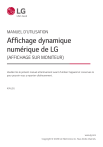 MANUEL D’UTILISATION Affichage dynamique numérique de LG (AFFICHAGE SUR MONITEUR) Veuillez lire le présent manuel attentivement avant d’utiliser l’appareil et conservez-le pour pouvoir vous y reporter ultérieurement. 49VL5G www.lg.com Copyright © 2020 LG Electronics inc. Tous droits réservés. 2 FRANÇAIS TABLE DES MATIÈRES PRÉCAUTIONS DE SÉCURITÉ........3 -- Précautions à prendre avec l’adaptateur c.a. et l’alimentation électrique.................................................4 -- Précautions à prendre pour déplacer le produit.....................................................................................6 -- Précautions liées à l’installation du produit........7 -- Précautions liées au nettoyage du produit..........9 -- Précautions liées à l’utilisation du produit........10 -- Précautions liées à l’utilisation de la télécommande..................................................................12 -- Précautions en cas d’image rémanente..............13 -- Mise au rebut....................................................................13 ASSEMBLAGE ET PRÉPARATION............................. 14 -- Pièces....................................................................................15 -- Orientation portrait.......................................................15 -- Méthode de rangement pour protéger le panneau...............................................................................16 -- Installation sur un mur.................................................18 -- Configuration de périphériques externes..........20 -- Disposition en mosaïque.............................................21 TÉLÉCOMMANDE....................... 24 ÉTABLISSEMENT DES CONNEXIONS............................. 26 -- Connexion à un ordinateur........................................26 -- Connexion de périphériques externes.................26 -- Utilisation de la liste d’entrées................................27 -- Connexion de moniteurs en chaîne.......................28 DÉPANNAGE............................... 29 CARACTÉRISTIQUES DU PRODUIT...................................... 32 LICENCES.................................... 34 3 PRÉCAUTIONS DE SÉCURITÉ Les consignes de sécurité sont conçues pour prévenir les dangers et les blessures en aidant l’utilisateur à utiliser le produit de façon sécuritaire et aux fins prévues. AVERTISSEMENTS Le non-respect des avertissements peut entraîner des blessures graves, un accident ou un décès. MISES EN GARDE Si vous ignorez les mises en garde, vous pourriez vous blesser légèrement, ou le produit pourrait être endommagé. AVERTISSEMENTS •• Utilisez ce produit à l’intérieur seulement. FRANÇAIS AVERTISSEMENTS - Cet équipement est conforme aux normes de classe A du CISPR 32. Dans un environnement domestique, cet équipement peut causer des interférences radio. 4 FRANÇAIS Précautions à prendre avec l’adaptateur c.a. et l’alimentation électrique AVERTISSEMENTS •• Utilisez le cordon d’alimentation ou l’adaptateur c.a. fourni ou approuvé par LG Electronics inc. Si vous utilisez un autre cordon d’alimentation, assurez-vous qu’il est certifié selon les normes nationales. Si le cordon d’alimentation est endommagé ou défectueux, veuillez communiquer avec le fabricant ou avec le centre de réparation autorisé le plus près de chez vous pour le remplacer. •• Utilisez le moniteur seulement à partir d’une source d’alimentation (c.-à-d. à la tension) indiquée dans les caractéristiques du produit. -- Sinon, le produit pourrait être endommagé, un incendie pourrait se produire, ou vous pourriez recevoir une décharge électrique. Si vous n’êtes pas sûr du type d’alimentation dont vous disposez, consultez une entreprise d’électricité certifiée. •• Vérifiez que le cordon d’alimentation est branché à une prise de courant correctement mise à la terre. -- Sinon, vous pourriez recevoir une décharge électrique ou subir des blessures, ou le produit pourrait être endommagé. •• Insérez la fiche d’alimentation ou l’adaptateur c.a. fermement de sorte qu’il ne puisse pas se relâcher. -- Un mauvais branchement pourrait causer un incendie ou une décharge électrique. •• En présence de tonnerre ou d’éclairs, ne touchez jamais le cordon d’alimentation ou le câble de signal; cela pourrait être très dangereux. -- Cela pourrait entraîner une décharge électrique. •• Assurez-vous de ne pas marcher sur le cordon d’alimentation ou l’adaptateur c.a. ni d’y poser d’objets (appareils électroniques, vêtements, etc.). En outre, ne pliez pas ou ne tirez pas le cordon d’alimentation ou l’adaptateur c.a. avec une force excessive. -- Un cordon d’alimentation endommagé pourrait causer un incendie ou une décharge électrique. •• Ne branchez pas le cordon d’alimentation ou l’adaptateur c.a. à une prise électrique s’il a été endommagé par des objets tranchants. -- Vous pourriez recevoir une décharge électrique. •• N’insérez pas d’objets conducteurs (comme une baguette en métal) dans l’une des extrémités du cordon d’alimentation pendant que l’autre extrémité est branchée à la prise murale. En outre, ne touchez pas le cordon d’alimentation juste après l’avoir débranché. -- Vous pourriez recevoir une décharge électrique. •• Ne branchez pas le cordon d’alimentation ou l’adaptateur c.a. à une sortie multiple sur laquelle sont branchés d’autres appareils électriques ou appareils chauffants. Utilisez une sortie multiple distincte et mise à la terre. -- Il pourrait autrement en résulter un incendie en raison de la surchauffe. 5 MISES EN GARDE •• Si la prise, les broches de la fiche d’alimentation ou l’adaptateur c.a. sont recouverts de poussière, essuyez la poussière et assurez-vous qu’ils restent propres. -- Un incendie ou une décharge éle