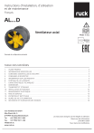 Instructions d’installation, d’utilisation et de maintenance Français AL...D Ventilateur axial Made in EU Exemple de configuration présenté TABLE DES MATIÈRES 1. 2. 3. 4. 5. 6. 7. 8. 9. 10. 11. 12. 13. 14. 15. AVANT-PROPOS . . . . . . . . . . . . . . . . . . . . . . . . . . . . . . . . . . . . . . . . . . . . . . . . . . . . . . . . . . . . . . . . . . . . . . . . . . . . 2 INFORMATIONS ESSENTIELLES . . . . . . . . . . . . . . . . . . . . . . . . . . . . . . . . . . . . . . . . . . . . . . . . . . . . . . . . . . . . . . . . 2 CONSIGNES ESSENTIELLES DE SÉCURITÉ . . . . . . . . . . . . . . . . . . . . . . . . . . . . . . . . . . . . . . . . . . . . . . . . . . . . . . . 3 CONSIGNES À RESPECTER . . . . . . . . . . . . . . . . . . . . . . . . . . . . . . . . . . . . . . . . . . . . . . . . . . . . . . . . . . . . . . . . . . . . 5 INFORMATION SUR LES PRODUITS . . . . . . . . . . . . . . . . . . . . . . . . . . . . . . . . . . . . . . . . . . . . . . . . . . . . . . . . . . . . . 5 CONTENU DE LA LIVRAISON . . . . . . . . . . . . . . . . . . . . . . . . . . . . . . . . . . . . . . . . . . . . . . . . . . . . . . . . . . . . . . . . . . 6 CARACTÉRISTIQUES TECHNIQUES . . . . . . . . . . . . . . . . . . . . . . . . . . . . . . . . . . . . . . . . . . . . . . . . . . . . . . . . . . . . . 7 DIMENSIONS . . . . . . . . . . . . . . . . . . . . . . . . . . . . . . . . . . . . . . . . . . . . . . . . . . . . . . . . . . . . . . . . . . . . . . . . . . . . . . . 8 TRANSPORT ET STOCKAGE . . . . . . . . . . . . . . . . . . . . . . . . . . . . . . . . . . . . . . . . . . . . . . . . . . . . . . . . . . . . . . . . . . . 9 INSTALLATION ET MONTAGE . . . . . . . . . . . . . . . . . . . . . . . . . . . . . . . . . . . . . . . . . . . . . . . . . . . . . . . . . . . . . . . . . 10 BRANCHEMENT ÉLECTRIQUE. . . . . . . . . . . . . . . . . . . . . . . . . . . . . . . . . . . . . . . . . . . . . . . . . . . . . . . . . . . . . . . . . 12 MISE EN SERVICE . . . . . . . . . . . . . . . . . . . . . . . . . . . . . . . . . . . . . . . . . . . . . . . . . . . . . . . . . . . . . . . . . . . . . . . . . . 15 ENTRETIEN ET NETTOYAGE . . . . . . . . . . . . . . . . . . . . . . . . . . . . . . . . . . . . . . . . . . . . . . . . . . . . . . . . . . . . . . . . . . 15 DURÉE DE VIE ET ÉLIMINATION . . . . . . . . . . . . . . . . . . . . . . . . . . . . . . . . . . . . . . . . . . . . . . . . . . . . . . . . . . . . . . . 17 RECHERCHE ET ÉLIMINATION DES PANNES . . . . . . . . . . . . . . . . . . . . . . . . . . . . . . . . . . . . . . . . . . . . . . . . . . . . . 18 ruck Ventilatoren GmbH Max-Planck-Str. 5 D-97944 Boxberg-Windischbuch Tel. +49 7930 9211-300 Fax. +49 7930 9211-166 [email protected] www.ruck.eu Les instructions d’origine ont été rédigées en allemand. Mise à jour des informations print 08.01.2024 Sous réserve de modifications FR 1. AVANT-PROPOS Chers clients, Merci d’avoir choisi notre appareil. Avant d’utiliser l’appareil, lisez attentivement les instructions d’installation, d’utilisation et de maintenance. Si vous avez des questions, veuillez contacter : (Coordonnées cf. page 1) Les données fournies dans ces instructions d’installation, d’utilisation et de maintenance ne concernent que la description du produit. Une déclaration relative à une propriété ou une qualification précise pour une certaine application ne peut être déduite de nos données. Les données fournies ne dispensent pas l’utilisateur de ses propres évaluations et examens. Tous les droits sont la propriété du fabricant, même dans le cas de demandes de protection. Tout pouvoir de disposition, tel que les droits de copie et de transfert, nous appartient. 2. INFORMATIONS ESSENTIELLES Ces instructions de service comprennent des informations essentielles pour procéder au montage sûr et conforme de l’appareil, pour son transport, sa mise en service, son utilisation, son entretien, son démontage et l’élimination de pannes simples. L’appareil a été fabriqué conformément aux règles de l’art dans le domaine technique. Il existe toutefois un risque de dommages aux personnes et aux biens en cas de non-respect des consignes de sécurité et avertissements de base mentionnés ci-après. ■■ Lisez attentivement et intégralement ces instructions de service avant d’utiliser l’appareil. ■■ Conservez les instructions de service de façon à ce qu’elles soient accessibles en permanence à tous les utilisateurs. ■■ Si vous transmettez l’appareil à un tiers, remettez-lui toujours les instructions de service. 2.1. Documents et informations applicables Outre les instructions de montage, d’utilisation et d’entretien, les documents et les renseignements suivants doivent être suivis : Plaque signalétique Normes applicables Documents disponibles sur www.ruck.eu ■■ DIN VDE 0100-100 ■■ Instructions d’installation, d’utilisation et de maintenance ■■ DIN EN 60204-1 ■■ Instruction de programmation du convertisseur de fréquence (Fonctionnement en courant triphasé) ■■ DIN EN ISO 13857 ■■ DIN EN ISO 12100 ■■ DIN 24154R3 ■■ VDI 2052 ■■ VDMA 24186-1 ■■ Déclaration de conformité ■■ Déclaration d’incorporation CE (Directive 2006/42/CE) ■■ Protocole de mise en service (formulaire) ■■ Textes d’appels d’offres ■■ Dessins cotés ■■ Dessin technique format DWG ■■ Dessin technique format DXF ■■ Dessin 3D format STEP 2.2. Prescriptions et réglementation S’il est correctement installé et utilisé, l’appareil est conforme aux normes en vigueur et à la directive de l’UE au moment de sa mise sur le marché. En outre, respectez les réglementations généralement en vigueur, légales et autres de la législation européenne ou nationale, ainsi que les réglementations en matière de prévention des accidents et de protection de l’environnement en vigueur dans votre pa 2.3. Garantie et responsabilité Les ventil