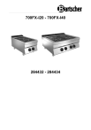 700FX-I20 - 700FX-I40 284432 - 284434 Bartscher GmbH Franz-Kleine-Str. 28 D-33154 Salzkotten Allemagne tél. +49 5258 971-0 fax : +49 5258 971-120 Hotline technique : +49 5258 971-197 www.bartscher.com Version: 1.0 Date de création : 2025-02-10 FR Manuel d'utilisation original 1 2 3 4 5 6 7 8 9 Sécurité ......................................................................................................... 2 1.1 Explication des avertissements ................................................................ 2 1.2 Consignes de sécurité ............................................................................. 3 1.3 Risques résiduels..................................................................................... 7 1.4 Équipement de protection individuelle ..................................................... 9 1.5 Utilisation conforme à l’usage ................................................................ 10 1.6 Utilisation non conforme à l’usage ......................................................... 10 Généralités .................................................................................................. 11 2.1 Responsabilité et garantie ..................................................................... 11 2.2 Protection des droits d’auteur ................................................................ 11 2.3 Déclaration de conformité ...................................................................... 11 Transport, emballage et stockage ............................................................... 12 3.1 Inspection suite au transport .................................................................. 12 3.2 Emballage .............................................................................................. 12 3.3 Stockage ................................................................................................ 12 Paramètres techniques ................................................................................ 13 4.1 Indications techniques ........................................................................... 13 4.2 Fonctions de l’appareil ........................................................................... 14 4.3 Éléments de l’appareil............................................................................ 15 Mode de installaton ..................................................................................... 17 5.1 Installation.............................................................................................. 17 Mode d’emploi ............................................................................................. 19 6.1 Utilisation ............................................................................................... 19 Nettoyage et maintenance ........................................................................... 23 7.1 Consignes de sécurité pour le nettoyage ............................................... 24 7.2 Nettoyage .............................................................................................. 24 7.3 Maintenance .......................................................................................... 24 Défaillances possibles ................................................................................. 25 Élimination des déchets ............................................................................... 26 284432 1 / 28 Sécurité Diese Bedi enungsanlei tung besc hrei bt di e Installation, Bedi enung und Wartung des Geräts und gilt als wic htige Inform ationsquelle und N achschl agew erk. Z najom ość w szystkich zaw artyc h w ni ej wsk az ówek dotycz ącyc h bezpi ecz eńs twa i obsł ugi stanowi w arunek bez pi ecz nej i prawi dłow ej pr acy z urządz eni em. Ponadto należy przestrzeg ać odpowi ednio do mi ejsca użytk owani a urządz eni a l okal nyc h przepis ów dotycz ącyc h z apobieg ani a wy padk om oraz og ólnyc h zas ad BH P. Dies e Bedi enungsanleitung is t Bes tandteil des Produkts und m uss i n unmittelbarer N ähe des Ger äts für das In¬s tall ations-, Bedi enungs-, W artungs- und R einigungspers onal j ederzei t z ugänglich auf¬bewahrt w erden. W enn das Ger ät an eine dritte Pers on weitergegeben wird, muss die Bedi enungsanlei tung mit ausgehändigt wer den. Avant d’utiliser l’appareil, lire attentivement la notice et la conserver dans un endroit facilement accessible, à proximité de l’appareil ! La présente notice d’utilisation décrit l’installation, la manipulation et la maintenance de l’appareil, elle est une source d’informations importante et un ouvrage de référence. La connaissance de toutes les consignes de sécurité et d’utilisation comprises dans la présente notice est une condition indispensable pour assurer le fonctionnement correct et en toute sécurité de l’appareil. Avant de mettre en marche l’appareil, lire la présente notice d’utilisation, pour éviter les blessures et les dommages matériels. Une utilisation incorrecte peut endommager l’appareil. À chaque étape d’utilisation de l’appareil, toutes les informations essentielles contenues dans le mode d’emploi doivent être accessibles pour le personnel. C’est l’opérateur qui est responsable de leur disponibilité. Outre le mode d’emploi, il est impératif de respecter les règles générales et la loi en en vigueur, relatives à la sécurité du travail et à la protection de l’environnement. FR 1 Sécurité L’appareil est conçu d’après les règles techniques en vigueur. Cependant, l’appareil peut constituer une source de dangers, s’il n’est pas utilisé correctement ou conformément à son usage. Toutes les personnes qui utilisent l’appareil doivent se tenir aux indications mentionnées dans la présente notice d’utilisation et respecter les consignes de sécurité. 1.1 Explication des avertissements Les indications importantes relatives à la sécurité ainsi que 