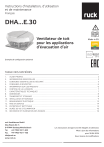 Instructions d‘installation, d‘utilisation et de maintenance Français DHA...E.30 Ventilateur de toit pour les applications d’évacuation d’air Made in EU 2018 Exemple de configuration présenté TABLE DES MATIÈRES 1. 2. 3. 4. 5. 6. 7. 8. 9. 10. 11. 12. 13. 14. 15. AVANT-PROPOS. . . . . . . . . . . . . . . . . . . . . . . . . . . . . . . . . . . . . . . . . . . . . . . . . . . . . . . . . . . . . . . . . . . . . . . . . . . . . 2 INFORMATIONS ESSENTIELLES . . . . . . . . . . . . . . . . . . . . . . . . . . . . . . . . . . . . . . . . . . . . . . . . . . . . . . . . . . . . . . . . 2 CONSIGNES ESSENTIELLES DE SÉCURITÉ . . . . . . . . . . . . . . . . . . . . . . . . . . . . . . . . . . . . . . . . . . . . . . . . . . . . . . . 3 CONSIGNES À RESPECTER . . . . . . . . . . . . . . . . . . . . . . . . . . . . . . . . . . . . . . . . . . . . . . . . . . . . . . . . . . . . . . . . . . . . 6 INFORMATION SUR LES PRODUITS . . . . . . . . . . . . . . . . . . . . . . . . . . . . . . . . . . . . . . . . . . . . . . . . . . . . . . . . . . . . . 6 CONTENU DE LA LIVRAISON . . . . . . . . . . . . . . . . . . . . . . . . . . . . . . . . . . . . . . . . . . . . . . . . . . . . . . . . . . . . . . . . . . 7 CARACTÉRISTIQUES TECHNIQUES . . . . . . . . . . . . . . . . . . . . . . . . . . . . . . . . . . . . . . . . . . . . . . . . . . . . . . . . . . . . . 7 DIMENSIONS . . . . . . . . . . . . . . . . . . . . . . . . . . . . . . . . . . . . . . . . . . . . . . . . . . . . . . . . . . . . . . . . . . . . . . . . . . . . . . . 8 TRANSPORT ET STOCKAGE . . . . . . . . . . . . . . . . . . . . . . . . . . . . . . . . . . . . . . . . . . . . . . . . . . . . . . . . . . . . . . . . . . . 8 INSTALLATION ET MONTAGE . . . . . . . . . . . . . . . . . . . . . . . . . . . . . . . . . . . . . . . . . . . . . . . . . . . . . . . . . . . . . . . . . . 9 BRANCHEMENT ÉLECTRIQUE. . . . . . . . . . . . . . . . . . . . . . . . . . . . . . . . . . . . . . . . . . . . . . . . . . . . . . . . . . . . . . . . . 13 MISE EN SERVICE . . . . . . . . . . . . . . . . . . . . . . . . . . . . . . . . . . . . . . . . . . . . . . . . . . . . . . . . . . . . . . . . . . . . . . . . . . 14 ENTRETIEN ET NETTOYAGE . . . . . . . . . . . . . . . . . . . . . . . . . . . . . . . . . . . . . . . . . . . . . . . . . . . . . . . . . . . . . . . . . . 14 DURÉE DE VIE ET ÉLIMINATION . . . . . . . . . . . . . . . . . . . . . . . . . . . . . . . . . . . . . . . . . . . . . . . . . . . . . . . . . . . . . . . 16 RECHERCHE ET ÉLIMINATION DES PANNES . . . . . . . . . . . . . . . . . . . . . . . . . . . . . . . . . . . . . . . . . . . . . . . . . . . . . 16 ruck Ventilatoren GmbH Max-Planck-Str. 5 D-97944 Boxberg-Windischbuch Tél. +49 7930 9211-300 Fax. +49 7930 9211-166 [email protected] www.ruck.eu Les instructions d‘origine ont été rédigées en allemand. Mise à jour des informations print 30.04.2024 Sous réserve de modifications FR 1. AVANT-PROPOS Chers clients, Merci d‘avoir choisi notre appareil. Avant d‘utiliser l‘appareil, lisez attentivement les instructions d‘installation, d‘utilisation et de maintenance. Si vous avez des questions, veuillez contacter : (Coordonnées cf. page 1) Les données fournies dans ces instructions d’installation, d’utilisation et de maintenance ne concernent que la description du produit. Une déclaration relative à une propriété ou une qualification précise pour une certaine application ne peut être déduite de nos données. Les données fournies ne dispensent pas l‘utilisateur de ses propres évaluations et examens. Tous les droits sont la propriété du fabricant, même dans le cas de demandes de protection. Tout pouvoir de disposition, tel que les droits de copie et de transfert, nous appartient. 2. INFORMATIONS ESSENTIELLES Ces instructions de service comprennent des informations essentielles pour procéder au montage sûr et conforme de l‘appareil, pour son transport, sa mise en service, son utilisation, son entretien, son démontage et l‘élimination de pannes simples. L‘appareil a été fabriqué conformément aux règles de l‘art dans le domaine technique. Il existe toutefois un risque de dommages aux personnes et aux biens en cas de non-respect des consignes de sécurité et avertissements de base mentionnés ci-après. ■■ Lisez attentivement et intégralement ces instructions de service avant d‘utiliser l‘appareil. ■■ Conservez les instructions de service de façon à ce qu‘elles soient accessibles en permanence à tous les utilisateurs. ■■ Si vous transmettez l‘appareil à un tiers, remettez-lui toujours les instructions de service. 2.1. Autres documents applicables Outre les instructions d‘installation, d‘utilisation et de maintenance, vous devez respecter les données et documents suivants relatifs au ventilateur : Plaque signalétique 2 | DHA...E.30 Normes applicables ■■ DIN VDE 0100-100 ■■ DIN EN 60204-1 ■■ DIN EN ISO 13857 ■■ DIN EN ISO 12100 ■■ VDMA 24186-1 Documents disponibles sur www.ruck.eu ■■ Instructions d‘installation, d‘utilisation et de maintenance ■■ Déclaration de conformité ■■ Déclaration d‘incorporation CE (Directive 2006/42/ CE) ■■ Protocole de mise en service (formulaire) ■■ Textes d’appels d’offres ■■ Dessins cotés ■■ Dessin technique format DWG ■■ Dessin technique format DXF ■■ Dessin 3D format STEP Instructions d‘installation, d‘utilisation et de maintenance FR 2.2. Prescriptions et réglementation S‘il est correctement installé et utilisé, l‘appareil est conforme aux normes en vigueur et à la directive de l‘UE au moment de sa mise sur le marché. En outre, respectez les réglementations généralement en vigueur, légales et autres de la législation européenne ou nationale, ainsi que les réglementations en matière de prévention des accidents et de protection de l‘environnement en vigueur dans votre pa 2.3. Garantie et responsabi