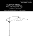 Item/Article # 1000 811 831 Model/Modèle # WG08G 10ft. OFFSET UMBRELLA PARASOL EXCENTRÉ 10pi. USER AND CARE GUIDE GUIDE D’ENTTRETIEN ET D’UTILISATION Item/Article # 1000 811 831 Item # 1000-721268 Model/Modèle # WG08G Model # WG08 10ft. OFFSET UMBRELLA PARASOL EXCENTRÉ 10pi. USER AND CARE GUIDE GUIDE D’ENTTRETIEN ET D’UTILISATION PART/ PARTIE PICTURE/IMAGE Quantitÿ QTY PART/ PARTIE PICTURE/IMAGE Quantitÿ QTY Item/Article # 1000 811 831 Item # 1000-721268 Model/Modèle # WG08G Model # WG08 10ft. OFFSET UMBRELLA PARASOL EXCENTRÉ 10pi. USER AND CARE GUIDE GUIDE D’ENTTRETIEN ET D’UTILISATION Assembly/Montage STEP/ÉTAPE 1 Assemble the umbrella stand. Monter le pied de parasol. A A B Item/Article # 1000 811 831 Item Item ## 1000-721268 1000-721268 Model/Modèle # WG08G Model Model ## WG08 WG08 10ft. OFFSET UMBRELLA 10ft. OFFSET UMBRELLA PARASOL EXCENTRÉ 10pi. USER AND CARE GUIDE GUIDE D’ENTTRETIEN ET D’UTILISATION STEP/ÉTAPE 2 Assemble the umbrella pole with stand. Assembler le poteau du parasol avec le pied. Item/Article # 1000 811 831 Item Item ## 1000-721268 1000-721268 Model/Modèle # WG08G Model Model ## WG08 WG08 10ft. OFFSET UMBRELLA 10ft. OFFSET UMBRELLA PARASOL EXCENTRÉ 10pi. USER AND CARE GUIDE GUIDE D’ENTTRETIEN ET D’UTILISATION STEP/ ÉTAPE 3 Open the umbrella canopy in different angles. Ouvre le canopée du parasol en différent positions. Item/Article # 1000 811 831 Item Item 1000-721268 Item ### 1000-721268 1000-721268 Model/Modèle # WG08G Model # Model WG08 Model ## WG08 WG08 10ft. OFFSET UMBRELLA 10ft. OFFSET UMBRELLA PARASOL EXCENTRÉ 10pi. USER AND CARE GUIDE GUIDE D’ENTTRETIEN ET D’UTILISATION STEP/ ÉTAPE 4 The umbrella can be opened in the horizontal position. Use cross base weights or bolts to secure (weights/securing bolts are not included). Le parasol peut étre ouvert dans la position horizontale. Utilisez des poids de base ou des boulons pour fixer le parapuluie/croix de base de parapluie à la surface. Item/Article # 1000 811 831 Item####1000-721268 1000-721268 Item Item 1000-721268 Item 1000-721268 Model/Modèle # WG08G Model WG08 Model # Model WG08 Model ###WG08 WG08 10ft. OFFSET UMBRELLA 10ft. OFFSET UMBRELLA PARASOL EXCENTRÉ 10pi. USER AND AND CARE CARE GUIDE GUIDE USER GUIDE D’ENTTRETIEN ET D’UTILISATION Care, Cleaning & Safety 1. Before using, wipe with a clean, dry cloth. Sharp thing will cause damage to the umbrella. When not in use store umbrella in a cool, dry place. 2. In case of rain and/or heavy wind the umbrella has to be taken down and put away carefully. 3. Umbrella should be secured in place with heavy umbrella base. Entretien, Nettoyage & Sécurité 1. Avant d’utiliser le parasol nottoie le toile avec un chiffon séche. Ne pas utiliser d’outils tranchants. L’orsqu’il n’est pas utilise utilisé, ranger-le dans un endroit. 2. Le parasel doit être fermé et enlevé de sa structure dés qu’il y a un vent fort, un orage, une pluie intense ou de la neige. 3. Ne poser le parasol que sur une base lourde et solide. Toujours veiller à une bonne stabilitè du pied du parasol ou pied fixe. Item/Article # 1000 811 831 Item#####1000-721268 1000-721268 Item 1000-721268 Item 1000-721268 Item Item 1000-721268 Model/Modèle # WG08G Model WG08 Model WG08 Model WG08 Model Model #####WG08 WG08 10ft. OFFSET UMBRELLA 10ft. OFFSET UMBRELLA PARASOL EXCENTRÉ 10pi. USER AND AND CARE CARE GUIDE GUIDE USER GUIDE D’ENTTRETIEN ET D’UTILISATION W arranty/Granantie 1. One year limited warranty for fabric. 1. Garantie limitée d’un an pour le tissne/toile. 2. One year limited warranty for frame. 2. Garantie limitée au cadre. Questions, problems, missing parts? Before returning to the store call Customer Service. 8:00 am - 4:00 pm EST Monday- Friday 1-877-527-0313 or 1-866-632-1718 Contact the Customer Service Team at HOMEDEOPT.COM and 1-877-527-0313 or www.partsnservice.com and 1-866-632-1718 Pour toutes questions relative à la maintenance, pour faire appel à notre service réparation ainsi que pour commander des pièces de rechange, veuillez vous adresser à notre centre de service aprée-vente. 8:00 am - 4:00 pm EST Lundi-Vendredi 1-877-527-0313 ou 1-866-632-1718 Contactez l’équipe du service à la clientéle à HOMEDEOPT.COM et 1-877-527-0313 ou www.partsnservice.com et 1-866-632-1718 ">