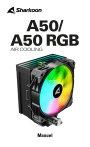 A50/ A50 RGB AIR COOLING Manuel Spécifications Caractéristiques générales: Compatibilité du support CPU: Conduits de chaleur: Dimensions (L x P x H): Poids: TDP (Thermal Design Power): Intel®: LGA1851/1700/1200/1150/1151/1155/ 1156/1356/1366/2011/2066 AMD®: AM5/AM4/AM3/AM2/FM1/FM2 5x Ø 6 mm 120 x 72 x 153 mm (A50) 120 x 72 x 156 mm (A50 RGB) 605 g (A50) 622 g (A50 RGB) 230 W Ventilateur: Nombre de ventilateurs: Dimensions (L x P x H): Vitesse du ventilateur: Type de roulement: Débit d‘air max.: Pression d‘air max.: Niveau sonore max.: Eclairage: Tension nominale (Ventilateur): Tension nominale (LEDs): Courant nominal (Ventilateur): Courant nominal (LEDs): Puissance nominale (Ventilateur): Puissance nominale (LEDs): Connecteur du ventilateur: Connecteur LED: Longueur du câble du ventilateur: Longueur du câble LED: 1 120 x 120 x 25 mm 500 – 1 800 tr/min ± 10 % Roulement à fluide dynamique 121,55 m³/h 2,90 mmH₂O 30 dB(A) 12x LED RVB adressable* 12 V 5 V* 0,30 A 0,54 A* 3,6 W 2,7 W* PWM 4 broches 4 broches (5V-D-coded-G)* 150 mm 350 mm* Contenu de l‘emballage: A50 / A50 RGB, Support de montage Intel®, Support de montage AMD®, Backplate, Vis de montage, Pâte thermique * Ventilateur LED RVB adressable (A50 RGB) 01 Consignes de sécurité L’appareil est destiné à servir de refroidisseur de CPU pour une utilisation dans le boîtier d’un PC. Pour votre propre sécurité, veillez à suivre les instructions ci-dessous avant d’utiliser l’appareil. Si le produit est endommagé en raison d’une mauvaise utilisation ou du non-respect des consignes de sécurité, la garantie du fabricant sera annulée. ATTENTION! • Montez le refroidisseur CPU à l’extérieur du boîtier PC. Si le boîtier PC doit être transporté, retirez le refroidisseur CPU du boîtier PC. • Ne branchez l’appareil qu’aux connecteurs prévus à cet effet sur la carte mère, comme indiqué dans ce manuel. Si nécessaire, utilisez le manuel d’utilisation de votre carte mère pour identifier clairement les connecteurs corrects. • Attention au risque de blessure dû aux bords et aux coins tranchants des ailettes de refroidissement et aux pales rotatives du ventilateur. N’insérez pas de corps étrangers entre les pales du ventilateur en rotation, car cela pourrait endommager le ventilateur. • Pour éviter tout risque de blessure, ne touchez pas le refroidisseur CPU pendant son fonctionnement. • Ne mettez jamais l’appareil en contact avec de l’humidité ou des liquides. • N’utilisez pas d’air comprimé pour nettoyer le ventilateur. Cela pourrait créer une charge électrique à partir du rotor en rotation et endommager les composants. Utilisez plutôt un chiffon sec. • Ne convient pas aux enfants de moins de 6 ans. Contient de petites pièces. Risque d’étouffement ! 02 Intel® A B C E D F H I AMD® G Pâte thermique J K 03 Intel® B AMD® 04 Intel® C Ou D A E Ou F B AMD® H G I 05 Intel® J K AMD® J K 06 Installer le refroidisseur 07 Connecter le ventilateur CPU_FAN Connecter la LED (A50 RGB) ADD_HEADER 08 Remarque(s) Mentions légales Sharkoon n’assume aucune responsabilité pour les pertes de données, en particulier celles causées par un traitement inapproprié. Les noms de produits et descriptions sont des marques commerciales et/ou protégées des fabricants respectifs, acceptées comme protégées. Dans le cadre de la politique d‘amélioration continue des produits chez Sharkoon, le design et les spécifications sont sujets à des modifications sans préavis. Les spécifications nationales du produit peuvent varier. Tous les droits sont réservés, en particulier pour la traduction, la réimpression, la reproduction par copie ou tout autre moyen technique. Toute infraction donnera lieu à une demande de compensation. Tous droits réservés, en particulier en cas de cession de brevet ou de brevet d‘utilité. Les méthodes de livraison et de modification technique sont réservées. Traitement de votre produit usagé Votre produit est conçu et fabriqué avec des matériaux et composants de haute qualité qui peuvent être réutilisés et recyclés. Lorsque ce symbole de poubelle barrée est présent sur un produit, cela signifie que ce dernier est couvert par la directive européenne 2012/19/UE. Veuillez-vous informer sur le système local de collecte de tri sélectif pour les produits électriques et électroniques. Veuillez respecter la réglementation locale et ne pas jeter vos produits usagés avec vos déchets ménagers. La mise au rebut conforme de votre ancien produit aidera à prévenir les conséquences négatives potentielles pour l‘environnement et la santé humaine. 09 Suivez-nous sur les réseaux sociaux ! Facebook Instagram YouTube TikTok X Sharkoon Technologies GmbH Grüninger Weg 48 35415 Pohlheim Germany © Sharkoon Technologies 2025 ">