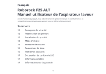 Français Roborock F25 ALT Manuel utilisateur de l'aspirateur laveur Avant d’utiliser ce produit, lisez attentivement le présent manuel et ses illustrations et rangez-le soigneusement pour pouvoir vous y référer ultérieurement. Sommaire 11 Consignes de sécurité 12 Présentation du produit 12 Installation du produit 13 Mode d’emploi 14 Entretien de routine 16 Paramètres de base 16 Problèmes courants 17 Déclaration de conformité UE 17 Informations WEEE 17 Informations sur la garantie 10 Consignes de sécurité Limitations d’utilisation • N’utilisez pas cet aspirateur à l’extérieur ou dans des environnements commerciaux ou industriels. Il est uniquement destiné à un usage domestique. • Ne rangez pas l’aspirateur dans une voiture afin d’éviter que des températures hautes ou basses n’affectent la durée de vie de sa batterie. • Le bloc batterie de cet aspirateur ne peut pas être utilisé pour un chargement ou un déchargement dans les environnements présentant une humidité élevée ou des températures inférieures à 4 °C (39 °F) ou supérieures à 40 °C (104°F). • Utilisez la brosse d’entretien avec précaution pour éviter toute blessure. Gardez hors de portée des enfants. • Les enfants doivent être surveillés pour éviter qu’ils ne s’amusent avec l’appareil. • Cet appareil ne doit pas être utilisé par des enfants ou des personnes handicapées sur le plan physique, sensoriel ou mental, ou qui manquent d’expérience et de savoir-faire, sauf si ces personnes l’utilisent sous la supervision ou la direction d’une personne responsable de leur sécurité (CB). • Cet appareil peut être utilisé par des enfants de 8 ans ou plus ou par des personnes handicapées sur le plan physique, sensoriel ou mental, ou qui manquent d’expérience et de savoir-faire, si ces personnes l’utilisent sous la supervision ou la direction d’une personne responsable de leur sécurité et si elles comprennent les risques possibles et comment utiliser l’appareil en toute sécurité. Les enfants ne doivent pas jouer avec l’appareil. Les enfants ne doivent pas procéder sans surveillance au nettoyage et à la maintenance de l’appareil (UE). • Évitez que les ouvertures et les pièces amovibles de l’aspirateur n’entrent en contact avec des cheveux ou des poils, des vêtements amples, des doigts et d’autres parties du corps. • Éloignez les membres (bras et jambes) et les animaux domestiques des têtes de brosse rotatives pour éviter toute blessure. • Ne touchez pas au câble d’alimentation et ne faites pas fonctionner le produit avec les mains mouillées afin d’éviter les blessures. • N’aspirez pas de substances brûlantes ou fumantes (comme des mégots de cigarettes non éteints). • N’aspirez pas des objets durs ou pointus (comme les matériaux de construction, le verre et les clous). • Ce produit doit être utilisé uniquement dans des zones situées à moins de 3 000 mètres au-dessus du niveau de la mer. • Lors de l’auto-nettoyage et du séchage, la température des surfaces accessibles de la station de rechargement, du rouleau et de l’aspirateur sera élevée. Veuillez ne pas toucher les surfaces susceptibles de devenir chaudes pendant l’utilisation. Ne touchez ces surfaces qu’une fois refroidies. • N’aspirez pas les cordons ou autres câbles pour éviter tout danger. • Veuillez utiliser ce produit selon les instructions fournies dans le manuel utilisateur. Les utilisateurs sont responsables de tous les dégâts ou pertes causés par une utilisation inappropriée de ce produit Batterie et rechargement AVERTISSEMENT • Ne rechargez pas de batteries non rechargeables. • Ce produit contient des batteries dont le remplacement doit être exclusivement effectué par des personnes formées à cet effet. • Pour recharger la batterie, utilisez uniquement l’alimentation électrique amovible Roborock MDS14HRR fournie avec ce produit. • N’utilisez ni batterie, ni câble d’alimentation, ni station de tierce partie. • Pour réduire le risque de blessure par des pièces mobiles, éteignez l’appareil avant de l’entretenir. 11 • Ne démontez pas, ne réparez pas et ne modifiez pas la batterie, le câble d’alimentation ou la station. • Ne rechargez pas l’aspirateur et n’installez pas la station près d’une source de chaleur ou dans un endroit humide (radiateurs ou salles de bains). • N’essuyez pas le câble d’alimentation ou la station avec un chiffon humide ; ne les touchez pas si vos mains sont humides. • Si le cordon d’alimentation est endommagé ou rompu, cessez immédiatement l’utilisation et contactez le service après-vente. • Si le produit ne doit pas être utilisé pendant une période prolongée, rechargez-le complètement, débranchez son alimentation et placez-le dans un endroit frais et sec. • Veillez à recharger l'appareil une fois tous les trois mois afin d’éviter un déchargement excessif de la batterie. • Ne jetez pas les batteries usagées. Confiez-les à un organisme professionnel de recyclage. Transport • Nous vous recommandons de transporter l’aspirateur dans son emballage d’origine. Remarque • Rincez le filtre au moins une fois par mois avec de l’eau du robinet. Pour plus de détails, reportezvous à la rubrique Entretien de routine. A Présentation du produit A1 Aspirateur —Changement de mode • Appuyer : basculer entre les modes AUTO/MAX/ÉCO/Éponge • Maintenir enfoncé pendant 2 secondes pendant la veille : activer/ désactiver les messages vocaux/ régler le volume • Maintenir enfoncé pendant 2 secondes pendant la charge : passer en mode Séchage silencieux/ Séchage rapide —Alimentation • Appuyer : démarrer/mettre en pause • Maintenir enfoncé pendant 2 secondes pendant la veille : mettre hors tension —Auto-nettoyage • Appuyer pendant la charge : démarrer/ mettre en pause l'auto-nettoyage • Maintenir 