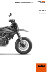 MANUEL D'UTILISATION 2022 690 SMC R Réf. 3214530fr CHER CLIENT KTM, Permettez-nous de vous féliciter sincèrement d'avoir porté votre choix sur une moto KTM. Vous êtes désormais propriétaire d'un véhicule moderne et sportif qui vous satisfera longtemps si vous l'entretenez de façon appropriée. Nous vous souhaitons de toujours rouler en toute sécurité ! CHER CLIENT KTM, Inscrire ci-dessous les numéros de série de votre véhicule. Numéro d’identification du véhicule ( Numéro de moteur ( Numéro de clé ( p. 14) Cachet du concessionnaire p. 15) p. 14) Le présent manuel d'utilisation correspond à l'état de la série concernée au moment de la publication. Cependant, des divergences minimes résultant de l'évolution technique ne sauraient être exclues. Toutes les informations du présent document sont fournies sans aucun engagement. La société KTM Sportmotorcycle GmbH se réserve le droit de modifier, de supprimer sans substitution ou d'adapter aux exigences locales les informations techniques, les tarifs, les couleurs, le design, les matériaux, les prestations de services et de maintenance, les constructions et les équipements ou autres, ainsi que d'arrêter définitivement la fabrication d'un certain modèle sans avis préalable ni indication d'un motif quelconque. KTM décline toute responsabilité en ce qui concerne les possibilités de livraison, les divergences au niveau des croquis et des descriptions, ainsi que les fautes d'impression et les erreurs. Les modèles reproduits dans le présent document sont partiellement pourvus d'équipements spéciaux ne faisant pas partie de l'équipement de série. © 2024 KTM Sportmotorcycle GmbH, Mattighofen Autriche Tous droits réservés Toute reproduction, même partielle, est strictement interdite sans autorisation écrite de l'auteur. ISO 9001(12 100 6061) Conformément à la norme internationale de qualité ISO 9001, KTM utilise des standards d'assurance qualité permettant d'obtenir une qualité maximale du produit. Établi par : TÜV SÜD Management Service GmbH KTM Sportmotorcycle GmbH Stallhofnerstraße 3 5230 Mattighofen, Autriche Ce document est valable pour les modèles suivants : 690 SMC R EU (F9703V9) *3214530fr* 3214530fr 11.11.2024 SOMMAIRE SOMMAIRE 1 1.1 1.2 2 2.2 2.3 2.4 2.5 2.6 2.7 2.8 2.9 2.10 3.2 3.3 3.4 3.5 3.6 4.2 5.2 5.3 5.4 5.5 5.6 Vue avant gauche du véhicule (représentation simplifiée) ................ 12 Vue arrière droite du véhicule (représentation simplifiée) ................ 13 Numéro d’identification du véhicule .......................................... 14 Plaque signalétique.......................... 14 Numéro de clé ................................. 14 Numéro de moteur ........................... 15 Référence de la fourche.................... 15 Référence de l'amortisseur................ 15 ÉLÉMENTS DE COMMANDE ........................ 16 6.1 6.2 6.3 6.4 6.5 6.6 6.7 6.8 6.9 2 Garantie du fabricant, garantie légale ............................................. 10 Carburants, lubrifiants ou produits aux spécifications de même nature et produits auxiliaires ....................... 10 Pièces détachées, accessoires techniques ...................................... 10 Entretien......................................... 10 Illustrations ..................................... 10 Service après-vente .......................... 11 NUMÉROS DE SÉRIE .................................. 14 5.1 6 Définition de l'application - utilisation conforme à l'usage prévu .................... 6 Mauvaise utilisation ........................... 6 Consignes de sécurité......................... 6 Niveaux de danger et symboles............ 6 Avertissement contre les manipulations.................................... 7 Fonctionnement en toute sécurité........ 7 Vêtements de protection ..................... 8 Règles de travail ................................ 8 Environnement .................................. 8 Manuel d'utilisation............................ 9 VUE DU VÉHICULE ..................................... 12 4.1 5 Symboles utilisés ............................... 5 Conventions typographiques utilisées ... 5 REMARQUES IMPORTANTES ...................... 10 3.1 4 Contacteur et antivol de direction ...... 18 Aperçu des témoins.......................... 19 Déverrouillage de la selle .................. 19 Poignées de retenue ......................... 20 Repose-pieds passager ..................... 20 Sélecteur ........................................ 20 Pédale de frein arrière ...................... 21 Béquille latérale .............................. 21 Ouvrir le bouchon du réservoir de carburant ........................................ 21 6.19 Fermer le bouchon du réservoir de carburant ........................................ 22 6.20 Tableau de bord............................... 22 6.20.1 Vue d'ensemble ........................... 22 6.20.2 Activation et test ......................... 23 6.20.3 Régler le tableau de bord.............. 23 6.20.4 Régler l'unité kilomètres/miles ...... 23 6.20.5 Régler l'heure .............................. 24 6.20.6 Régler l'intervalle d'entretien......... 24 6.20.7 Distance parcourue 1 ................... 25 6.20.8 Distance parcourue 2 ................... 25 6.20.9 Vitesse moyenne 1 ....................... 25 6.20.10 Vitesse moyenne 2 ....................... 26 6.20.11 Temps écoulé 1 ........................... 26 6.20.12 Temps écoulé 2 ........................... 26 6.20.13 Compteur d'heures d'utilisation ..... 27 6.20.14 Heure ......................................... 27 6.20.15 Affichage de l'intervalle d'entretien .................................. 27 6.20.16 Indicateur de régime .................... 27 6.20.17 Odomètre .................................... 28 6.20.18 Affichage des rapports.................. 28 6.20.19 Témoin d’entretien....................... 28 6.20.20 Distance parcourue sur la réserve de carburan