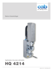Notice d'assemblage Applicateur de pose orientable HQ 4214 MADE IN GERMANY 2 Notice d'assemblage pour les produits suivants 2 Famille Modèle Applicateur de pose orientable HQ 4214L-200 HQ 4214L-300 HQ 4214L-400 HQ 4214R-200 HQ 4214R-300 HQ 4214R-400 Édition : 12/2024 - Réf. article : 9004136 Droits d'auteurs Cette documentation ainsi que sa traduction sont la propriété de cab Produkttechnik GmbH & Co KG. Tout usage, représentation, reproduction ou traduction de ce manuel, intégral ou partiel à d'autres fins que celles initialement prévues, nécessite au préalable une autorisation écrite de cab. Rédaction Pour vos questions ou suggestions veuillez vous adresser à cab Produkttechnik GmbH & Co KG. Traduction française Ce document est traduit depuis l'original en langue allemande. cab technologies ne peut être tenue pour responsable pour toute interprétation erronée de sa forme ou de son contenu. Actualité Par l'évolution permanente, des différences peuvent survenir entre la documentation et le matériel. Consulter le site internet www.cab.de pour obtenir la dernière version. Conditions générales Les livraisons et prestations sont soumises aux « Conditions Générales de Vente » de cab. Allemagne cab Produkttechnik GmbH & Co KG Karlsruhe Tel. +49 721 6626 0 www.cab.de USA cab Technology, Inc. Chelmsford, MA Tel. +1 978 250 8321 www.cab.de/us Taïwan cab Technology Co., Ltd. Taipei Tel. +886 (02) 8227 3966 www.cab.de/tw Singapour cab Singapore Pte. Ltd. Singapour Tel. +65 6931 9099 www.cab.de/en France cab Technologies S.à.r.l. Niedermodern Tel. +33 388 722501 www.cab.de/fr Mexique cab Technology, Inc. Juárez Tel. +52 656 682 4301 www.cab.de/es Chine cab (Shanghai) Trading Co., Ltd. Shanghai Tel. +86 (021) 6236 3161 www.cab.de/cn Afrique du sud cab Technology (Pty) Ltd. Randburg Tel. +27 11 886 3580 www.cab.de/za Table des matières 1 1.1 1.2 1.3 1.4 1.5 Introduction............................................................................................................................................. 4 Instructions................................................................................................................................................ 4 Usage prévu.............................................................................................................................................. 4 Consignes de sécurité............................................................................................................................... 4 Étiquetage de sécurité.............................................................................................................................. 5 Environnement.......................................................................................................................................... 5 2 2.1 2.2 2.3 2.4 Description du produit............................................................................................................................ 6 Détails importants..................................................................................................................................... 6 Données techniques................................................................................................................................. 6 Vue d'ensemble......................................................................................................................................... 7 Livraison.................................................................................................................................................... 8 3 3.1 3.2 3.3 3.4 3.5 3.5.1 3.5.2 3.5.3 3.6 Montage................................................................................................................................................... 9 Retrait de la sécurité de transport........................................................................................................... 10 Montage de la buse de soufflage............................................................................................................ 10 Réglage de la buse de soufflage (air de maintien)...................................................................................11 Montage de la semelle.............................................................................................................................11 Positionnement de la semelle................................................................................................................. 12 Déplacement de la semelle dans le sens Y....................................................................................... 13 Déplacement de la semelle dans le sens Z....................................................................................... 14 Déplacement de la semelle dans le sens X...................................................................................... 15 Positionnement de la butée en mode soufflage...................................................................................... 16 4 4.1 4.2 4.3 Fonctionnement.................................................................................................................................... 17 Mode normal........................................................................................................................................... 17 Entretien.................................................................................................................................................. 17 Mouvement de la semelle....................................................................................................................... 18 5 5.1 5.2 Configuration......................................................................................................................................... 19 Réglages dans le menu de l'imprimante..............................................................................................