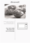 INSTRUCTIONS UTILISATEUR FR INSTRUCTIONS USER EN MANUAL DE INSTRUCCIONES ES Four micro-ondes Microwave oven Horno microondas FRANÇAIS 1 1.1 XXXXXXXXX SERVICE: XXXXXXXXX TYPE: XXXXX XXXXXXXXX Nr XX XX XXXX XXXXXXXXX XXXXX XXX XXXX CC XXXXX 1.2 3.5 x 9.5 mm x2 5 x1 x1 4 x 13 mm x2 0 10 0 55 100 380 390 600 12 0 380 23 540.5 390 1 850 33 5 592 100 FRANÇAIS 1 1.3 (x 2) 3.5 x 9.5 mm (x 2) 4 x 13 mm X mm X mm 1 mm 2 mm 3 mm X mm FRANÇAIS Chère Cliente, Cher Client, BVCert.6011825 Vous venez d’acquérir un produit BRANDT et nous vous remercions de la confiance que vous nous accordez. Nous avons conçu et fabriqué ce produit en pensant à vous, à votre mode de vie, à vos besoins, pour qu’il réponde au mieux à vos attentes. Nous y avons mis notre savoir-faire, notre esprit d’innovation et toute la passion qui nous anime depuis plus de 60 ans. Dans un souci permanent de toujours mieux satisfaire vos exigences, notre service consommateurs est à votre disposition et à votre écoute pour répondre à toutes vos questions ou suggestions. Connectez-vous aussi sur notre site www.brandt.com où vous trouverez nos dernières innovations, ainsi que des informations utiles et complémentaires. BRANDT est heureux de vous accompagner au quotidien et vous souhaite de profiter pleinement de votre achat. Le label « Origine France Garantie » assure au consommateur la traçabilité d’un produit en donnant une indication de provenance claire et objective. La marque BRANDT est fière d’apposer ce label sur les produits issus de nos usines françaises basées à Orléans et Vendôme. http://www.brandt.com/ Important : Avant de mettre votre appareil en marche, veuillez lire ­attentivement ce guide d’installation et d’utilisation afin de vous ­familiariser plus rapidement avec son fonctionnement. FRANÇAIS Instructions de sécurité INSTRUCTIONS DE SÉCURITÉ IMPORTANTES LIRE AVEC ­ATTENTION ET GARDER POUR DE FUTURES UTILISATIONS. Cette notice est disponible en téléchargement sur le site internet de la marque. Important : Avant de mettre votre appareil en marche, veuillez lire attentivement ce guide d’installation afin de vous familiariser plus rapidement avec son fonctionnement. Conservez cette notice d’utilisation avec votre appareil. Si l’appareil devait être vendu ou cédé à une autre personne, assurez-vous que la notice d’utilisation l’accompagne. Merci de prendre connaissance de ces conseils avant d’installer et d’utiliser votre appareil. Ils ont été rédigés pour votre sécurité et celle d’autrui. — Cet appareil est destiné à être utilisé dans des applications domestiques et analogues telles que: les coins cuisines réservés au personnel des magasins, bureaux et autres environnements professionnels; les fermes; l’utilisation par les clients des hôtels, motels et autres environnements à caractère résidentiel; les environnements de type chambre d’hôtes. — Cet appareil peut être utilisé par des enfants âgés de 8 ans et plus, et par des personnes aux capacités physiques, sensorielles ou mentales réduites, ou dénuées d’expérience et de connaissance, si elles ont pu bénéficier d’une surveillance ou d’instructions préalables concernant l’utilisation de l’appareil de façon sûre et en ont compris les risques encourus. Les enfants ne doivent pas jouer avec l’appareil. Les opérations de nettoyage et de maintenance ne doivent pas être faites par des enfants laissés sans surveillance. — Il convient de surveiller les enfants pour s’assurer qu’ils ne jouent pas avec l’appareil. MISE EN GARDE : L’appareil et ses parties accessibles deviennent chaudes au cours de l’utilisation. Faire attention à ne pas toucher les éléments chauffants. Les enfants de moins de 8 ans doivent être tenus à l’écart à moins qu’ils ne soient surveillés en permanence. Il est dangereux pour quiconque autre qu’une personne compétente d’effectuer des opérations de maintenance ou de réparation entraînant le retrait d’un couvercle qui protège de l’exposition à l’énergie micro-ondes. Les liquides et autres aliments ne doivent pas être chauffés dans des récipients fermés hermétiquement car ils risquent d’exploser. Si l’appareil fonctionne en mode combiné, il est recommandé que les enfants n’utilisent le four que FRANÇAIS Instructions de sécurité sous la surveillance d’adultes en raison des températures générées. — Les récipients métalliques pour aliments et boissons ne sont pas admis lors de la cuisson par micro-ondes. — Veiller à ne pas déplacer le plateau rotatif lors du retrait des récipients de l'appareil. — N’utiliser que des ustensiles appropriés à l’usage dans les fours micro-ondes. — Pendant le chauffage de denrées alimentaires dans des contenants en plastique ou en papier, gardez un œil sur le four en raison de la possibilité d’inflammation. — Si de la fumée apparaît, arrêtez ou débranchez le four et gardez la porte fermée pour étouffer les flammes éventuelles. — Le chauffage des boissons par micro-ondes peut provoquer un jaillissement brusque et différé de liquide en ébullition, pour cette raison des précautions doivent elles être prises lors de la manipulation du récipient. — Le contenu des biberons et des pots d’aliments pour bébé doit être remué ou agité et la température doit en être vérifiée avant consommation, de façon à éviter les brûlures. — Il n’est pas recommandé de chauffer les œufs dans leur coquille et les œufs durs entiers dans un four micro-ondes car ils risquent d’exploser, même après la fin de cuisson. — Cet appareil est conçu pour faire des cuissons porte fermée. — Le four à micro-ondes est prévu pour chauffer des denrées alimentaires et des boissons. Le séchage de denrées alimentaires ou de linge et le chauffage de coussins chauffants, pantoufles, éponges, linge humide et autres articles sim