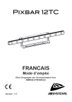 Pixbar 12TC FRANCAIS Mode d’emploi Other languages can be downloaded from: WWW.JB-SYSTEMS.EU Version: 1.0 FRANÇAIS GUIDE D’UTILISATION GUIDE D'UTILISATION Nous vous remercions d'avoir acheté ce produit JB SYSTEMS® . Pour profiter pleinement de toutes les possibilités et pour votre propre sécurité, veuillez lire très attentivement ce mode d'emploi avant de commencer à utiliser cet appareil. CARACTÉRISTIQUES • Barre lumineuse couleur avec 12 LED RGB 3W et contrôle individuel des pixels • Angle du faisceau = 23°. • L'outil idéal pour les DJ et les clubs, mais aussi pour une utilisation sur scène ! • Différentes options de contrôle : • Contrôle DMX complet via 3, 4, 5, 8, 36, 39, 41 canaux. • Peut être utilisé avec le contrôleur Ledcon-XL. (motifs de poursuite = 4 groupes de 3 Led) • De nombreux programmes automatiques intégrés. • Mode activé par le son avec microphone interne. • Mode maître/esclave pour les configurations plus importantes • Télécommande IR sans fil incluse • Préparé pour le DMX sans fil : il suffit de brancher un DONGLE WTR-DMX optionnel (code Briteq® : B04645). AVANT UTILISATION • Avant de commencer à utiliser cet appareil, vérifiez qu'il n'a pas été endommagé pendant le transport. Si c'est le cas, n'utilisez pas l'appareil et consultez d'abord votre revendeur. • Important : Cet appareil a quitté notre usine en parfait état et bien emballé. Il est absolument nécessaire que l'utilisateur suive scrupuleusement les consignes de sécurité et les avertissements figurant dans ce manuel d'utilisation. Tout dommage causé par une mauvaise manipulation n'est pas couvert par la garantie. Le revendeur n'acceptera aucune responsabilité pour tout défaut ou problème résultant du nonrespect de ce manuel d'utilisation. • Conservez ce livret en lieu sûr pour pouvoir le consulter ultérieurement. Si vous vendez le projecteur, n'oubliez pas d'ajouter ce manuel d'utilisation. Vérifier le contenu : Vérifiez que l'emballage contient les éléments suivants : • Mode d'emploi • PIXBAR 12TC • Télécommande IR • Câble d'alimentation INSTRUCTIONS DE SECURITE : ATTENTION : Pour réduire le risque d'électrocution, ne pas retirer le couvercle supérieur. L'appareil ne contient aucune pièce réparable par l'utilisateur. Confier l'entretien de l'appareil à un personnel qualifié uniquement. Le symbole de l'éclair avec une flèche à l'intérieur d'un triangle équilatéral est destiné à avertir de l'utilisation ou de la présence d'une "tension dangereuse" non isolée à l'intérieur de l'appareil qui peut être d'une magnitude suffisante pour constituer un risque d'électrocution. JB SYSTEMS® 1/15 PIXBAR 12TC FRANÇAIS GUIDE D’UTILISATION Le point d'exclamation dans le triangle équilatéral a pour but d'alerter l'utilisateur sur la présence d'instructions importantes relatives au fonctionnement et à l'entretien de cet appareil dans la documentation qui l'accompagne. Ce symbole signifie : utilisation à l'intérieur uniquement. Ce symbole signifie : Lire les instructions. Ce symbole détermine la distance minimale à respecter par rapport aux objets éclairés. La distance minimale entre la sortie de la lumière et la surface éclairée doit être supérieure à 0,1 mètre. L'appareil ne convient pas au montage direct sur des surfaces normalement inflammables. (convient uniquement au montage sur des surfaces non combustibles) ATTENTION : Ne pas fixer la lampe de travail. Peut être nocif pour les yeux. • Pour protéger l'environnement, essayez de recycler les matériaux d'emballage autant que possible. • Pour éviter tout risque d'incendie ou d'électrocution, n'exposez pas cet appareil à la pluie ou à l'humidité. • Pour éviter la formation de condensation à l'intérieur de l'appareil, laissez-le s'adapter aux températures environnantes en le plaçant dans une pièce chaude après le transport. La condensation empêche parfois l'appareil de fonctionner à plein rendement ou peut même l'endommager. • Cet appareil ne peut être utilisé qu'à l'intérieur. • Ne placez pas d'objets métalliques et ne renversez pas de liquide à l'intérieur de l'appareil. Vous risqueriez de vous électrocuter ou de provoquer un dysfonctionnement. Si un objet étranger pénètre dans l'appareil, débranchez immédiatement l'appareil. • Placez le projecteur dans un endroit bien ventilé, à l'écart de tout matériau et/ou liquide inflammable. L'appareil doit être fixé à au moins 50 cm des murs environnants. • Ne couvrez pas les ouvertures de ventilation, car cela pourrait entraîner une surchauffe. • Évitez d'utiliser l'appareil dans des environnements poussiéreux et nettoyez-le régulièrement. • Tenir l'appareil hors de portée des enfants. • Les personnes inexpérimentées ne doivent pas utiliser cet appareil. • La température ambiante maximale de sécurité est de 40°C. N'utilisez pas cet appareil à des températures ambiantes plus élevées. • Veillez à ce que la zone située sous le lieu d'installation ne soit pas occupée par des personnes indésirables pendant le montage, le démontage et l'entretien. • Laissez l'appareil refroidir pendant environ 10 minutes avant de commencer l'entretien. • Débranchez toujours l'appareil lorsqu'il n'est pas utilisé pendant une période prolongée ou avant de commencer l'entretien. • L'installation électrique doit être effectuée par des personnes qualifiées, conformément aux règles de sécurité électrique et mécanique en vigueur dans votre pays. • Vérifier que la tension disponible n'est pas supérieure à celle indiquée sur l'appareil. • Le cordon d'alimentation doit toujours être en parfait état. Éteignez immédiatement l'appareil si le cordon d'alimentation est écrasé ou endommagé. Il doit être remplacé par le fabricant, son agent de service ou des personnes de qualification similaire afin d'éviter tout danger. 