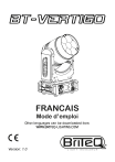 FRANCAIS Mode d’emploi Other languages can be downloaded from: WWW.BRITEQ-LIGHTING.COM Version: 1.0 GUIDE D'UTILISATION V1.0 FRANÇAIS GUIDE D'UTILISATION Nous vous remercions d'avoir acheté ce produit Briteq® . Pour profiter pleinement de toutes les possibilités et pour votre propre sécurité, veuillez lire très attentivement ce mode d'emploi avant de commencer à utiliser cet appareil. CARACTÉRISTIQUES • BT-VERTIGO est une petite et très puissante lyre wash. • Basé sur une source lumineuse LED RGBL de 7x60W. • Rendement lumineux très élevé : 11555 lux @5m (4° ) - 201 lux @5m (45°) • Parfait pour des effets de mouvement rapides et une belle lumière wash • Zoom électronique 16 bits à large plage, de 4° à 45 .° • Préréglages CCT de haute qualité : 2700K → 8000K (IRC >80) • Stroboscope précis avec effets aléatoires, pulsations et rafales intégrés. • Gradateur 16 bits avec mode de gradation rapide et lent. • Deux courbes de gradation : linéaire, carrée • Mouvements pan/tilt/zoom 16 bits ultra rapides avec correction de position et canal de vitesse pan/tilt. • Mode ventilateur silencieux pour les applications dans les théâtres. • Utilise 17, 23 ou 21 canaux DMX + fonction RDM pour une configuration à distance facile. • L'écran LCD matriciel permet une navigation aisée dans les différents menus de configuration. • Entrées/sorties DMX 5 broches + compatible PowerCON TRUE1 • Entrées/sorties DMX compatibles avec le kit BT-XLR5TO3 • Équipé d'un support oméga pour une installation rapide. AVANT UTILISATION • Avant de commencer à utiliser cet appareil, vérifiez qu'il n'a pas été endommagé pendant le transport. Si c'est le cas, n'utilisez pas l'appareil et consultez d'abord votre revendeur. • Important : Cet appareil a quitté notre usine en parfait état et bien emballé. Il est nécessaire que l'utilisateur respecte scrupuleusement les consignes de sécurité et les avertissements figurant dans ce manuel d'utilisation. Tout dommage causé par une mauvaise manipulation n'est pas couvert par la garantie. Le revendeur n'acceptera aucune responsabilité pour tout défaut ou problème résultant du non-respect de ce manuel d'utilisation. • Conservez ce livret en lieu sûr pour pouvoir le consulter ultérieurement. Si vous vendez le projecteur, n'oubliez pas d'ajouter ce manuel d'utilisation. Vérifier le contenu : Vérifiez que le carton contient les éléments suivants : • BT-VERTIGO • PowerCON® Câble secteur compatible TRUE-1 • 1 support BriteQ omega BIG (support compatible) • Câble de sécurité • Mode d'emploi BRITEQ® 1/15 BT-VERTIGO GUIDE D'UTILISATION V1.0 FRANÇAIS INSTRUCTIONS DE SÉCURITÉ ATTENTION : Pour réduire le risque d'électrocution, ne pas retirer le couvercle supérieur. L'appareil ne contient aucune pièce réparable par l'utilisateur. Confier l'entretien de l'appareil à un personnel qualifié uniquement. Le symbole de l'éclair avec une flèche à l'intérieur d'un triangle équilatéral est destiné à avertir de l'utilisation ou de la présence d'une "tension dangereuse" non isolée à l'intérieur de l'appareil qui peut être d'une magnitude suffisante pour constituer un risque d'électrocution. Le point d'exclamation dans le triangle équilatéral a pour but d'alerter l'utilisateur sur la présence d'instructions importantes relatives au fonctionnement et à l'entretien de cet appareil dans la documentation qui l'accompagne. Ce symbole signifie : réparez les lentilles cassées ! Ce symbole signifie : Ne pas fixer la source lumineuse en fonctionnement Ce symbole signifie : Lire les instructions Ce symbole détermine la distance minimale à respecter par rapport aux objets éclairés. La distance minimale entre la sortie de la lumière et la surface éclairée doit être supérieure à 0,2 mètre. • Pour protéger l'environnement, essayez de recycler les matériaux d'emballage autant que possible. • Un nouvel effet lumineux provoque parfois une fumée et/ou une odeur indésirable. Ce phénomène est normal et disparaît après quelques minutes. • Pour éviter tout risque d'incendie ou d'électrocution, n'exposez pas cet appareil à la pluie ou à l'humidité. • Pour éviter la formation de condensation à l'intérieur de l'appareil, laissez-le s'adapter aux températures environnantes en le plaçant dans une pièce chaude après le transport. La condensation empêche parfois l'appareil de fonctionner à plein rendement ou peut même l'endommager. • Ne placez pas d'objets métalliques et ne renversez pas de liquide à l'intérieur de l'appareil. Vous risqueriez de vous électrocuter ou de provoquer un dysfonctionnement. Si un objet étranger pénètre dans l'appareil, débranchez immédiatement l'appareil. • Placez le projecteur dans un endroit bien ventilé, à l'écart de tout matériau et/ou liquide inflammable. L'appareil doit être fixé à au moins 20 cm des murs environnants. • Ne couvrez pas les ouvertures de ventilation, car cela pourrait entraîner une surchauffe. • Ne pas utiliser l'appareil dans des environnements poussiéreux et le nettoyer régulièrement. • Tenir l'appareil hors de portée des enfants. • Les personnes inexpérimentées ne doivent pas utiliser cet appareil. • La température ambiante maximale de sauvegarde est de 40°C. N'utilisez pas cet appareil à des températures ambiantes plus élevées. • La température de surface des appareils peut atteindre 85°C. Ne touchez pas le boîtier à mains nues pendant son fonctionnement. • Veillez à ce que la zone située sous le lieu d'installation ne soit pas occupée par des personnes indésirables pendant le montage, le démontage et l'entretien. • Laissez l'appareil refroidir pendant environ 10 minutes avant de remplacer l'ampoule ou de commencer l'entretien. • Débranchez toujours l'appareil lorsqu'il n'est pas utilisé pendant une période prolongée ou avant de remplacer l'