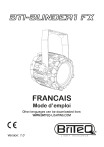 FRANCAIS Mode d’emploi Other languages can be downloaded from: WWW.BRITEQ-LIGHTING.COM Version: 1.0 FRANÇAIS GUIDE D'UTILISATION V1.0 GUIDE D'UTILISATION Nous vous remercions d'avoir acheté ce produit Briteq ® . Pour profiter pleinement de toutes les possibilités et pour votre propre sécurité, veuillez lire très attentivement ce mode d'emploi avant de commencer à utiliser cet appareil. CARACTÉRISTIQUES • Puissante LED blanche de 70W avec effet red shift, se comporte exactement comme une lampe halogène! • Effets Aura RGB 12W avec contrôle total des pixels et 25 effets préprogrammés à deux couches. • Boîtier ALU robuste moulé sous pression avec indice de protection IP65 ! • Options de montage mécanique extrêmement polyvalentes : • Utilisez les connecteurs SPLICE et votre imagination pour assembler mécaniquement plusieurs blinders en lignes, cercles, carrés, ... spectaculaires. • Utilisez les connecteurs CLAMP pour monter les constructions blinder directement dans la structure. • Utilisez un support oméga en option pour monter le projecteur avec un crochet de suspension dans la structure. • Effet de Amber Drift (red shift) préprogrammé et/ou commande séparée pour le blanc et l'ambre ! • CCT réglable : de 1650K à 2700K • 7 modes DMX, 8bit et 16bit : de 1 à 58ch • Canal de contrôle avec contrôle DMX à distance pour "red shift", vitesse/courbes des gradateurs, ordre des pixels, ... • Fonction RDM pour : mode de canal, adresse DMX, surveillance de la température, ... • Écran OLED avec touches tactiles rétroéclairées pour une configuration facile, même dans l'obscurité. • Aucun contrôleur dédié n'est nécessaire, le fonctionnement est entièrement autonome et la connexion en guirlande est aisée : • Entrée/sortie compatible PowerCON TRUE1 • Entrée/sortie XLR étanche à 5 broches • Un kit de modification est disponible en option (BT-XLR5TO3 KIT) pour modifier l'IP 5pin-XLR en 3pin-XLR. • Alimentation 100V~240V 50/60Hz intégrée. • Les connecteurs SPLICE et CLAMP sont disponibles en option ! AVANT UTILISATION • Avant de commencer à utiliser cet appareil, vérifiez qu'il n'a pas été endommagé pendant le transport. Si c'est le cas, n'utilisez pas l'appareil et consultez d'abord votre revendeur. • Important : Cet appareil a quitté notre usine en parfait état et bien emballé. Il est nécessaire que l'utilisateur respecte scrupuleusement les consignes de sécurité et les avertissements figurant dans ce manuel d'utilisation. Tout dommage causé par une mauvaise manipulation n'est pas couvert par la garantie. Le revendeur n'acceptera aucune responsabilité pour tout défaut ou problème résultant du non-respect de ce manuel d'utilisation. • Conservez ce livret en lieu sûr pour pouvoir le consulter ultérieurement. Si vous vendez le projecteur, n'oubliez pas d'ajouter ce manuel d'utilisation. Vérifier le contenu : Vérifiez que le carton contient les éléments suivants : • Guide d’utilisation • BT-BLINDER1 FX • Câble d'alimentation compatible PowerCON TRUE1 BRITEQ® 1/13 BTI-BLINDER1 FX FRANÇAIS GUIDE D'UTILISATION V1.0 INSTRUCTIONS DE SÉCURITÉ : ATTENTION : Pour réduire le risque d'électrocution, ne pas retirer le couvercle supérieur. L'appareil ne contient aucune pièce réparable par l'utilisateur. Confier l'entretien de l'appareil à un personnel qualifié uniquement. Le symbole de l'éclair avec une flèche à l'intérieur d'un triangle équilatéral est destiné à avertir de l'utilisation ou de la présence d'une "tension dangereuse" non isolée à l'intérieur de l'appareil qui peut être d'une magnitude suffisante pour constituer un risque d'électrocution. Le point d'exclamation dans le triangle équilatéral a pour but d'alerter l'utilisateur sur la présence d'instructions importantes relatives au fonctionnement et à l'entretien de cet appareil dans la documentation qui l'accompagne. Ce symbole signifie : Lire les instructions Ce symbole détermine la distance minimale à respecter par rapport aux objets éclairés. La distance minimale entre la sortie de la lumière et la surface éclairée doit être supérieure à x mètres. ATTENTION : Ne pas fixer la lampe de travail. Peut être nocif pour les yeux. • Pour protéger l'environnement, essayez de recycler les matériaux d'emballage autant que possible. • Pour éviter tout risque d'incendie ou d'électrocution, n'exposez pas cet appareil à la pluie ou à l'humidité. • Pour éviter la formation de condensation à l'intérieur de l'appareil, laissez-le s'adapter aux températures environnantes en le plaçant dans une pièce chaude après le transport. La condensation empêche parfois l'appareil de fonctionner à plein rendement ou peut même l'endommager. • Ne placez pas d'objets métalliques et ne renversez pas de liquide à l'intérieur de l'appareil. Vous risqueriez de vous électrocuter ou de provoquer un dysfonctionnement. Si un objet étranger pénètre dans l'appareil, débranchez immédiatement l'appareil. • Placez le projecteur dans un endroit bien ventilé, à l'écart de tout matériau et/ou liquide inflammable. L'appareil doit être fixé à au moins 50 cm des murs environnants. • Ne couvrez pas les ouvertures de ventilation, car cela pourrait entraîner une surchauffe. • Évitez d'utiliser l'appareil dans des environnements poussiéreux et nettoyez-le régulièrement. • Tenir l'appareil hors de portée des enfants. • Les personnes inexpérimentées ne doivent pas utiliser cet appareil. • La température ambiante maximale de sécurité est de 40°C. N'utilisez pas cet appareil à des températures ambiantes plus élevées. • Veillez à ce que la zone située sous le lieu d'installation ne soit pas occupée par des personnes indésirables pendant le montage, le démontage et l'entretien. • Laissez l'appareil refroidir pendant environ 10 minutes avant de commencer l'entretien. • Débranchez