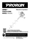 Manuel de l’opérateur AUGER DE TERRE MODÈLE : PEA281 Avant de fonctionner, lisez les instructions. IMPORTANT - LIRE ATTENTIVEMENT AVANT UTILISATION INSTRUCTIONS DE SÉCURITÉ IMPORTANTES - ENREGISTREZ CES INSTRUCTIONS AVERTISSEMENT : Pour réduire le risque de blessure, l’utilisateur doit lire et comprendre le manuel de l’opérateur avant d’utiliser ce produit. Conservez ces instructions pour référence ultérieure. S’il vous plaît laissez-nous savoir ce que vous pensez. Pour laisser un commentaire et voir notre gamme complète de produits, visitez : proruntech.com 1-844-905-0882, [email protected] Version : B - Date de parution : 2023/03/31 Table des matières Sécurité .......................................................2 Programme d’installation…………………………8 Fonctionnement ………...............................10 Entretien ...................................................13 Dépannage……………………………………………..17 Specification……………………………………………19 Liste des pièces et diagramme….…………….20 Garanties…………………………………….…..…..…23 Sécurité SYMBOLES D’AVERTISSEMENT ET DÉFINITIONS Il s’agit du symbole d’alerte à la sécurité. Il est utilisé pour vous alerter de les risques potentiels de blessures corporelles. Obéissez à tous les messages de sécurité qui suivent ce symbole pour éviter d’éventuelles blessures ou décès. DANGER Indique une situation dangereuse qui, si elle n’est pas évitée, entraînera la mort ou des blessures graves. AVERTISSEMENT Indique une situation dangereuse qui, si elle n’est pas évitée, pourrait entraîner la mort ou des blessures graves. MISE EN GARDE Indique une situation dangereuse qui, si elle n’est pas évitée, pourrait entraîner des blessures mineures ou modérées. AVIS Traite des pratiques qui ne sont pas liées aux blessures corporelles. MISE EN GARDE Définitions des symboles Symbole Propriété ou déclaration ATTENTION ! La tondeuse peut être dangereuse si elle est utilisée de manière incorrecte ou négligente, et peut causer des blessures graves ou mortelles à l’opérateur ou à d’autres personnes. Il est extrêmement important que vous lisiez et compreniez le contenu de ce manuel du propriétaire. ATTENTION ! Lisez le(s) manuel(s) de l’opérateur et suivez tous les avertissements et instructions de sécurité. Le défaut de le faire peut entraîner des blessures graves à l’exploitant et/ou aux passants. Portez toujours : • Un casque de protection où il y a un risque de chute d’objet • Méfiez-vous des objets jetés tels que le ricochet. Portez toujours une protection oculaire conforme à la norme ANSI Z87.1. Portez toujours une protection auditive lorsque vous utilisez la machine. Portez des bottes antidérapantes robustes. Page 02 Symbol Property or Statement Portez toujours des gants de protection approuvés. Le contact avec des câbles ou des fils électriques peut causer des blessures graves ou la mort à la suite d’un choc électrique. Frapper quelque chose de dur dans la terre, comme une roche ou du gravier, peut provoquer le ralentissement soudain ou l’arrêt de l’outil de forage. Dans une telle situation, une partie ou la totalité de la force de rotation (force réactive) est transférée à la tête de puissance et au cadre de poignée de la tarière de terre, ce qui peut provoquer la rotation soudaine de la tête de puissance et des poignées de la tarière dans le sens inverse des aiguilles d’une montre. Réservoir de mélange de carburant. Fermez l’étranglement. Ouvrez l’étranglement. H L T I O La vis sous le timbre « H » est la haute vitesse vis de réglage du mélange. La vis sous le timbre « L » est la basse vitesse vis de réglage du mélange. La vis vers le haut de l’estampille « T » est la vitesse de ralenti vis de réglage. Actionner l’interrupteur du moteur En actionnant l’interrupteur à la position « O », immédiatement le moteur s’arrête. Page 03 INSTRUCTION DE SÉCURITÉ IMPORTANTE ENREGISTREZ CES INSTRUCTIONS Ce manuel contient des instructions importantes à suivre pendant l’installation, le fonctionnement et l’entretien de la tarière en terre. Configurer les précautions 1.Le carburant à essence et les émanations sont inflammable et potentiellement explosif. Utiliser le stockage et la manipulation appropriés du carburant les procédures. Ne pas entreposer de carburant ou autre matériaux inflammables à proximité. organismes de lois ou de règlements en ce qui concerne la prévention des incendies les exigences. 4.Configurez et utilisez uniquement sur une surface plane, de niveau et bien ventilée. 2.Avoir plusieurs incendies de classe ABC extincteurs à proximité. 5.Porter une sécurité approuvée par l’ANSI lunettes de bas de travail, gants de travail robustes, et masque antipoussière/respirateur pendant l’utilisation. 3.Le fonctionnement de cet équipement peut créer des étincelles qui peuvent déclencher des incendies autour de la végétation sèche. 6. N’utilisez que des lubrifiants et du carburant Recommandé dans les spécifications de ce manuel. Un pare-étincelles peut être nécessaire. L’opérateur devrait entrer en contact avec le service d’incendie local Instructions générales de sécurité AVERTISSEMENT sans la permission du fabricant. 5.Utilisez toujours des accessoires authentiques. Les modifications et/ou accessoires non autorisés peuvent entraîner des blessures graves ou le décès de l’opérateur ou d’autres personnes. 6.Cette machine peut causer des blessures graves si elle est utilisée de manière incorrecte ou négligente, et peut causer des blessures graves ou mortelles à l’opérateur ou à d’autres personnes. Il est extrêmement important que vous lisiez et compreniez le contenu de ce manuel de l’opérateur. 7.Familiarisez-vous avec toutes les 