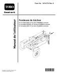 Form No. 3474-378 Rev A Fendeuse de bûches N° de modèle 22618—N° de série 410000000 et suivants N° de modèle 22618HD—N° de série 411000000 et suivants N° de modèle 23618—N° de série 412300000 et suivants Enregistrez votre produit à www.Toro.com. Traduction du texte d'origine (FR) *3474-378* Vous commettez une infraction à la section 4442 ou 4443 du Code des ressources publiques de Californie si vous utilisez cette machine dans une zone boisée, broussailleuse ou recouverte d'herbe, à moins d'équiper le moteur d'un pare-étincelles en bon état, tel que défini dans la section 4442, ou à moins que le moteur soit construit, équipé et entretenu correctement pour prévenir les incendies. bûches peut être tractée derrière un véhicule équipée d'une boule d'attelage appropriée. L'utilisation de ce produit à d'autres fins que celle prévue peut être dangereuse pour vous-même et toute personne à proximité. Lisez attentivement cette notice pour apprendre comment utiliser et entretenir correctement votre produit, et éviter ainsi de l'endommager ou de vous blesser. Vous êtes responsable de l'utilisation sûre et correcte du produit. Le manuel du propriétaire du moteur ci-joint est fourni à titre informatif concernant la réglementation de l'Agence américaine pour la protection de l'environnement (EPA) et la réglementation antipollution de l'état de Californie relative aux systèmes antipollution, à leur entretien et à leur garantie. Vous pouvez vous en procurer un nouvel exemplaire en vous adressant au constructeur du moteur. Rendez-vous sur www.Toro.com pour tout document de formation à la sécurité et à l'utilisation des produits, pour tout renseignement concernant un produit ou un accessoire, pour obtenir l'adresse des dépositaires ou pour enregistrer votre produit. Pour obtenir des prestations de service, des pièces Toro d'origine ou des renseignements complémentaires, munissez-vous des numéros de modèle et de série du produit et contactez un dépositaire-réparateur ou le service client Toro agréé. La Figure 1 indique l'emplacement des numéros de modèle et de série du produit. Inscrivez les numéros dans l'espace réservé à cet effet. Le numéro d'identification DOT est indiqué de chaque côté du pneu. Cette information indique les classes de charge et de vitesse. Les pneus de rechange doivent être de spécifications égales ou supérieures; reportez-vous à Caractéristiques techniques (page 9) pour vérifier que les pneus de la machine respectent ou dépassent les spécifications de poids de la machine. Important: Avec votre appareil mobile, vous pouvez scanner le code QR sur l'autocollant du numéro de série (le cas échéant) pour accéder à l'information sur la garantie, les pièces détachées et autres renseignements concernant le produit. ATTENTION CALIFORNIE Proposition 65 - Avertissement Les gaz d'échappement de ce produit contiennent des substances chimiques considérées par l'état de Californie comme susceptibles de provoquer des cancers, des malformations congénitales et autres troubles de la reproduction. L'utilisation de ce produit peut entraîner une exposition à des substances chimiques considérées pas l'état de Californie comme capables de provoquer des cancers, des anomalies congénitales ou d'autres troubles de la reproduction. g243187 Figure 1 1. Emplacement des numéros de modèle et de série Introduction N° de modèle Cette machine est conçue pour fendre des bûches de bois coupées à une taille appropriée pour passer dans l'ouverture du coin de fendage de la machine. Elle peut fonctionner en position horizontale ou verticale. Elle n'est pas prévue pour fendre la pierre, le métal ou tout autre matériau que le bois. La fendeuse de © 2025—The Toro® Company 8111 Lyndale Avenue South Bloomington, MN 55420 N° de série Les mises en garde de ce manuel soulignent des dangers potentiels et sont signalées par le symbole de sécurité (Figure 2), qui indique un danger pouvant 2 Contactez-nous sur www.Toro.com. Imprimé aux États-Unis Tous droits réservés Table des matières entraîner des blessures graves ou mortelles si les précautions recommandées ne sont pas respectées. Sécurité .................................................................... 4 Consignes de sécurité générales........................ 4 Autocollants de sécurité et d'instruction .............. 5 Vue d'ensemble du produit ........................................ 8 Commandes ...................................................... 8 Commandes du moteur................................... 8 Caractéristiques techniques .............................. 9 Avant l'utilisation .................................................. 10 Consignes de sécurité avant l'utilisation............ 10 Ajout de carburant ............................................ 10 Avant d'utiliser la machine ................................ 12 Pendant l'utilisation ............................................. 12 Consignes de sécurité pendant l'utilisation ..................................................... 12 Démarrage du moteur....................................... 13 Arrêt du moteur................................................. 14 Changement de la position du rail de guidage ......................................................... 14 Fendage d'une bûche ....................................... 15 Après l'utilisation ................................................. 16 Consignes de sécurité après l'utilisation............ 16 Consignes de sécurité relatives au remorquage .................................................. 16 Remorquage de la machine .............................. 17 Entretien ................................................................. 20 Consignes de sécurité pendant l'entretien ...................................................... 20 Programme d'entretien recommandé .................. 20 Procédures ava