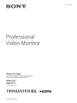 4-688-645-24(1) Professional Video Monitor Mode d’emploi Avant d’utiliser l’appareil, veuillez lire attentivement ce manuel et le conserver pour future référence. BVM-E251 BVM-E171 Logiciel Version 1.2 © 2016 Sony Corporation AVERTISSEMENT Afin de réduire les risques d’incendie ou d’électrocution, ne pas exposer cet appareil à la pluie ou à l’humidité. Afin d’écarter tout risque d’électrocution, garder le coffret fermé. Ne confier l’entretien de l’appareil qu’à un personnel qualifié. CET APPAREIL DOIT ÊTRE RELIÉ À LA TERRE. AVERTISSEMENT Lors de l’installation de l’appareil, incorporer un dispositif de coupure dans le câblage fixe ou brancher la fiche d’alimentation dans une prise murale facilement accessible proche de l’appareil. En cas de problème lors du fonctionnement de l’appareil, enclencher le dispositif de coupure d’alimentation ou débrancher la fiche d’alimentation. AVERTISSEMENT Eviter d’exposer l’appareil à un égouttement ou à des éclaboussures. Ne placer aucun objet rempli de liquide, comme un vase, sur l’appareil. ATTENTION Cet appareil n’est pas déconnecté de la source d’alimentation secteur tant qu’il est raccordé à la prise murale, même si l’appareil lui-même a été mis hors tension. AVERTISSEMENT Cet équipement ne convient pas aux endroits où des enfants sont susceptibles d’être présents. La ventilation ne doit pas être entravée en couvrant les fentes d'aération par des objets tels que des journaux, nappes, rideaux ou autre. Aucune source de flamme nue, tel que des bougies, ne doit être placée sur l'appareil. AVERTISSEMENT 1. Utilisez un cordon d’alimentation (câble secteur à 3 fils)/fiche femelle/fiche mâle avec des contacts de mise à la terre conformes à la réglementation de sécurité locale applicable. 2. Utilisez un cordon d’alimentation (câble secteur à 3 fils)/fiche femelle/fiche mâle avec des caractéristiques nominales (tension, ampérage) appropriées. Pour toute question sur l’utilisation du cordon d’alimentation/fiche femelle/fiche mâle ci-dessus, consultez un technicien du service après-vente qualifié. Pour les clients au Canada CAN ICES-3 (A)/NMB-3(A) 2 Pour les clients en Europe Ce produit est prévu pour être utilisé dans l’environnement électromagnétique suivant: E4 (environnement EMC contrôlé, ex. studio de télévision). Ne pas utiliser cet appareil dans une zone résidentielle. Pour les clients en Europe, Australie et NouvelleZélande AVERTISSEMENT Cet appareil est conforme à la Classe A de CISPR 32. Dans un environnement domestique, cet appareil peut provoquer des interférences radio. Pour les clients au Canada GARANTIE LIMITÉE DE SONY - Rendez-vous sur www.sony.com/psa/warranty pour obtenir les informations importantes et l’ensemble des termes et conditions de la garantie limitée de Sony applicable à ce produit. Table des matières Précautions d’emploi ...................................... 4 Sécurité ......................................................................4 Installation ................................................................4 Transport de l’appareil .............................................4 Connexion à d’autres équipements ........................4 Manipulation de l’écran ...........................................4 À propos de l’affichage à haute luminosité ...........5 Incrustation d’image ................................................5 Utilisation prolongée ...............................................5 À la surface du moniteur ........................................6 Période d’utilisation prolongée ..............................6 Manipulation et entretien de l’écran ......................6 A propos de la condensation ..................................6 Remarques sur la sécurité .......................................6 Remballage ...............................................................6 Mise au rebut de l’unité ...........................................6 À propos des mises à jour logicielles .....................6 Erreur de ventilateur ...............................................7 Emplacement et fonction des composants et des commandes ............................................... 8 Panneau avant .......................................................... 8 Signaux d’entrée et éléments réglables/paramètres de réglage......................... 10 Panneau arrière ...................................................... 12 Prévention des chutes du moniteur (BVM-E251) .................................................. 14 Montage de l’appareil dans un rack (BVM-E171) .................................................. 15 Fixation de la poignée (BVM-E171) ............ 15 Connecter le contrôleur (BKM-17R) ........... 16 Connecter les unités multiples avec le LAN ............................................................... 17 Connecter le câble HDMI ............................. 18 Raccordement du cordon d’alimentation .... 18 Protéger les valeurs de réglage à l’aide de [Password] ........................................................... 28 Réglage au moyen des menus ....................... 28 Options ................................................................... 28 Menu [Adjustment] .............................................. 31 Menu [Channel Configuration] .......................... 36 Menu [Auxiliary Setting] ..................................... 46 Menu [Function Setting] ...................................... 48 Menu [System Configuration] ............................ 62 Menu [File Management] .................................... 69 Menu [System Status] ........................................... 71 Menu [Controller] ................................................. 73 Menu [Key Protect] ............................................... 77 Afficher la page d’état du moniteur ............. 78 Mettre à niveau le