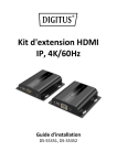 Kit d'extension HDMI IP, 4K/60Hz Guide d'installation DS-55351, DS-55352 1. Table des matières 1. 2. 3. 4. 5. Introduction ............................................................... 3 Caractéristiques principales........................................ 4 Contenu de l'emballage.............................................. 4 Paramètres techniques............................................... 5 Description du panel .................................................. 7 1. Prolongateur HDMI TX (émetteur) .......................... 7 2. HDMI Extender RX (Récepteur) ............................... 9 6. Exigences en matière d'installation............................10 7. Procédures d'installation ...........................................11 1. Comment fabriquer un câble réseau CAT6............ 11 2. Connexions ........................................................... 11 3. Guide de l'utilisateur IR......................................... 13 8. FAQ...........................................................................13 Instructions de sécurité importantes : • • • Ne pas confondre l'émetteur et le récepteur de l'extension HDMI, ni le blaster IR et le récepteur IR. Ne pas brancher/débrancher les câbles lorsque l'appareil est en cours d'utilisation. N'utilisez que les blocs d'alimentation qui font partie du contenu de l'emballage. 2 1. Introduction Le HDMI IP Extender Set, 4K/60Hz permet la transmission de signaux HDMI AV en qualité 4K ultra-haute résolution (4096x2160p à 60Hz) sur de longues distances allant jusqu'à 200 mètres - grâce à la puissante connexion point à point via un câble réseau CAT6 ou supérieur. L'extension via IP permet au système d'être mis à l'échelle de manière flexible et prend en charge jusqu'à 253 récepteurs (écrans) pour la transmission point à multipoint. En outre, l'infrastructure de réseau 1G existante peut être utilisée de sorte qu'une portée de signal illimitée est possible grâce à la mise en cascade via des commutateurs de réseau. Pour une flexibilité encore plus grande, des récepteurs supplémentaires (RX) sont disponibles séparément (modèle : DS-55352). L'excellente qualité d'image est toujours maintenue : Grâce à une faible latence de seulement 150-220 ms, la transmission est fluide et d'une grande netteté en UHD. Une autre caractéristique pratique est l'interface IR intégrée, qui permet de contrôler à distance la source d'entrée directement à partir de l'écran de sortie. L'appareil peut également être monté au mur, ce qui permet une installation peu encombrante. Idéal pour les applications audiovisuelles professionnelles, les installations de home cinéma ou l'utilisation en entreprise, ce kit d'extension HDMI IP allie la meilleure qualité de transmission à une flexibilité maximale. 3 2. Caractéristiques principales • • • • • • • • Longue portée : Transmission du signal AV via un câble CAT6 (ou supérieur) jusqu'à 200 m - connexion point à point Extensible via IP : prend en charge jusqu'à 253 récepteurs (écrans) - Connexion point à multipoint Flexible et puissant sur IP : utilisation de l'infrastructure de réseau 1G existante ou utilisation de commutateurs de réseau 1G supplémentaires pour la transmission de signaux à une distance illimitée - mise en cascade Options d'extension : Récepteurs supplémentaires (RX) disponibles séparément (modèle : DS-55352) Qualité d'image exceptionnelle : transmission en UHD jusqu'à 4K/60Hz (4096x2160p) avec une faible latence de 150 à 220 ms L'interface IR permet de contrôler à distance la source d'entrée à partir de l'écran de sortie. Prend en charge les câbles réseau CAT6 (ou plus) Convient pour un montage mural 3. Contenu de l'emballage • • • • • 1x unité émettrice 1x unité réceptrice 2x Adaptateur secteur, prise UE (DC 5V/1A, 1,5 m) 2x câble IR/extension (1,0 m) 1x Instructions d'utilisation 4 4. Paramètres techniques Objet Vidéo Interface d'entrée Interface de sortie Longueur HDMI Maximum taux de transfert Compatibilité Résolutions Types de connexion Distance de transmission Émetteur Récepteur 1x HDMI 1x RJ45 5 m max. 1x RJ45 1x HDMI 5 m max. 18 Gbps HDMI 2.0 HDCP 1.4/ HDCP 2.2 4096x2160@24/30/50/60Hz, 3840x2160@24/30/50/60Hz, 1080P@24/25/30/50/60Hz, 720P@50/60Hz, 576P@60Hz, 480P@60Hz, 1920x1200, 1680x1050, 1600x900, 1280x1024, 1280x960, 1280x720, 1024x768, 800x600 Connexion individuelle Connexion un-à-plusieurs (par commutateur de réseau) Cascade (par commutateur de réseau) Un à un : 200 m sur CAT6 (ou supérieur) D'un seul à plusieurs : 120 m sur CAT6 (ou supérieur) 5 Temps de latence 1080P : 80 - 130 ms de la transmission 4K/60Hz : 150 - 220 ms Signal audio Interface d'entrée 1x HDMI 1x RJ45 Interface de sortie 1x RJ45 1x HDMI HDMI LPCM 2.0 Signal de commande 1x 3,5 mm sortie 1x 3,5 mm Interface IR IR entrée IR Portée de ≤ 5m réception IR Fréquence IR 20 kHz - 60 kHz Puissance Alimentation DC 5V/1A DC 5V/1A électrique Consommation TX ≤ 3.5W RX ≤ 2.5W électrique Environnement opérationnel Travailler -20°C - 60°C température Stockage -30°C - 70°C température Humidité 0 - 90% RH (sans condensation)) Propriétés physiques Logement Métal Poids TX : 156 g TX : 154 g Couleur Noir Dimensions 96,8 (L) x 94 (L) x 23,7 (H) mm 6 Protection de l'environnement Protection ESD 1a Décharge de contact niveau 2 (±4KV) 1b Décharge d'air niveau 3 (±8KV) Mise en œuvre de la norme : IEC61000-4-2 Protection contre la foudre, Protection contre les surtensions 5. Description du panel 1. Prolongateur HDMI TX (émetteur) 7 1 Remise à zéro Appuyer sur pour redémarrer l'appareil Micro USB Utilisé pour la mise à jour du 2 interface micrologiciel Connexion avec un appareil source 3 Entrée HDMI HDMI Connecter avec le câble d'extension 4 Sortie IR IR blaster Alimentation Connexion avec un adaptateur de 5 électrique courant DC5V/1A Voyant L'indicateur s'allume lorsq