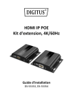 HDMI IP POE Kit d'extension, 4K/60Hz Guide d'installation DS-55353, DS-55354 Table des matières 1. 2. 3. 4. 5. Introduction ............................................................... 3 Caractéristiques principales........................................ 4 Contenu de l'emballage (DS-55353) ............................ 5 Spécifications ............................................................. 5 Interfaces ................................................................... 8 5.1 Émetteur (TX) ........................................................... 8 5.2 Récepteur (RX) ....................................................... 10 6. Exigences en matière d'installation ............................11 7. Procédures d'installation ...........................................12 7.1 Comment fabriquer un câble réseau CAT6 ............. 12 7.2 Diagrammes de connexion ..................................... 12 7.3 Guide de l'utilisateur IR .......................................... 14 8. FAQ...........................................................................14 Instructions de sécurité importantes : • • • Ne pas confondre l'émetteur et le récepteur de l'extension HDMI, ni le blaster IR et le récepteur IR. Ne pas brancher/débrancher les câbles lorsque l'appareil est en cours d'utilisation. L'ensemble n'a pas besoin d'alimentation supplémentaire lorsqu'il est utilisé avec un commutateur POE. Si vous souhaitez utiliser une alimentation supplémentaire, utilisez uniquement une alimentation DC 5V. Assurez-vous que les spécifications correspondent si vous utilisez des adaptateurs DC tiers. 2 • Prend en charge et est conforme à la norme internationale IEEE802.3af pour les commutateurs POE. La puissance maximale de l'émetteur ou du récepteur est de 10 W. 1. Introduction Le HDMI IP Extender Set, 4K/60Hz permet la transmission de signaux HDMI AV en qualité 4K ultra-haute définition (4096x2160p à 60Hz) sur de longues distances allant jusqu'à 200 mètres - grâce à la puissante connexion point à point via un câble réseau CAT6 ou supérieur. L'ensemble est entièrement alimenté par un commutateur réseau POE, des blocs d'alimentation externes ne sont pas nécessaires. L'extension via IP permet au système d'être modulable et de prendre en charge jusqu'à 253 récepteurs (écrans) pour la transmission point à multipoint. En outre, l'infrastructure de réseau 1G existante peut être utilisée de sorte qu'une portée de signal illimitée est possible grâce à la mise en cascade via des commutateurs de réseau. Pour une flexibilité encore plus grande, des récepteurs supplémentaires (RX) sont disponibles séparément (modèle : DS-55354). L'excellente qualité d'image est toujours maintenue : Grâce à une faible latence de seulement 150-220 ms, la transmission est fluide et d'une grande netteté en UHD. 3 Une autre caractéristique pratique est l'interface IR intégrée, qui permet de contrôler à distance la source d'entrée directement à partir de l'écran de sortie. L'appareil peut également être monté au mur, ce qui permet une installation peu encombrante. Idéal pour les applications AV professionnelles, les installations de home cinéma ou l'utilisation dans les entreprises, ce kit d'extension HDMI IP combine la plus haute qualité de transmission avec une flexibilité maximale. 2. Caractéristiques principales • • • • • Longue portée : Transmission du signal AV via un câble CAT6 (ou supérieur) jusqu'à 200 m - Connexion point à point Extensible via IP : prend en charge jusqu'à 253 récepteurs (écrans) - Connexion point à multipoint Flexible et puissant sur IP : utilisation de l'infrastructure de réseau 1G existante ou utilisation de commutateurs de réseau 1G supplémentaires pour la transmission de signaux à une distance illimitée. - Cascade Options d'extension : Récepteurs supplémentaires (RX) disponibles séparément (modèle : DS-55354) Installation flexible grâce au support POE : Alimentation électrique complète via un commutateur réseau PoE - Aucun bloc d'alimentation externe n'est nécessaire 4 • • • • Qualité d'image exceptionnelle : Transmission en UHD jusqu'à 4K/60Hz (4096x2160p) avec une faible latence de 150-220 ms L'interface IR permet de contrôler à distance la source d'entrée à partir de l'écran de sortie. Prend en charge les câbles réseau CAT6 (ou plus) Convient pour un montage mural 3. Contenu de l'emballage (DS-55353) • • • • 1x unité émettrice 1x unité réceptrice 2x câble IR/extension (1,0 m) 1x Instructions d'utilisation 4. Spécifications Objet Vidéo Interface d'entrée Interface de sortie Longueur HDMI Taux de transfert maximal Compatibilité Émetteur Récepteur 1x HDMI 1x RJ45 1x RJ45 1x HDMI 5 m max. 5 m max. 18 Gbps HDMI 2.0 HDCP 1.4/ HDCP 2.2 5 Résolutions Types de connexion Distance de transmission Temps de latence de la transmission Signal audio Interface d'entrée Interface de sortie Sortie HDMI Sortie G/D 3.5 mm 4096x2160@24/30/50/60Hz, 3840x2160@24/30/50/60Hz, 1080P@24/25/30/50/60Hz, 720P@50/60Hz, 576P@60Hz, 480P@60Hz, 1920x1200, 1680x1050, 1600x900, 1280x1024, 1280x960, 1280x720, 1024x768, 800x600 Connexion individuelle Connexion un-à-plusieurs (par commutateur de réseau) Cascade (par commutateur de réseau) D'un à l'autre : 200 m sur CAT6 (ou supérieur) D'un seul à plusieurs : 120 m sur CAT6 (ou supérieur) 1080P : 80-130 ms 4K/60Hz : 150-220 ms 1x HDMI 1x RJ45 1x RJ45 1x HDMI LPCM 2.0 PCM 6 Signal de commande Interface IR 1x 3.5mm Sortie IR 1x 3.5mm IR In Portée de 5 m max. réception IR Fréquence IR 20 kHz - 60 kHz Puissance Alimentation DC 5V/1A DC 5V/1A électrique Consommation TX ≤ 3.5W RX ≤ 2.5W électrique Environnement opérationnel Température de - 20℃ - 60℃ travail Température de - 30℃ - 70℃ stockage Humidité 0 - 90% RH (sans condensation) Propriétés physiques Logement Métal Poids TX : 166 g RX : 164 g Couleur Noir Dimensio