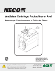 Ventilateur Centrifuge/ Réchauffeur en Aval Assemblage, Fonctionnement et Guide des Pièces L’INSTALLATION ET LE CÂBLAGE DOIVENT ÊTRE RÉALISÉS SELON LES CODES DE L’ÉLECTRICITÉ DU CEC, DU NEC ET DE LA RÉGLEMENTATION LOCALE Lire ce guide avant d’uƟliser ce produit. Le non-respect de ces instrucƟons et des mesures de sécurité peut causer des blessures graves, la mort, ou des dommages à la propriété. Garder ce guide pour future référence. Numéro de pièce: 084691-FRE-CA R01 Révision : 12-03-2018 AVERTISSEMENT : Si les informations données dans ce mode d’emploi ne sont pas respectées à la lettre, un incendie ou une explosion pourrait suvenir et entraîner des dommages matériels, des blessures ou la mort. — Ne pas entreposer ni utiliser d’essence ou autres vapeurs ou liquides inflammables à proximité de cet appareil ou de tout autre appareil. — Quoi faire si vous sentez une odeur de gaz • N’allumez aucun appareil ; • Éteindre toutes les flammes nues ; • Ne touchez à aucun in terrupteur ; • Appelez immédiatement votre fournisseur de gaz. Suivez les instructions du fournisseur de gaz ; • Si vous ne pouvez rejoindre le fournisseur, appelez le service des incendies. — L’installation et les réparations doivent être confiés à un installateur ou un réparateur qualifié ou au fournisseur de gaz. AVERTISSEMENT : Une installation, un réglage, une modification, une réparation ou un entretien inadéquats peuvent entraîner des dommages materiéls, des blessures ou la mort. Lire attentivement les instructions d’installation, de fonctionnement et d’entretien avant de procéder à l’installation ou à la réparation de cet appareil. POUR VOTRE SÉCURITÉ Il est dangereux d’utiliser et d’entreposer de l’essence et autres vapeurs et liquides inflammables se trouvant dans des contenants ouverts à proximité de cet appareil. 12-03-2018 2 Ventilateur Centrifuge/ Réchauffeur en Aval 084691-FRE-CA Bienvenue chez la famille des produits NECO Sommaire de NECO Depuis 1959, les équipements NECO ont été fièrement conçus, fabriqués et supportés pour nos clients ici aux États-Unis et autour du monde. Cet équipement fournira des années de service fiable et sécuritaire avec fonctionnement et maintenance appropriés. NECO est continuellement entrain de tester et d’améliorer ses produits afin de vous fournir le séchage de grain le plus sécuritaire, efficace et économique ainsi que la manutention du grain la plus rentable avec notre équipement de conditionnement du grain. Nous souhaitons pouvoir répondre à toutes vos questions ou commentaires et envisageons de poursuivre notre relation avec vous et aussi de vous faire épargner un temps précieux tout en réduisant votre charge de travail. Portez attention à ce symbole Il vous invitera à porter votre attention aux instructions concernant votre sécurité personnelle ! Il signale un risque de DANGER, un AVERTISSEMENT ou une MISE EN GARDE DE PRUDENCE. Il signifie « ATTENTION » - Soyez vigilant ! Il concerne votre sécurité personnelle ! Soyez Vigilant ! Lire le message qui suit et Soyez vigilant envers la possibilité de blessures graves ou de la mort ! Ce guide devrait être disponible en tout temps au propriétaire/ Contactez le fabricant pour demander des copies additionnelles. Déclaration générale sur la sécurité • Ce guide est fourni pour aider à assurer la sécurité de l’opérateur d’équipement, et de toutes les personnes qui viennent en contact avec cet équipement. • Gardez une copie de ce manuel dans un endroit sûr pour future référence. • Tout propriétaire, exploitant et personnel impliqué qui ne lie pas, ne comprend pas et ne suit pas les instructions de ce guide risque de faire une mauvaise LIRE utilisation de l’équipement et pose un risque pour sa sécurité et la garantie du produit. Nous voulons que vous soyez notre partenaire pour la sécurité! et • Tous les propriétaires et le personnel, y compris les employés de la COMPRENDRE construction doivent lire et comprendre ce guide dans son intégralité, ainsi que tous les autres guides destines aux opérateurs avant de commencer l’installation. • Contactez votre concessionnaire ou NECO pour obtenir des copies additionnelles de ce guide. • Les traductions de ce manuel sont faites aussi exactement que possible. Cependant, si différences interprétations de traduction se produisent, le texte anglais aura la préséance. LES CHANGEMENTS OU LES AMÉLIORATIONS FAITS AU PRODUIT • NECO se réserve le droit d’apporter des changements ou des améliorations à ses produits sans encourir aucune obligation en ce qui concerne les produits déjà fabriqués. 12-03-2018 3 Ventilateur Centrifuge/ Réchauffeur en Aval 084691-FRE-CA GARANTIE LIMITÉE Pendant une période d’un (1) an après l’expédition des marchandises par l’Acheteur au client de l’Acheteur, NECO fournira, gratuitement, franco à bord (FOB) de l’usine NECO située à Omaha, Nebraska, les pièces de rechange de toutes les pièces que NECO identifie comme défectueuses en raison sa fabrication ou du matériel utilisé. • Cette garantie limitée ne s’adresse pas à l’usure normale des pièces encourue durant le fonctionnement et qui doivent être remplacées périodiquement. • Les marchandises non fabriquées par NECO portent seulement la garantie de leur fabricant. • Cet engagement est pris au lieu de toute autre garantie, exprimée ou implicite, y compris la valeur marchande et son adaptation pour un but particulier. • Vous devez obtenir un formulaire « d’autorité de retour » de NECO avant de retourner toute marchandise défectueuse. Ces marchandises défectueuses doivent être retournées, fret-prépayé, à l’usine de NECO à Omaha, Nebraska. Voyez la page de la couverture arrière de ce manuel pour l’information complète de l’adresse. • NECO se réserve le droit d’apporter des changeme