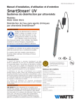 IOM-WQ-SmartStream-UV Manuel d’installation, d’utilisation et d’entretien traviolets Systèmes de désinfection par ultraviolets Modèles WA002 WA008 WA012 iques Désinfection de l’eau sans agents chimiques ® par ultraviolets SmartStream ! AVERTISSEMENT Veuillez lire attentivement ce manuel AVANT d’utiliser ce matériel. Le nonrespect de cette instruction ou des renseignements relatifs à la sécurité et à l’utilisation risque de provoquer des blessures graves, voire mortelles, des dégâts matériels et des dommages à l’équipement. Conservez ce manuel pour référence ultérieure. AVIS L’installation et l’entretien de ce système doivent être effectués seulement par un professionnel qualifié. Le système DOIT être installé conformément à tous les codes nationaux, provinciaux et locaux applicables. Introduction La gamme de systèmes à ultraviolets SmartStream® de Watts permet la désinfection de l’eau pour les applications résidentielles et commerciales légères. Ces systèmes ont été testés et vérifiés à leur débit nominal (voir le tableau des spécifications des produits) par un laboratoire tiers accrédité pour la désinfection de l’eau avec une réduction supérieure à 99,99999 % des bactéries E. Coli et une réduction supérieure à 99,999 % du virus de l’hépatite A. La désinfection de l’eau avec le SmartStream® est un procédé physique simple et rapide. Quand l’eau contaminée est exposée à la lumière ultraviolette de 254 nanomètres du SmartStream®, celle-ci pénètre dans les parois cellulaires des micro-organismes et bouleverse leur matériel génétique (acide désoxyribonucléique ou ADN). S’ensuit une inactivation rapide des micro-organismes par la destruction de leur capacité à se reproduire et à infecter. Les systèmes UV SmartStream® sont certifiés par la WQA conformément à la norme NSF/ANSI/CAN 372 en matière d’absence de plomb. Tableaux des matières Précautions d’installation . . . . . . . . . . . . . . . . . . . . . . . . . . . . . . . . 2-3 Caractéristiques du système . . . . . . . . . . . . . . . . . . . . . . . . . . . . . . . 4 Tableaux des caractéristiques du produit . . . . . . . . . . . . . . . . . . . . . . 5 Dimensions . . . . . . . . . . . . . . . . . . . . . . . . . . . . . . . . . . . . . . . . . . . . 5 Exigences concernant l’eau d’alimentation . . . . . . . . . . . . . . . . . . . . 6 Procédure d’installation . . . . . . . . . . . . . . . . . . . . . . . . . . . . . . . . . . . 6 Les systèmes de désinfection par ultraviolets SmartStream® Schéma d’installation. . . . . . . . . . . . . . . . . . . . . . . . . . . . . . . . . . . . . 7 doivent être installés aussi près que possible du point d’utilisation Entretien . . . . . . . . . . . . . . . . . . . . . . . . . . . . . . . . . . . . . . . . . . . . . . 8 de l’eau traitée ! AVERTISSEMENT NE VOUS fiez pas uniquement à ce système pour rendre l’eau potable. Les systèmes de désinfection par ultraviolets SmartStream® sont destinés à être utilisés comme partie d’un système de traitement d’eau conçu avec soin. Une eau qui contient des contaminants microbiologiques doit être testée régulièrement pour garantir sa qualité et sa salubrité au point d’utilisation. Liste des pièces. . . . . . . . . . . . . . . . . . . . . . . . . . . . . . . . . . . . . . . . . 8 Remplacement de la lampe et du manchon en quartz . . . . . . . . . . . . 9 Procédure de désinfection . . . . . . . . . . . . . . . . . . . . . . . . . . . . . . . . 10 Dépannage . . . . . . . . . . . . . . . . . . . . . . . . . . . . . . . . . . . . . . . . . . . 10 Garantie et conditions . . . . . . . . . . . . . . . . . . . . . . . . . . . . . . . . . . . 12 UV BU Manag See: La ! AVERTISSEMENT ! AVERTISSEMENT NE regardez pas directement la lumière provenant de la lampe à ultraviolets quand elle est ALLUMÉE. Vous risquez de subir de graves dommages permanents aux yeux. Utilisation du SmartStream® avec un autre équipement de traitement d’eau. LA LAMPE UV CONTIENT DU MERCURE. Gérer conformément aux lois sur l’élimination des déchets. Voir : LampRecycle.org AVIS • EMPÊCHEZ le gel du système. Le système pourrait s’endommager. • Installez le système sur une surface plane et horizontale. • La qualité de l’eau à traiter doit respecter les indices pour l’eau d’alimentation contenus dans le présent manuel. Le défaut d’assurer un prétraitement approprié entraîne une désinfection inadéquate. Les systèmes par ultraviolets Watts SmartStream® sont conçus avec des composants de première qualité. Si, à un moment quelconque, un composant doit être remplacé, n’utilisez que des pièces recommandées et fournies par Watts. N’ajoutez pas des composants au système et n’en retirez pas non plus. La lampe par ultraviolets peut être utilisée pendant 9 000 heures dans des conditions normales de fonctionnement, et doit être remplacée tous les ans pour maintenir l’intensité des UV au plus grand rendement maximal. Les manchons en quartz doivent être nettoyés annuellement et remplacés au moins une fois tous les trois ans pour garantir la plus haute transmittance UV possible dans l’eau. N’utilisez que des lampes par ultraviolets et des manchons en quartz fournis par Watts pour votre modèle précis. Le non-respect de cette consigne pourrait entraîner une panne du système, des blessures, la mort, des dégâts matériels et annulera toutes les garanties. N’utilisez pas ce système d’une manière non prévue. Ce purificateur ne doit être utilisé que dans les applications d’eau où l’eau d’alimentation, l’environnement d’installation et la méthode d’installation respectent les exigences décrites dans le présent manuel. Le système doit être correctement dimensionné. Ne dépassez pas la capacité de débit nominal du système. Des contrôleurs de débit disponibles chez Watts