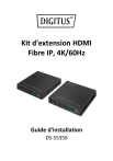 Kit d'extension HDMI Fibre IP, 4K/60Hz Guide d'installation DS-55350 Table des matières 1. 2. 3. 4. 5. 6. 7. 8. 9. Introduction ..................................................................... 3 Caractéristiques principales .............................................. 4 Contenu de l'emballage .................................................... 5 Paramètres techniques ..................................................... 5 Description du panel ........................................................ 8 1. Émetteur (TX) ................................................................. 8 2. Récepteur (RX) ............................................................. 10 Exigences en matière d'installation ................................. 11 Montage mural .............................................................. 12 Procédures d'installation ................................................ 12 1. Diagrammes de connexion........................................... 12 2. Instructions de connexion ............................................ 13 3. Guide de l'utilisateur IR ................................................ 15 4. Fonction RS-232 pass-through ..................................... 15 FAQ ................................................................................ 17 Consignes de sécurité importantes • • • N'exposez pas l'appareil à la pluie et ne le placez pas à proximité de l'eau. Tout liquide pénétrant dans l'appareil peut provoquer un dysfonctionnement, un incendie ou une électrocution. N'insérez jamais d'objets métalliques dans les parties ouvertes de l'appareil. Cela pourrait provoquer un choc électrique. Ne placez pas l'appareil à proximité ou au-dessus d'un radiateur ou d'un accumulateur de chaleur et ne l'exposez pas à la lumière directe du soleil. 2 • • L'appareil ne doit être réparé que par un technicien qualifié. Si vous utilisez un bloc d'alimentation d'une autre marque, assurez-vous que les spécifications du bloc d'alimentation répondent aux exigences du produit 1. Introduction Le HDMI Fiber IP Extender Set, 4K/60Hz est la solution idéale pour la transmission de signaux HDMI de haute qualité sur de longues distances. Il permet la transmission de signaux UHD en 4K/60Hz (3840x2160p) avec une latence minimale de seulement 80-140 ms, de sorte que le contenu est reproduit avec une qualité d'image extrêmement nette et pratiquement sans délai. Grâce à la technologie moderne de la fibre optique, le système atteint une distance de transmission maximale de 40 km en monomode ou de 300 m en multimode, ce qui le rend parfait pour les installations audiovisuelles professionnelles. En utilisant les infrastructures de réseau 1G existantes ou des commutateurs de réseau 1G supplémentaires, l'ensemble d'extension permet une transmission flexible et puissante des signaux. En outre, la portée peut être étendue en cascade, ce qui permet d'atteindre des distances illimitées. Pour plus de flexibilité, le système est compatible avec les modules LC & SC SFP ainsi qu'avec les câbles à fibre optique monomode et multimode. Les modules SFP appropriés sont disponibles séparément (monomode : DN81002, multimode : DN-81000). En plus de l'excellente qualité d'image du site, l'ensemble d'extension offre également une sortie audio séparée via une connexion stéréo de 3,5 mm, ce qui permet une transmission flexible du son. Une sortie HDMI en boucle permet de connecter un moniteur local directement à 3 l'unité émettrice (TX), tandis que l'interface IR intégrée permet de contrôler à distance la source d'entrée à partir de l'écran de sortie. Avec sa longue portée, son excellente qualité d'image et ses options d'extension polyvalentes, le HDMI Fiber IP Extender Set est le choix idéal pour les applications professionnelles telles que les salles de conférence, les centres de contrôle, l'affichage numérique et les studios de diffusion. 2. Caractéristiques principales • • • • • • Longue portée : Transmission du signal AV par câble à fibre optique - monomode jusqu'à 40 km, multimode jusqu'à 300 m - connexion point à point Flexible et puissant sur IP : utilisation de l'infrastructure de réseau 1G existante ou utilisation de commutateurs de réseau 1G pour la transmission de signaux à une distance illimitée - mise en cascade Options d'extension : Récepteurs supplémentaires (RX) disponibles séparément (modèle : DS-55349) Modules SFP disponibles séparément (non inclus) - LC monomode (SM) : DN-81002, LC Multimode (MM) : DN-81000 Large compatibilité : Supporte les modules LC et SC-SFP ainsi que les câbles à fibre optique monomode et multimode. Qualité d'image exceptionnelle : transmission en UHD jusqu'à 4K/60Hz (3840x2160p) avec une faible latence de 80-140 ms 4 • • • Sortie audio supplémentaire : Connexion stéréo 3,5 mm pour une transmission audio séparée Sortie en boucle HDMI : Connexion d'un moniteur local à l'unité émettrice (TX) L'interface IR permet de contrôler à distance la source d'entrée à partir de l'écran de sortie. 3. Contenu de l'emballage • • • • • • • • 1x unité émettrice 1x unité réceptrice 2x adaptateur secteur, prise UE (DC 5V/2A, 1,2 m) 2x câble IR/extension (1,0 m) 1x Matériel de montage (supports muraux, vis) 2 x bloc terminal RS232 2x vis de mise à la terre 1x Instructions d'utilisation 4. Paramètres techniques Objet Vidéo Interface d'entrée Interface de sortie Longueur HDMI Émetteur Récepteur 1x HDMI 1x SFP 1x HDMI 1x SFP ≤ 5m 1x HDMI ≤ 5m 5 Maximum 18 Gbps Taux de transfert HDMI 2.0 Compatibilité HDCP 1.4/HDCP 2.2 3840x2160@24/30/50/60Hz, 1080p@50/60Hz, 720p@50/60Hz, Résolutions 1920x1200@60Hz, 2560x1440@60Hz, 2560x1600@60Hz un à un Types de Mise en cascade par un commutateur de connexion réseau Distance de 40 km (monomode), 300 m (multimode) transmission Temps de latence de la 80 - 140 ms transmission Signal audio In