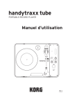 Manuel d’utilisation Fr 1 handytraxx tube - Sommaire Sommaire Introduction ..................................................................................................................4 Conventions utilisées dans ce manuel..................................................................... 5 Caractéristiques principales...................................................................................... 6 À propos de la lampe Nutube........................................................................................................................6 À propos de JICO (Nippon Precision Jewel Industry Co., Ltd.).............................................................6 À propos de la cartouche fournie.................................................................................................................6 Commandes de la platine ............................................................................................ 7 Panneau supérieur...................................................................................................... 7 Panneau latéral ........................................................................................................... 8 Préparatifs ....................................................................................................................9 Assemblage.................................................................................................................. 9 Procédure d’assemblage .............................................................................................................................. 10 Utilisation du capot .................................................................................................... 11 Installation de la platine ...........................................................................................12 Transport/déplacement de la platine handytraxx tube........................................................................ 12 Réglage de pression de l’aiguille ............................................................................12 Assemblage de l’adaptateur secteur .....................................................................13 Montage de la fiche interchangeable de l'adaptateur secteur ........................................................... 13 Retrait de la fiche interchangeable de l’adaptateur secteur .............................................................. 13 Connexions..................................................................................................................14 Connexion de l’adaptateur secteur ........................................................................................................... 14 Connexion des câbles audio ........................................................................................................................ 14 Connexion à un ordinateur .......................................................................................................................... 14 Mise en place des piles .............................................................................................15 Utilisation ................................................................................................................... 16 Lecture d’un disque.................................................................................................... 17 Fonction de mise hors tension automatique............................................................................................17 Réglage du timbre ......................................................................................................18 Réglage des commandes TONE ..............................................................................18 Réglage de l’effet TUBE ...........................................................................................18 Connexion à un ordinateur ........................................................................................ 19 Connexion d’un câble USB .......................................................................................19 Appendices................................................................................................................. 20 Remplacement de la cartouche et de l’aiguille.....................................................21 Soin et entretien de la pointe de l’aiguille ............................................................21 Remplacement de la cartouche et de l’aiguille....................................................21 2 handytraxx tube - Sommaire Guide de dépannage ..................................................................................................22 Impossible de mettre la platine sous tension......................................................................................... 22 Le plateau ne tourne pas ............................................................................................................................ 22 Aucun son, volume trop bas ou trop élevé, distorsion ........................................................................ 22 L’aiguille saute durant la lecture............................................................................................................... 22 Effet de réinjection (‘Larsen’) audible ..................................................................................................... 22 Bruit audible pendant la lecture d’un disque ......................................................................................... 23 Vitesse de lecture du disque trop basse ou trop élevée ..................................................................... 23 La vitesse de lecture de la platine diminue ou fluctue ........................................................................ 23 Le son des haut-parleurs comporte de la distorsion............................................................................ 2