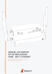 1 © Speechi 2022 Table des matières 1. Aperçu du produit 1-1. Avantages et caractéristiques 1-2. Contenu de la boîte 1-3. Aperçu du récepteur ER 1-4. Aperçu de l’émetteur ET 1-5. Aperçu du récepteur WR 1-6. Aperçu de l’émetteur WT 2. Présentation du matériel 2-1. ER 2-2. ET 2-3. WR 2-4. WT * Ajustement du canal 3. Installation du matériel 3-1. Installation pour ER/ ET 3-2. Installation pour WR/ WT 3-3. Installation pour le contrôle à distance 3-4. Installation pour l’entrée et la sortie audio 4. Exemples de configuration 4-1. HDMI sur Ethernet (ER/ ET) 4-2. HDMI sur Wi-Fi (WR/ WT) 4-3. Configuration du commutateur/routeur pour EZCast ProAV 5. Paramètres 5-1. Paramètres Internet 5-2. Mise à niveau du micrologiciel (OTA) Annexe 2 © Speechi 2022 Aperçu du produit 1-1. Avantages et caractéristiques 1. Conception modulaire pour l’assemblage de l’Extendeur, du Répartiteur (splitter), de la Matrice et du Commutateur (switch) jusqu’à 15x15 applications. 2. Étend le signal 4K 30P, 1080 60P HDMI jusqu’à 180 m (600 pi) sur un seul câble Ethernet Cat5E de 100 m. 3. Utilise le commutateur Ethernet L2 conventionnel pour l’extension et la distribution, et peut être mis en cascade par les commutateurs Ethernet L2 pour une plus longue distance. 3. Prend en charge l’extension IR (20KHz~60KHz) et l’extension RS232 sur IP. 4. Prend en charge l’audio stéréo sur IP, indépendamment de l’extension HDMI. 5. Prend en charge l’extension USB (clavier, souris) sur l’IP et la fonction de commutation KVM par sélection de bouton. 6. Prend en charge le transfert EDID et la résolution de l’émetteur, dont les résolutions les plus populaires 16:9, 16:10, 4:3 et la synchronisation (Pour la Liste d’assistance, veuillez vous référer à l’annexe). 7. Prend en charge la sélection du mode Graphique / Vidéo et la latence est comprise entre 0,06 et 0,10 secondes. 8. Prend en charge la mise à niveau du micrologiciel cloud lors de la connexion au routeur avec un accès Internet. 9. Prend en charge les paramètres Internet via la connexion Ethernet et le CMS (Central Management System) installé pour Win / Mac OS se connectant au commutateur L2 incorporé. 1-2. Contenu de la boîte 3 © Speechi 2022 1-3. Aperçu du récepteur ER Article Description 1 Port d’alimentation. 2 Sortie HDMI. 3 Sortie AUX. 4 Entrée IR. 5 RJ45. 6 Port USB pour le clavier et la souris. 7 RS232. 8 Réinitialiser. 9 Voyant d’alimentation. 10 Voyant Ethernet. 11 Voyant HDMI. 12 Bouton mode. 13 Mode d’affichage : Mode graphique (sombre) / Mode vidéo (lumineux). 14 Bit du canal : Bits élevés (lumineux) / Bits faibles (sombre). 15 Bouton N° de canal. 16 Numéro de canal. 17 Mode de commutation (Switch). 18 Mode de répartition (Splitter). 4 © Speechi 2022 1-4. Aperçu de l’émetteur ET Article Description 1 Port d’alimentation. 2 Sortie HDMI pour le bouclage. 3 Entrée HDMI. 4 Entrée AUX. 5 Sortie IR. 6 RJ45. 7 Port USB pour le contrôle inversé. 8 RS232. 9 Réinitialiser. 10 Voyant d’alimentation. 11 Voyant Ethernet. 12 Voyant HDMI. 13 Bouton mode. 14 Mode DHCP. 15 Bit du canal : Bits élevés (sombre) / Bits faibles (lumineux). 16 Bouton N° de canal 17 Numéro de canal 18 Mode de commutation (Switch). 19 Mode de répartition (Splitter). 5 © Speechi 2022 1-5. Aperçu du récepteur WR Article Description 1 Port d’alimentation. 2 Sortie HDMI. 3 Sortie AUX. 4 Entrée IR. 5 RJ45 : Uniquement pour des paramètres spécifiques comme la mise à niveau du micrologiciel et le contrôle du système CMS. 6 Port USB pour le clavier et la souris. 7 RS232. 8 Réinitialiser. 9 Voyant d’alimentation. 10 Voyant Ethernet. 11 Voyant HDMI. 12 Bouton mode. 13 Mode d’affichage : Mode graphique (sombre) / Mode vidéo (lumineux). 14 Bit du canal : Bits élevés (lumineux) / Bits faibles (sombre). 15 Bouton N° de canal 16 Numéro de canal 17 Mode de commutation (Switch). 18 Mode de répartition (Splitter). 6 © Speechi 2022 1-6. Aperçu de l’émetteur WT Article Description 1 Port d’alimentation. 2 Sortie HDMI pour le bouclage. 3 Entrée HDMI. 4 Entrée AUX. 5 Sortie IR. 6 RJ45 : Uniquement pour des paramètres spécifiques comme la mise à niveau du micrologiciel et le contrôle du système CMS. 7 Port USB pour le contrôle inversé. 8 RS232. 9 Réinitialiser. 10 Voyant d’alimentation. 11 Voyant Ethernet. 12 Voyant HDMI. 13 14 15 Bit du canal : Bits élevés (sombre) / Bits faibles (lumineux). 16 Bouton N° de canal 17 Numéro de canal 18 Mode de commutation (Switch). 19 Mode de répartition (Splitter). 7 © Speechi 2022 2. Présentation du matériel 2-1. ER 2-1 -1. Port 1. Port ENTRÉE DC : Une alimentation électrique 12V/1A est nécessaire. 2. Port SORTIE HDMI : Raccorder au moniteur pour afficher. 3. Port SORTIE AUX : Sortie audio vers le haut-parleur connecté. Notez que le port SORTIE HDMI reçoit simultanément le signal audio. 4. Port ENTRÉE IR : Signal IR en entrée pour le contrôle à distance. 5. Port RJ45 : Raccorder au routeur ou commutateur avec le câble LAN comme pont. 6. USB K/M : Prise en charge de la connexion externe du clavier et de la souris pour le contrôle à distance. 7. RS232 : Signal RS232 en entrée pour le contrôle à distance. 2-1-2. Signal lumineux et bouton 8. Trou de réinitialisation : Appuyez longuement pendant 12 secondes pour réinitialiser les paramètres d’usine par défaut. 9. Voyant PWR : Allumé lorsque l’alimentation électrique est fournie. 10. Voyant LINK : Clignote lors de la transmission de données. 11. Voyant STA : Allumé lorsque le câble HDMI est connecté. 12. Bouton MODE : Cliquez pour changer de mode d’affichage (éclairage pour le mode 1) et appuyez longuement pour optimiser la résolution. 13. Voyant mode 1 (Mode d’affichage) : Le voyant éteint indique le mode graphique avec une latence plus courte et le voyant allumé indique le mode vidéo avec moins de perte de paquets. 14. Voyant mode 2 (Bit du canal) : L
