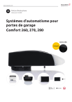 www.marantec.com FR Notice d’instructions Mise à jour: 04.2025 Systèmes d‘automatisme pour portes de garage Comfort 260, 270, 280 · Table des matières 1. Informations relatives à la sécurité. . . . . . . . . . . . . . . . . . . . .3 1.1 Utilisation conforme. . . . . . . . . . . . . . . . . . . . . . . . . . . . . 3 1.2 Groupes cibles. . . . . . . . . . . . . . . . . . . . . . . . . . . . . . . . . . 3 1.3 Consignes générales de sécurité. . . . . . . . . . . . . . . . . . 3 2. Informations relatives au produit . . . . . . . . . . . . . . . . . . . . . . 4 2.1 Contenu de la livraison – entraînement. . . . . . . . . . . . . 4 2.2 Contenu de la livraison – rails. . . . . . . . . . . . . . . . . . . . . 5 2.3 Caractéristiques techniques . . . . . . . . . . . . . . . . . . . . . 5 2.4 Variantes de portes. . . . . . . . . . . . . . . . . . . . . . . . . . . . . . 6 2.5 Exemple d’utilisation . . . . . . . . . . . . . . . . . . . . . . . . . . . . 7 3. 4. 5. À propos de ce document – – – – – – – – Consignes de sécurité Montage . . . . . . . . . . . . . . . . . . . . . . . . . . . . . . . . . . . . . . . . . . . . . 7 3.1 Consignes de sécurité concernant le montage. . . . . . 7 3.2 Préparation du montage . . . . . . . . . . . . . . . . . . . . . . . . . 7 3.3 Montage du système d’entraînement . . . . . . . . . . . . . . 8 3.4 Raccordement. . . . . . . . . . . . . . . . . . . . . . . . . . . . . . . . . . 12 3.5 Fin du montage. . . . . . . . . . . . . . . . . . . . . . . . . . . . . . . . . 17 Mise en service. . . . . . . . . . . . . . . . . . . . . . . . . . . . . . . . . . . . . . 18 4.1 Consignes de sécurité concernant la mise en service. . . . . . . . . . . . . . . . . . . . . . . . . . . . . . . . . . . . . . . . . 18 4.2 Vue d’ensemble de la commande. . . . . . . . . . . . . . . . . . 18 4.3 Affichage du statut. . . . . . . . . . . . . . . . . . . . . . . . . . . . . . 19 4.4 Réglages en usine. . . . . . . . . . . . . . . . . . . . . . . . . . . . . . . 19 4.5 Programmation rapide. . . . . . . . . . . . . . . . . . . . . . . . . . . 19 4.6 Contrôle du fonctionnement. . . . . . . . . . . . . . . . . . . . . 20 4.7 Programmation spéciale. . . . . . . . . . . . . . . . . . . . . . . . . 21 Utilisation. . . . . . . . . . . . . . . . . . . . . . . . . . . . . . . . . . . . . . . . . . . 29 5.1 Consignes de sécurité concernant l’utilisation. . . . . 29 5.2 Émetteur manuel . . . . . . . . . . . . . . . . . . . . . . . . . . . . . . 30 5.3 Déverrouillage. . . . . . . . . . . . . . . . . . . . . . . . . . . . . . . . . . 31 Instructions d’origine. Partie intégrante du produit. À lire impérativement et à conserver. Protégé par les droits d’auteur. Toute reproduction, même partielle, n’est autorisée qu’avec notre accord. Sous réserve de modifications en faveur du progrès technique. Toutes les dimensions sont indiquées en millimètre. Les illustrations ne sont pas à l’échelle. AVERTISSEMENT ! Indication de sécurité concernant un danger qui peut provoquer la mort ou des blessures graves. PRUDENCE ! Indication de sécurité concernant un danger qui peut provoquer des blessures légères à modérées. ATTENTION ! Indication de sécurité concernant un danger qui peut provoquer la détérioration ou la destruction du produit. Légende des symboles • Demande d’intervention 6. Entretien. . . . . . . . . . . . . . . . . . . . . . . . . . . . . . . . . . . . . . . . . . . . 31 7. Maintenance . . . . . . . . . . . . . . . . . . . . . . . . . . . . . . . . . . . . . . . . 31 7.1 Travaux de maintenance par l’exploitant . . . . . . . . . . . 31 7.2 Travaux de maintenance par le personnel technique qualifié . . . . . . . . . . . . . . . . . . . . . . . . . . . . . . . . . . . . . . . 32 $ Contrôle 8. Démontage . . . . . . . . . . . . . . . . . . . . . . . . . . . . . . . . . . . . . . . . . 32 Renvoi à d’autres sections de ce document 9. Mise au rebut . . . . . . . . . . . . . . . . . . . . . . . . . . . . . . . . . . . . . . . 32 10. Dépannage. . . . . . . . . . . . . . . . . . . . . . . . . . . . . . . . . . . . . . . . . . 32 11. Appendice . . . . . . . . . . . . . . . . . . . . . . . . . . . . . . . . . . . . . . . . . . 35 11.1 Déclaration du fabricant . . . . . . . . . . . . . . . . . . . . . . . . 35 11.2 Conformité radioélectrique. . . . . . . . . . . . . . . . . . . . . . 35 2 – Liste, énumération " Renvoi aux documents séparés à observer Réglage en usine Notice d’instructions, Comfort 260, 270, 280 (#100720 – FR) FR 1. AVERTISSEMENT ! Danger de mort en cas de non-respect du mode d’emploi ! Cette notice contient des informations importantes concernant l’utilisation sûre du produit. Les éventuels dangers sont signalés. • Lisez attentivement cette notice. • Respectez les consignes de sécurité de la notice. • Conservez la notice dans un endroit accessible. 1.1 – EN 12445 (« Portes - Sécurité d‘utilisation des portes et portails motorisés - Méthodes d‘essai »). – EN 13241-1 (« Portes - Norme pour les produits - partie 1 : produits sans caractéristiques coupe-feu ni pare-fumée ») Informations relatives à la sécurité Utilisation conforme Le système d’entraînement est conçu exclusivement pour l’ouverture et la fermeture de portes. L’utilisation est autorisée uniquement : – Sur les portes sectionnelles et basculantes à compensation de poids avec protection contre la chute. – Dans des pièces sèches. – Pour un usage privé. – Dans un parfait état technique. – Après un montage correct. – Sous réserve des indications dans les caractéristiques techniques. « 2.3 Caractéristiques techniques » Toute autre utilisation est considérée comme non conforme. 1.2 Groupes cibles 1.2.1 Exploitant L’exploitant est responsable du bâtiment dans lequel le produit est utilisé. L‘exploitant a les tâches suivantes : – Connaître et conserver le mode