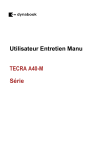 Utilisateur Entretien Manu TECRA A40-M Série TECRA A40-M Série Historique de la révision Tou. Tour. sur Description 00 2024-07-01 Nouveau problème Droit d'auteur © 2024 Dynabook Inc. Tous droits réservés. En vertu des lois sur les droits d'auteur, ce manuel ne peut être reproduit sous quelque forme que ce soit sans l'autorisation écrite préalable de Dynabook. Aucune responsabilité en matière de brevet n'est assumée en ce qui concerne l'utilisation des informations contenues dans le présent document. Les droits d'auteur pour la musique, les films, les programmes informatiques, les bases de données et toute autre propriété intellectuelle couverte par les lois sur les droits d'auteur appartiennent à l'auteur ou au détenteur des droits d'auteur. Le matériel protégé par le droit d'auteur ne peut être reproduit que pour un usage personnel ou domestique. Toute autre utilisation que celle stipulée ci-dessus (y compris la conversion au format numérique, la modification, le transfert du matériel copié et la distribution sur un réseau) sans l'autorisation du détenteur des droits d'auteur constitue une violation des droits d'auteur et est passible de dommages civils ou d'une action pénale. Veuillez respecter les lois sur les droits d'auteur lors de toute reproduction de ce manuel. Clause de non-responsabilité Ce manuel a été validé et révisé pour en vérifier l’exactitude. Les instructions et les descriptions qu’il contient sont exactes pour votre ordinateur au moment de la production de ce manuel. Cependant, les ordinateurs et manuels suivants sont susceptibles d'être modifiés sans préavis. Dynabook n'assume aucune responsabilité pour les dommages résultant directement ou indirectement d'erreurs, d'omissions ou de divergences entre l'ordinateur et le manuel. Toute référence dans ce guide à "Dynabook" désigne Dynabook Inc. et/ou ses sociétés affiliées. • Dynabook n'est pas responsable des dommages, dysfonctionnements ou autres problèmes résultant de réparations effectuées par le client lui-même. • Utilisez toujours des pièces spécifiées par Dynabook pour la réparation ou le remplacement. L'utilisation de pièces autres que celles spécifiées peut entraîner non seulement des dysfonctionnements, mais aussi des incendies ou d'autres accidents graves. Dynabook n'est pas responsable des défauts causés par l'utilisation de pièces non désignées. ii TECRA A40-M Série Marques déposées Intel, le logo Intel, Thunderbolt, le logo Thunderbolt sont des marques commerciales d'Intel Corporation ou de ses filiales aux États-Unis et/ou dans d'autres pays. Microsoft, Windows sont des marques déposées ou des marques commerciales de Microsoft Corporation aux États-Unis et/ou dans d'autres pays. La marque verbale Bluetooth® est une marque déposée appartenant à Bluetooth SIG, Inc. Les termes HDMI, HDMI High-Definition Multimedia Interface, l’habillage commercial HDMI et les logos HDMI sont des marques commerciales ou des marques déposées de HDMI Licensing Administrator, Inc. Wi-Fi est une marque déposée de Wi-Fi Alliance. USB Type-C® et USB-C® sont des marques déposées de l'USB Implementers Forum. Tous les autres noms de sociétés, de produits et de services mentionnés dans le présent document peuvent être des marques déposées de leurs sociétés respectives. Préface Ce manuel d'entretien décrit comment effectuer l'entretien du matériel de l'ordinateur. Icônes de sécurité Des icônes de sécurité sont utilisées dans ce manuel pour attirer votre attention sur des informations importantes. Chaque type de message est identifié comme indiqué ci-dessous. Indique une situation potentiellement dangereuse, pouvant entraîner la mort ou des blessures graves, si vous ne suivez pas les instructions. 。 Un avertissement vous informe qu'une utilisation incorrecte de l'équipement ou le non-respect des instructions peut entraîner une perte de données, endommager l'équipement ou provoquer des blessures mineures ou modérées. A lire. Une note est un indice ou un conseil qui vous aide à utiliser au mieux votre équipement. Une mauvaise réparation de l'ordinateur peut entraîner des risques pour la sécurité. Dynabook demande aux techniciens de maintenance et aux revendeurs ou prestataires de services agréés de s'assurer que les mesures de sécurité suivantes sont strictement respectées. ■ Veillez à bien fixer les vis à l'aide du bon tournevis. Si une vis n'est pas complètement fixée, elle peut se détacher et créer un risque de courtiii TECRA A40-M Série circuit, ce qui peut entraîner une surchauffe, de la fumée ou un incendie. ■ Si vous remplacez la batterie ou la batterie RTC, veillez à n'utiliser que le même modèle de batterie ou une batterie équivalente recommandée par Dynabook. L'installation d'une batterie inadaptée peut entraîner l'explosion de la batterie. iv TECRA A40-M Série Introduction Ce manuel est basé sur le entretien manuel pour service techniciens et a été édité pour être utilisé lorsque les clients effectuent eux-mêmes les réparations. Les notes sont résumées ci-dessous, et s'il y a des divergences avec l'explication du texte principal, ces notes doivent prévaloir. Avant départ réparations ‒ Débranchez tous les périphériques connectés à votre ordinateur, faitesle fonctionner sur batterie et laissez la batterie se vider complètement avant de commencer. Lorsque la batterie est complètement déchargée, l'ordinateur ne s'allumera pas, même si vous appuyez sur le bouton d'alimentation. Si la batterie n'est pas complètement déchargée, l'intérieur de l'appareil est toujours alimenté en électricité, même lorsque l'appareil est éteint. Le démontage de l'appareil dans ces conditions peut entraîner un choc électrique ou un incendie dû à un court-circuit. ‒ Immédiatement après la décharge complète de la batterie, l'intérieur de l'appareil est chaud.