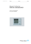 8030178/AE00/V3-0/2015-07 Products Solutions Manuel d’utilisation Unité de commande BCU Unité de commande BCU pour gamme GMS800 Services Produit décrit Unité de commande BCU Fabricant Endress+Hauser SICK GmbH+Co. KG Bergener Ring 27 01458 Ottendorf-Okrilla Allemagne Remarques juridiques Cet ouvrage est protégé par les droits d'auteur. Les droits établis restent dévolus à la société Endress+Hauser SICK GmbH+Co. KG. La reproduction de l'ouvrage, même partielle, n'est autorisée que dans le cadre légal prévu par la loi sur les droits d'auteur. Toute modification, tout abrègement ou toute traduction de l'ouvrage est interdit sans l'accord écrit exprès de la société Endress+Hauser SICK GmbH+Co. KG. Les marques citées dans ce document sont la propriété de leurs détenteurs respectifs. © Endress+Hauser SICK GmbH+Co. KG. Tous droits réservés. Document original Ce document est un document original d'Endress+Hauser SICK GmbH+Co. KG. 2 MANUEL D’UTILISAT ION 8030178/AE00/V3-0/2015-07 Endress+Hauser CONTENU Contenu 1 2 3 À propos de ce document................................................................ 8 1.1 1.2 1.3 Symboles d'avertissement....................................................................... Niveaux d'avertissement / Termes de signalisation.............................. Symboles des informations...................................................................... 8 8 8 Informations importantes................................................................ 9 2.1 2.2 2.3 9 9 9 Description du produit...................................................................... 10 3.1 3.2 4 4.3 4.4 4.5 4.6 4.7 10 10 Procédure de mise sous tension............................................................. Éléments de commande et d'affichage.................................................. 4.2.1 DELs.......................................................................................... 4.2.2 Touches de fonction................................................................ 4.2.3 Messages possibles dans la ligne d'états.............................. Contrôle de l'état du fonctionnement (contrôle visuel).......................... 4.3.1 Caractéristiques d'un fonctionnement fiable........................ 4.3.2 Caractéristiques d'un fonctionnement incertain................... Mise hors service...................................................................................... Démarrage de l'utilisation........................................................................ 4.5.1 Comment accéder à l'affichage des mesures....................... 4.5.2 Comment accéder au Menu principal.................................... 4.5.3 Comment choisir une fonction................................................ 4.5.4 Pour repasser sur l'affichage mesures.................................. 4.5.5 Langue...................................................................................... 4.5.6 Niveau utilisateur (Login)........................................................ Arborescence des menus des fonctions de base................................... Arborescence "Utilisateur autorisé"......................................................... 11 11 12 12 13 14 14 14 14 15 15 15 16 16 16 17 17 19 Fonctions de maintenance.............................................................. 21 5.1 5.2 5.3 Endress+Hauser Remarques fondamentales..................................................................... Fonctions essentielles.............................................................................. Utilisation (généralités).................................................................... 11 4.1 4.2 5 Éclairage écran......................................................................................... Autonomie de l'horloge interne................................................................ Informations/documentations supplémentaires................................... Mode maintenance................................................................................... Sauvegarder/récupérer les données...................................................... Test E/S..................................................................................................... 5.3.1 But des tests des E/S.............................................................. 5.3.2 Informations de sécurité sur le test des E/S......................... 5.3.3 Test des sorties analogiques.................................................. 5.3.4 Tester les sorties binaires....................................................... 5.3.5 Test des entrées analogiques................................................. 5.3.6 Test des entrées binaires........................................................ MANUEL D’UTILISATION 8030178/AE00/V3-0/2015-07 21 21 23 23 23 23 25 25 26 3 CONTENU 5.4 6 6.2 6.3 6.4 6.5 MANUEL D’UTILISAT ION 8030178/AE00/V3-0/2015-07 26 Fonctions de calibrages.................................................................... 27 6.1 4 Redémarrage............................................................................................ Calibrage de composants individuels .................................................... 6.1.1 Conditions pour faire un calibrage manuel............................ 6.1.2 Démarrer la procédure de calibrage...................................... 6.1.3 Exécution de la procédure de calibrage................................. 6.1.3.1 Calibrage avec déroulement temporel préréglé... 6.1.3.2 Calibrage commandé par l'utilisateur................... 6.1.4 Voir les résultats des calibrages............................................. Validation d'un composant unique.......................................................... 6.2.1 Voir les résultats des validations............................................ Calibrage/validation de plusieurs composants (fonctions groupées) : 6.3.1 Démarrer calibrage manuel (fonction