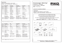 Personenwagen “Silberlinge” ERSATZTEILE Passenger Car “Silberlinge” Spare parts · Pièces détachées · Parti di ricambio Repuestos · 配件 · Reserveonderdelen · Запасные части ET-Nr: 53000-103 53000-151 53000-152 53000-153 53000-155 53000-156 53000-157 53000-158 56030 56050 56060 Voitures Voyageurs “Silberlinge” Bezeichnung: Description: Désignation: Descrizione: 2x Zugfeder Gummiwulst Schleiferhalterclip Radschleifer Drehgestell mit Lichtmschine Drehgestell ohne Lichtmschine 2x Kupplungsdeichsel 2x Feder 2x Puffer links 2x Puffer rechts 2x Tension spring Door Frame Clip holder Rail pickup Bogie with dynamo machine Bogie without dynamo machine 2x Coupler plate 2x Spring 2x Buffer left 2x Buffer right 2x Ressort de traction Soufflet Agrafe Ferroviaire ramassage Bogie avec dynamo d'éclairage Bogie sans dynamo d'éclairage 2x Attelage 2x Ressort de tension 2x Tampon L 2x Tampon R 2x Molle Soffietto Titolare clip Treno pickup Carrello con dinamo PG* 5 5 5 5 8 Carrello senza dinamo 7 ERSATZTEILE 9 Spare parts · Pièces détachées · Parti di ricambio Repuestos · 配件 · Reserveonderdelen · Запасные части ET aus unserem Standardprogramm Kupplung PIN72 (2 Stck.) Radsatz PIN74 - DC Radsatz PIN88 - AC Spare parts standard range Coupling, PIN72 (2 pcs.) Wheelset PIN74 - DC Wheelset PIN88 - AC Pièces détachées de notre gamme standard Attelage, PIN72 (2 unités) Essieux PIN74- CC (2 unités) Essieux PIN88- CA (2 unités) Pezzi di ricambio standard Gancio (2 pezzi) Assali PIN74 CC (2 pezzi) Assali PIN88 CC (2 pezzi) 2x Portagancio 2x Molle 2x Respingenti L 2x Respingenti R 乘客车 "Silberlinge" 包装及说明书内包含重要信息,请保留备用 7 Bei Ersatzteilanforderung bitte immer die vollständige Ersatzteil-Nr. angeben. Hinweis: Für dieses Modell sind nur die unten aufgeführten Ersatzteile erhältlich! Please order the wanted spare part with the complete spare part item number. Note: Only the spare parts listed below are available for this model! Pour commander des pièces de rechange, ne pas oublier de donner le Numéro d’Article de la pièce demandée. Note: Seules les pièces demandée sont disponibles pour ce modèle! 订购配件时请附上完整的配件号码。注:这个模型,只有以下配件可订购! *Preisgruppe *price category *Catégorie de prix *Categoria prezzi 103 Descripción: Omschrijving: Описание: 2x Trekveer Balg Grinder houder clip Rail pickup Draaistel met dynamo 2x натяжной пружиной Сильфон держатель Клип Тележка с Генератор PG* 5 5 5 5 8 轮架-带电机 Draaistel zonder dynamo Тележка без Генератор 7 2x 挂钩 2x 弹簧 2x 缓冲器 左 2x 缓冲器 右 2x Dissel 2x Trekveer 2x Buffer L 2x Buffer R 2x Тяговое 2x натяжной пружиной 2x буфер 2x буфер 9 备用零件的标准范围: Onderdelen standaardassortiment Koppeling, PIN72 (2 st.) Wielstel PIN74 - DC (2 st.) Wielstel PIN88 - AC (2 st.) Запасные части нашего стандартного диапазона Сцепки PIN 72 (2 шт) Колёсная пара DC PIN74 Колёсная пара AC PN88 53000-155 2x Muelle de tracción Fuelle Titular videoclip Recogida rail Bogie con dinamo 说明: 2x 弹簧 门框 固定夹 路轨取电片 轮架-带电机 53000-156 Bogie sin dinamo 53000-157 2x Pértiga de enganche 2x Muelle 2x Topera L 2x Topera R 53000-151 53000-152 53000-153 53000-158 56030 56050 56060 ET aus unserem Standardprogramm Enganche PIN72 (2 p.) Eje PIN74 CC (2 p.) Eje PIN88 CA (2 p.) 挂钩组件 PIN72 (2个) 轮组 Pin 74 (2个) 轮组 Pin 88 (2个) 价格表 *Priscategorie *ценовая категория *Grupo de precio *价 Железнодорожные пикап 152 155 153 157 156 7 158 57656-90-7000 ET-Nr: 53000-103 151 56030 56050 56060 PIKO Spielwaren GmbH • Lutherstraße 30 • 96515 Sonneberg • GERMANY 德国比高有限公司 • 德国图林根州索内堡市路德街30号 ">