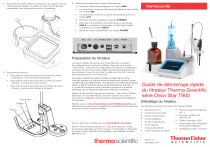 4. Raccordez le portoir de flacon de réactif 1 au support situé du côté gauche du titrateur ou utilisez le portoir comme élément indépendant pour le placer librement sur la paillasse. 6. Branchez les électrodes et le bloc d’alimentation : a. Branchez l’électrode de détection sur l’entrée BNC. b. Le cas échéant, branchez l’électrode de référence demi-cellule sur l’entrée REF. c. Le cas échéant, branchez la sonde de température ATC sur l’entrée ATC. 1 d. Branchez la sonde d’agitateur à l’entrée STIRRER. e. Branchez une clé USB et une imprimante sur les entrées USB A ou connectez un ordinateur en branchant le câble d’ordinateur sur l’entrée USB B. f. Branchez le bloc d’alimentation sur l’entrée POWER. Préparation du titrateur 5. Raccordez la tubulure : a. Raccordez le tube à raccords noirs à l’orifice de vanne « Distributeur » et à la sonde de distributeur. b. Raccordez le tube à raccords bleus à l’orifice de vanne « Burette » et au bouchon de la burette. c. Raccordez le tube à raccords blancs à l’orifice de vanne « Flacon » et au bouchon du flacon de réactif. Distributeur Burette Flacon Lorsque le titrateur est allumé pour la première fois, l’assistant de configuration de l’instrument s’affiche. Appuyez sur le bouton « Start Setup » (Démarrer la configuration) pour lancer la configuration. Une série d’écrans vous invite à régler les paramètres généraux tels que la langue, l’heure et son format, la date et son format, l’unité de température et le nom de l’instrument. Choisissez et préparez le réactif de titrage souhaité. Depuis l’écran d’accueil, appuyez sur l’icône en forme de burette pour accéder à l’écran « Burette Setup and Maintenance » (Configuration et entretien de la burette). Placez un bécher à déchets sous la sonde de distributeur. Exécutez 3 à 5 cycles de rinçage pour rincer la burette, la tubulure et la sonde de distributeur avec le réactif de titrage avant d’effectuer une titration. Depuis l’écran d’accueil, appuyez sur le bouton « Start a New Titration » (Démarrer une nouvelle titration). Une série d’écrans vous invite à accomplir la configuration et les opérations nécessaires à la réalisation d’une titration. Rendez-vous sur www.thermofisher.com/T900titratorseries pour télécharger les mises à jour du logiciel de votre titrateur et accéder aux dernières fonctions et fonctionnalités. Pour en savoir plus, rendez-vous sur thermofisher.com/water © 2017 Thermo Fisher Scientific Inc. Tous droits réservés. Toutes les marques déposées sont des marques commerciales ou déposées de Thermo Fisher Scientific et de ses filiales, sauf indication contraire. 68X700212 1217 Guide de démarrage rapide du titrateur Thermo Scientific série Orion Star T900 Déballage du titrateur Les éléments suivants sont inclus avec chaque titrateur : • Burette de 20 ml • Couvercle pour burette • Support d’électrodes • Sonde d’agitateur • Sonde de distributeur • Kit de tubulure • Tube de desséchant • Portoir de flacon de réactif Version 0.1 Décembre 2017 • Flacon de réactif en plastique de 1 L • Bouchon de flacon de réactif GL38 • Câble d’ordinateur USB • Lecteur flash USB comprenant le manuel de l’utilisateur • Adaptateurs secteur 110-240 V Assemblage du titrateur 2. Réglez la tête du support d’électrodes : 1. Installez la tige du support d’électrodes : a. Insérez la tige dans l’ouverture en haut du titrateur et alignez les encoches de la tige avec les rainures du support. a. Placez le butoir 1 sous la tête du support d’électrodes 2 puis appuyez sur le bouton bleu 3 de la tête pour régler sa hauteur. Insérez les électrodes et sondes dans les logements correspondants de la tête du support d’électrodes. b. Insérez l’éprouvette en verre de la burette dans les bagues d’alignement du titrateur en enfonçant doucement la burette. 3 2 1 c. Placez le couvercle pour burette 2 au-dessus de la burette, puis vissez-le délicatement en veillant à ce que le dessus de la burette soit aligné avec l’ouverture du couvercle. b. Bloquez la tige 1 en serrant la vis captive 2 située sur le dessous du titrateur à l’aide du tournevis Torx T20 fourni. 3. Installez la burette et le couvercle : a. En tenant la burette en verre 1 par le milieu, alignez délicatement la bille de piston située sur le dessous de la burette avec l’attache située sur le titrateur. 2 1 1 2 ">