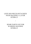 LISTE DES PIECES DETACHEES POUR MACHINE A LAVER GF2006-25 / SPARE PARTS LIST FOR WASHING MACHINE GF2006-25 PAGE POSITION 1 1 CODE ENGLISH 1 115/00144/00 Tub support GF2006-25 2 114/00019/50 Frame complete GF2006-25 + wooden pallet FRENCH Suspension coquille GF2006-25 Chassis complet GF2006-25 standard PAGE POSITION 2 2 2 2 2 2 2 2 2 2 2 2 2 2 2 2 2 2 CODE ENGLISH 1 204/00012/00 Nut zincked M16 DIN 934 8 2 204/00012/00 Nut zincked M16 DIN 934 8 3 204/00016/00 Nut zincked M24 DIN 934 4 224/00046/00 Bolt adjustment suspension 5 224/00045/00 Spring suspension (white) GF15-55 6 204/00012/00 Nut zincked M16 DIN 934 8 7 204/00019/00 Nut zincked M16 DIN 936 8.8 8 206/00153/00 Hexagon bolt zincked M16x80 DIN 933 9 204/00012/00 Nut zincked M16 DIN 934 8 10 201/00023/00 Washer zincked 17x35x4 11 247/00008/00 Shock absorber MONROE type R1064 12 201/00023/00 Washer zincked 17x35x4 13 204/00113/00 Selflocking nut M16 zincked DIN 985 14 206/00153/00 Hexagon bolt zincked M16x80 DIN 933 15 204/00012/00 Nut zincked M16 DIN 934 8 16 201/00023/00 Washer zincked 17x35x4 17 201/00023/00 Washer zincked 17x35x4 18 204/00113/00 Selflocking nut M16 zincked DIN 985 FRENCH Ecrou galvanisé M16 DIN 934 8 Ecrou galvanisé M16 DIN 934 8 Ecrou galvanisé M24 DIN 934 Boulon de réglage suspension Ressort suspension (blanche) Ecrou galvanisé M16 DIN 934 8 Ecrou galvansisé M16 DIN 936 8.8 Boulon galvanisé M16x80 DIN933 8.8 Ecrou galvanisé M16 DIN 934 8 Amortisseur MONROE type R1064 Ecrou de sûreté M16 galvanisé DIN 985 Boulon galvanisé M16x80 DIN933 8.8 Ecrou galvanisé M16 DIN 934 8 Ecrou de sûreté M16 galvanisé DIN 985 PAGE POS CODE ENGLISH FRENCH Clips de fixation pour panneau avant cuve 3 1 217/00008/00 Clips to fix the tub front panel Bande autocollante par mètre 3 2 246/00092/00 Strip per metre (small) Ecrou de sûreté M16 galvanisé DIN 985 3 3 204/00113/00 Selflocking nut M16 zincked DIN 985 Rondelle galvanisée 17x40x4 3 4 201/00001/00 Washer zincked 17x40x4 Tube contre-poids 3 5 115/00151/00 Pipe for counterweight Boulon galvanisé M16x120 DIN 933 3 6 206/00071/00 Hexagon bolt zincked M16x120 DIN 933 3 7 202/00112/00 Washer st.st. 6x16x1,2 Boulon inox M6x25 A2 DIN 933 3 8 205/00103/00 Hexagon bolt st.st. M6x25 A2 DIN 933 PC30 round door Plaque avant ornemental GF2006-25 PC30 porte ronde 3 9 111/32965/00 Ornamental plate front GF2006-25 Contre-poids 3 10 115/00140/00 Counterweight GF2006-25 Joint panneau avant cuve universel 3 12 223/00242/00 Gasket for front panel tub universal Boulon galvanisé M6x40 DIN 934 3 13 206/00012/00 Hexagon bolt zincked M6x40 DIN 934 Rondelle galvanisée 6,5x16x2 3 14 201/00007/00 Washer zincked 6,5x16x2 Rondelle galvanisée 6,5x16x2 3 15 201/00007/00 Washer zincked 6,5x16x2 Ecrou avec rondelle étoille intégrée M6 3 16 206/00101/00 Nut with integrated castle washer M6 Cercle de traction clips panneau avant cuve GF2006-25 3 18 238/00011/00 Ring for clips front panel tub GF2006-25 Cercle de fixation clips panneau avant cuve 3 19 137/00008/00 Fastening ring for tub GF2006-25 Cuve GF2006-25 I304 chauffage électrique + LM35 3 20 119/00252/00 Tub GF2006-25 I304 electrical + LM35 Cuve GF2006-25 I304 I304 PB4 chauffage vapeur + LM35 3 20 119/00251/00 Tub GF2006-25 I304 PB4 Steam heating + LM35 Cuve GF2006-25 I304 boiler + LM35 3 20 119/00249/00 Tub GF2006-25 I304 boiler + LM35 Cuve GF2006-25 I304 chauffage électrique et vapeur + LM35 3 20 119/00250/00 Tub GF2006-25 I304 electrical + steam heating + LM35 3 20 119/00253/00 Tub GF2006-25 I304 electrical + steam heating + LM35 + circulation puCuve GF2006-25 I304 chauf élec et vap + LM35 + ppe de circu Ecrou de sûreté M12 galvanisé DIN 985 3 21 204/00111/00 Selflocking nut M12 zincked DIN 985 Vis intérieure M12x60 DIN 912 3 22 206/00111/00 Interior hexagon screw M12x60 DIN 912 Anneau cuve arrière 3 23 115/00134/00 Tightening ring with holes for tub (back) GF2006-25 Anneau cuve traverse GF2006-30 3 24 115/00125/00 Assembly tightening rings GF2006-25->30 Boulon galvanisé M8x30 DIN 933 3 25 206/00009/00 Hexagon bolt zincked M8x30 DIN 933 Rondelle galvanisée 10,5x25x2,5 3 26 201/00010/00 Washer zincked 10,5x25x2,5 Ecrou de sûreté M8 galvanisé DIN 985 3 27 204/00109/00 Selflocking nut M8 zincked DIN 985 Anneau cuve frontal 3 28 115/00135/00 Tightening ring small (front) GF2006-25 Boulon galvanisé M12x100 DIN 933 3 29 206/00066/00 Hexagon bolt zincked M12x100 DIN 933 Ecrou de sûreté M12 galvanisé DIN 985 3 30 204/00111/00 Selflocking nut M12 zincked DIN 985 PAGE POSITION 4 4 4 4 4 4 4 4 4 4 4 4 4 4 4 4 4 4 4 4 4 4 4 4 CODE ENGLISH 1 248/00114/00 Hexagon bolt M16x60 DIN 933 2 201/00001/00 Washer zincked 17x40x4 3 212/00024/00 Ball bearing 6310-2z 4 212/00037/00 Cerclips J110 DIN 472 5 204/00113/00 Selflocking nut M16 zincked DIN 985 6 139/00006/01 Bearing housing 6 139/00006/00 Bearing housing compl. GF2006-25 7 201/00201/00 Copper washer 10x22x1 8 205/00104/00 Hexagon bolt st.st. M6x16 A2 DIN 933 9 212/00004/00 Ball bearing 6311-2z/c3 10 212/00006/00 Cerclips J120 DIN 472 11 212/00004/00 Ball bearing 6311-2z/c3 12 212/00006/00 Cerclips J120 DIN 472 13 217/00002/00 O-ring 128x6 (for seal plate GF2006-25) 14 119/00001/00 Seal plate GF2006-25 15 219/00003/00 Axial seal ring GF2006-25 16 205/00102/00 Hexagon bolt st.st. M10x20 A2 DIN 933 17 201/00202/00 Copper washer 6,3x14x1,2 18 see page 4,position 19 19 209/00400/00 Speed detector XS4P12PA340 21 205/00104/00 Hexagon bolt st.st. M6x16 A2 DIN 933 22 203/00004/00 Castle washer M6 AZ DIN 6798 23 224/00051/00 Clips CADDY 4H58-4 23 224/00052/00 Clips CADDY 4H912 FRENCH Boulon M16x60 DIN 933 Rondelle galvanisée 17x40x4 Roulement à billes 6310-2z Cerclips J110 DIN 472 Ecrou de sûreté M16 galvanisé DIN 985 Palier Palier compl. GF2006-25 Rondelle cuivre 10x22x1 Boulon inox M6x16 A2 DIN 933 Roulement à billes 6311-2z/c3 Cerclips J120 DIN 472 Roulement à billes 6311-2z/c3 Cerclips J120 DIN 472 Bague "O" 128x6 (pour pièce d'étanchéité GF2006-25) Pièce d'étanchéité GF200