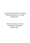 LISTE DES PIECES DETACHEES POUR MACHINE A LAVER GF2006-100 / SPARE PARTS LIST FOR WASHING MACHINE GF2006-100 1 PAGE POSITION 1 1 1 1 1 1 CODE ENGLISH 1 253/10503/00 Upper support GF2006-75 1 290/10503/00 Upper support GF2006-100 2 253/10502/00 Lower support GF2006-75 2 290/10502/00 Lower support GF2006-100 3 253/10501/00 Frame complete GF2006-75 3 290/10501/00 Frame complete GF2006-100 FRENCH Support supérieur GF2006-75 Support supérieur GF2006-100 Support inférieur GF2006-75 Support inférieur GF2006-100 Chassis complet GF2006-75 Chassis complet GF2006-100 2 PAGE POSITION 2 2 2 2 2 2 2 2 2 2 2 2 2 2 2 2 2 2 2 CODE ENGLISH 1 204/00012/00 Nut zincked M16 DIN 934 8 2 204/00012/00 Nut zincked M16 DIN 934 8 3 204/00016/00 Nut zincked M24 DIN 934 4 224/00046/00 Bolt adjustment suspension 5 224/00044/00 Spring suspension (yellow) GF2006-30 6 204/00012/00 Nut zincked M16 DIN 934 8 7 204/00012/00 Nut zincked M16 DIN 934 8 8 206/00071/00 Hexagon bolt zincked M16x120 DIN 933 8 206/00155/00 Hexagon bolt zincked M16x150 DIN 933 8.8 9 204/00012/00 Nut zincked M16 DIN 934 8 10 201/00001/00 Washer zincked 17x40x4 11 247/00008/00 Shock absorber MONROE type R1064 12 201/00001/00 Washer zincked 17x40x4 13 204/00113/00 Selflocking nut M16 zincked DIN 985 14 206/00071/00 Hexagon bolt zincked M16x120 DIN 933 15 204/00012/00 Nut zincked M16 DIN 934 8 16 201/00001/00 Washer zincked 17x40x4 17 201/00001/00 Washer zincked 17x40x4 18 204/00113/00 Selflocking nut M16 zincked DIN 985 FRENCH Ecrou galvanisé M16 DIN 934 8 Ecrou galvanisé M16 DIN 934 8 Ecrou galvanisé M24 DIN 934 Boulon de réglage suspension Ressort suspension GF2006-30 Ecrou galvanisé M16 DIN 934 8 Ecrou galvanisé M16 DIN 934 8 Boulon galvanisé M16x120 DIN 933 Boulon galvanisé M16x150 DIN933 8.8 Ecrou galvanisé M16 DIN 934 8 Rondelle galvanisée 17x40x4 Amortisseur MONROE type R1064 Rondelle galvanisée 17x40x4 Ecrou de sûreté M16 galvanisé DIN 985 Boulon galvanisé M16x120 DIN 933 Ecrou galvanisé M16 DIN 934 8 Rondelle galvanisée 17x40x4 Rondelle galvanisée 17x40x4 Ecrou de sûreté M16 galvanisé DIN 985 3 PAGE POSITION CODE ENGLISH 3 1 206/00122/00 Hexagon bolt zincked M16x 70 DIN 933 8.8 3 2 201/00001/00 Washer zincked 17x40x4 3 3 204/00113/00 Selflocking nut M16 zincked DIN 985 3 4 223/00147/00 Gasket front and backpanel tub GF2006-45->75 3 5 173/00022/00 Outer front panel tub GF2006-45/55 3 6 253/10504/00 Counterweight GF2006-75 3 7 173/00010/00 Ornamental front plate GF2006-75 - round door 3 8 205/00102/00 Hexagon bolt st.st. M10x20 A2 DIN 933 3 9 202/00105/00 Washer st.st. 20.5x10x1 3 10 206/00099/00 Bolt with integrated lockwasher M6 X 16 3 11 252/00006/00 Adjustable foot 3 12 206/00122/00 Hexagon bolt zincked M16x 70 DIN 933 8.8 3 13 201/00001/00 Washer zincked 17x40x4 3 14 201/00001/00 Washer zincked 17x40x4 3 15 204/00113/00 Selflocking nut M16 zincked DIN 985 3 16 253/10505/00 Bearing housing GF2006-75 3 17 173/00019/10 St.st. back plate for tub GF2006-45/55 (electrical + steam) 3 17 173/00020/10 St.st. back plate for tub GF2006-45/55 (electrical + steam) 3 18 206/00099/00 Bolt with integrated lockwasher M6 X 16 3 19 223/00147/00 Gasket front and backpanel tub GF2006-45->75 3 20 173/00020/00 Tub complete GF2006-55 (electr. + steam) 3 20 173/00019/00 Tub complete GF2006-55 (electr. + steam) 3 20 190/00020/00 Tub complete GF2006-100 (steam) 3 20 190/00019/00 Tub complete GF2006-100 (electr. + steam) FRENCH Boulon galvanisé M16x 70 DIN 933 8.8 Rondelle galvanisée 17x40x4 Ecrou de sûreté M16 galvanisé DIN 985 Joint panneau avant et arrière cuve GF2006-45->75 Panneau avant cuve extérieur GF2006-45/55 Dempgewicht GF2006-75 Panneau frontal ornemental GF2006-75 - porte ronde Boulon inox M10x20 A2 DIN 933 Rondelle inox 20.5X10X1 Boulon avec rondelle étoile integrée M6 X 16 Pied Boulon galvanisé M16x 70 DIN 933 8.8 Rondelle galvanisée 17x40x4 Rondelle galvanisée 17x40x4 Ecrou de sûreté M16 galvanisé DIN 985 Palier GF2006-75 Panneau arrière cuve en inox GF2006-45/55 (éléctr.+vapeur) Panneau arrière cuve en inox GF2006-45/55 (éléctr.+vapeur) Boulon avec rondelle étoile integrée M6 X 16 Joint panneau avant et arrière cuve GF2006-45->75 Cuve complet GF2006-55 (électr. + vapeur) Cuve complet GF2006-55 (électr. + vapeur) Cuve complet GF2006-100 (électr. + vapeur) Cuve complet GF2006-100 (électr. + vapeur) 4 PAGE POSITION CODE ENGLISH 4 1 209/00400/00 Speed detector IA12DSN04PO1753 4 2 see page 4,position 1 4 3 153/10028/00 Support speed sensor GF2006-45/55 4 4 205/00102/00 Hexagon bolt st.st. M10x20 A2 DIN 933 4 5 203/00002/00 Castle washer M10 AZ DIN 6798 4 6 253/10507/00 Protection plate bearing at the back 4 7 253/00157/00 Cerclips J180 DIN 472 4 8 253/00165/00 Ring cylinder bearing 22220 CC/W33 4 9 253/10513/00 Ring diameter 180 for removal of bearings 4 10 212/00002/00 Grease box PERMA 12 4 11 253/10505/00 Bearing housing GF2006-75 4 11 253/10522/00 Bearing housing GF2006-75 complete with bearings GF2006-75 4 12 253/10514/00 Ring diameter 200 for removal of bearings 4 13 253/00164/00 Ring cylinder bearing NU 22222 4 14 212/00043/00 Cerclips J 200 DIN 472 4 15 253/10523/00 Protection plate for bearing on the front side 4 16 201/00202/00 Copper washer 6,3x14x1,2 4 17 205/00102/00 Hexagon bolt st.st. M10x20 A2 DIN 933 FRENCH Détecteur de vitesse XS4P12PA340 ref. page 4,position 1 Support pour détecteur de vitesse GF2006-45/55 Boulon inox M10x20 A2 DIN 933 Rondelle étoile M10 AZ DIN 6798 Pièce protectrice pour roulement derrière Circlips J180 DIN 472 Roulement cylindrique 22220 CC/W33 Ring diamètre 180 pour éloigner les roulement Cartouche de graissage PERMA 12 Palier GF2006-75 Palier complète avec roulements GF2006-75 Ring diamètre 200 pour éloigner les roulement Roulement cylindrique NU 22222 Cerclips J 200 DIN 472 Pièce protectrice pour roulement en avant Rondelle cuivre 6,3x14x1,2 Boulon inox M10x20 A2 DIN 933 5 PAGE POSITION 5 5 5 5 5 5 5 5 5 5 5 CODE ENGLISH 6 253/10507/00 Protection plate 