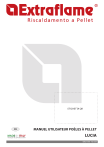 ETICHETTA QR FR MADE IN ITALY design & production MANUEL UTILISATEUR poêles à pellet Lucia 004277341 - Rev 004 Appliquer étiquette données techniques 2 FRANCAIS ATTENTION LES SURFACES PEUVENT DEVENIR TRÈS CHAUDES ! UTILISER TOUJOURS DES GANTS DE PROTECTION ! Une énergie thermique est emprisonnée pendant la combustion et rend les surfaces, les portes, les poignées, les commandes, les vitres, le tuyau d’évacuation des fumées et éventuellement la partie antérieure de l’appareil considérablement chaudes. Il ne faut pas toucher les éléments en question sans être muni de vêtements de protection (gants de protection fournis). Il faut faire en sorte de bien expliquer ce danger aux enfants et de ne pas les faire approcher du foyer pendant le fonctionnement FRANÇAIS.......................................................................................................................................................................................................... 5 Mises en garde............................................................................................................................................................................................... 5 Sécurité........................................................................................................................................................................................................... 5 Entretien ordinaire.................................................................................................................................................................................... 7 INSTALLATION................................................................................................................................................................................................... 8 CONSIGNES POUR L’ENTRETIEN............................................................................................................................................................................................................ 8 Détails LUCIA................................................................................................................................................................................................ 10 Positionnement du poêle....................................................................................................................................................................... 11 Remarques pour le fonctionnement CORRECT ............................................................................................................................... 11 Fusible.........................................................................................................................................................................................................................................................11 Pellet et chargement............................................................................................................................................................................... 12 réservoir pellet - Fermeture à pression........................................................................................................................................... 12 Télécommande............................................................................................................................................................................................ 13 icônes Télécommande......................................................................................................................................................................................................................14 Insertion des piles..............................................................................................................................................................................................................................14 CONSEILS et précautions POUR L'UTILISATION DE LA TÉLÉCOMMANDE....................................................................................................................14 ECRAN TACTILE ............................................................................................................................................................................................... 15 ouverture ECRAN.................................................................................................................................................................................................................................15 fermeture ECRAN..................................................................................................................................................................................................................................15 Tableau de commande.............................................................................................................................................................................. 16 Légende icônes......................................................................................................................................................................................................................................16 Menu général.........................................................................................................................................................................................................................................17 mises en garde générales..............................................................................................................................................................................................................17 Réglages pour le PREMIER ALLUMAGE................................................................................................................................................... 18 Date-heure.......................