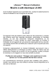 Lifenaxx ® * Manuel d'utilisation Moulin à café électrique LX-063 Avant d'utiliser l'appareil pour la première fois, veuillez lire attentivement le manuel d'utilisation et les consignes de sécurité. Cet appareil n'est pas destiné à être utilisé par des personnes (y compris des enfants) ayant des capacités physiques, sensorielles ou mentales réduites, ou par des personnes manquant d'expérience ou de connaissances, à moins qu'elles ne soient supervisées ou formées à l'utilisation de cet appareil par une personne responsable de leur sécurité. Les enfants doivent être surveillés pour s'assurer qu'ils ne jouent pas avec cet appareil. Conservez soigneusement ce manuel d'utilisation pour pouvoir vous y référer ultérieurement ou échanger le produit. Faites de même avec les accessoires d'origine de ce produit. En cas de garantie, veuillez contacter le revendeur ou le magasin où vous avez acheté ce produit. Profitez de votre produit. * Partagez votre expérience et votre opinion sur l'un des portails Internet bien connus. Les caractéristiques techniques peuvent être modifiées sans préavis veuillez vous assurer que vous utilisez le dernier manuel disponible sur le site web du fabricant. 1 Modèle : LX-063, article n° 5324, 04/2025 Table des matières Conseils...................................... 2 Consignes de sécurité ................ 2 Règles de sécurité pour les batteries rechargeables .............. 3 Avertissements ........................... 4 Clause de non-responsabilité ..... 4 Caractéristiques ......................... 4 Présentation du produit .............. 5 Comment charger....................... 6 Comment régler la grosseur de la mouture ...................................... 6 Comment utiliser ........................ 7 FAQ ............................................ 9 Spécifications techniques ........... 9 Pris en charge ............................ 9 Déclaration de conformité ........ 10 Élimination ................................ 10 Conseils ⚫ N'utilisez le produit qu'aux fins pour lesquelles il est destiné. fonction⚫ N'endommagez pas le produit. Les cas suivants peuvent l'endommager : Incorrect tension, accidents (y compris liquide ou humidité), mauvaise utilisation ou abus du produit défectueux ou inapproprié installation, problèmes d'alimentation secteur, y compris les pics de tension ou la foudre dommages, infestation par insectes, altération ou modification du produit par des personnes autres que le service de maintenance agréé personnel, exposition à des substances anormalement corrosives matériaux, insertion d'objets étrangers dans le unité, utilisée avec des accessoires non préapprouvés.⚫ Consultez et respectez tous les avertissements et précautions contenus dans le manuel d’utilisation. Consignes de sécurité ⚫Ne pas immerger ce produit dans l'eau ou tout autre liquide afin d'éviter d'endommager le produit et de provoquer des blessures. ⚫Ce produit est uniquement destiné à moudre des grains de café torréfiés. Ne l'utilisez pas à d'autres fins. ⚫N'appliquez pas de force excessive lors de la rotation du broyeur ou lorsque vous tentez d'accélérer le processus de broyage pour éviter d'endommager le produit. ⚫Gardez les doigts ou toute autre partie du corps éloignés du noyau de broyage pendant l'utilisation pour éviter les blessures. ⚫N'essayez pas de démonter ce produit, car un démontage non autorisé annulera la garantie. ⚫N'utilisez pas ce produit à proximité de gaz inflammables ou explosifs, de températures élevées ou dans des environnements dangereux. ⚫Ne jamais toucher le produit avec les mains mouillées ou humides. ⚫Le produit ne peut être utilisé qu'avec la tension décrite sur l'autocollant. 2 Modèle : LX-063, article n° 5324, 04/2025 ⚫Ne placez pas le produit sur une surface instable. L'appareil pourrait être endommagé ou des personnes pourraient être blessées. Toute fixation doit être effectuée conformément aux instructions du fabricant ou obtenues auprès de celui-ci. ⚫Le câble est gainé et isole le courant. Ne posez aucun objet sur le câble, car cela pourrait altérer sa fonction de protection. Évitez toute contrainte excessive sur le câble, notamment au niveau des prises et des fiches. ⚫N'insérez aucun objet dans les ouvertures de l'appareil, car le courant circule à certains endroits et le contact peut provoquer un incendie ou un choc électrique. ⚫N'utilisez pas de nettoyants liquides ni de sprays nettoyants. Le produit doit être nettoyé uniquement avec un chiffon humide. ⚫Ne connectez aucun appareil supplémentaire qui n’est pas recommandé par le fabricant. ⚫N'utilisez pas le produit en plein soleil ou dans des endroits où la température peut dépasser 50°C pendant une longue période. Règles de sécurité pour les batteries rechargeables Ce produit utilise des piles rechargeables et peut vous accompagner partout où vous en avez besoin. Cependant, toutes les piles peuvent EXPLOSER, PRENDRE FEU et PROVOQUER DES BRÛLURES si elles sont démontées, perforées, coupées, écrasées, court-circuitées, incinérées ou exposées à l'eau, au feu ou à des températures élevées. Manipulez-les donc avec précaution. Pour utiliser les batteries rechargeables en toute sécurité, suivez ces directives : ⚫ Respectez TOUJOURS les lois locales en matière de déchets et de recyclage lorsque vous jetez des piles usagées. ⚫ Utilisez TOUJOURS le produit pour charger les batteries rechargeables. ⚫ NE JAMAIS placer les piles rechargeables dans une poche, un sac à main ou tout autre récipient, en particulier ceux contenant des objets métalliques. ⚫ NE JAMAIS stocker les batteries rechargeables avec des matériaux dangereux ou combustibles. ⚫ Ne laissez JAMAIS la batterie rechargeable ou son compartiment à piles se mouiller, que ce soit avant, pendant ou après l'installation. (N'oubliez pas que votre produit est