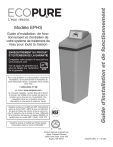 Modèle EPHS Guide d’installation, de fonctionnement et d’entretien de votre système de traitement de l’eau pour toute la maison ENREGISTREMENT DU PRODUIT ET EXTENSION DE LA GARANTIE Enregistrez votre produit s’il vous plaît sur www.ecopure.com Voir la page de garantie pour plus de détails sur l’extension de la garantie. Pour toute question ou préoccupation concernant l’installation, le fonctionnement et l’entretien de votre adoucisseur d’eau, composez notre numéro sans frais 1-800-693-1138 ou visitez www.ecopure.com Au moment d’appeler, veuillez être prêt à fournir le numéro de modèle et le numéro de série du produit, qui se trouvent sur l’autocollant d’homologation situé sur la bordure sous les charnières du couvercle du réservoir de sel. Système évalué et certifié par NSF International selon la norme NSF / ANSI 42 pour la réduction du goût et l’odeur de chlore, et de la norme 44 pour la réduction de la dureté de l’eau, l’efficacité, et la réduction de baryum et radium 226/228, et certifié selon la norme NSF / ANSI / CAN 372. Système évalué et certifié par Water Quality Association selon la norme CSA B483.1. Produit fabriqué et garanti par Water Channel Partners 2805 Dodd Road, Suite 300 Eagan, MN 55121 Guide d’installation et de fonctionnement L’eau résolu. 7393276 (Rév. F 1/31/25) TABLE DES MATIÈRES Page Specifications et rendement . . . . . . . . . . . . . . . . . . . . . . . . . . . . . . . . . . . . . . . . . . . . . . . . . . . . . . . . . . . . . . . . . . 3-4 Avant de commencer . . . . . . . . . . . . . . . . . . . . . . . . . . . . . . . . . . . . . . . . . . . . . . . . . . . . . . . . . . . . . . . . . . . . . . . . 4 Vérification de la marchandise expédiée . . . . . . . . . . . . . . . . . . . . . . . . . . . . . . . . . . . . . . . . . . . . . . . . . . . . . . . . . 5 Renseignements sur le traitement de l’eau . . . . . . . . . . . . . . . . . . . . . . . . . . . . . . . . . . . . . . . . . . . . . . . . . . . . . . . 5 Consignes d’installation . . . . . . . . . . . . . . . . . . . . . . . . . . . . . . . . . . . . . . . . . . . . . . . . . . . . . . . . . . . . . . . . . . . . . 6-7 Instructions d’installation . . . . . . . . . . . . . . . . . . . . . . . . . . . . . . . . . . . . . . . . . . . . . . . . . . . . . . . . . . . . . . . . . . . 8-12 Programmation de l’adoucisseur d’eau . . . . . . . . . . . . . . . . . . . . . . . . . . . . . . . . . . . . . . . . . . . . . . . . . . . . . . . 13-14 Caractéristiques du contrôleur . . . . . . . . . . . . . . . . . . . . . . . . . . . . . . . . . . . . . . . . . . . . . . . . . . . . . . . . . . . . . . 15-18 Entretien de routine . . . . . . . . . . . . . . . . . . . . . . . . . . . . . . . . . . . . . . . . . . . . . . . . . . . . . . . . . . . . . . . . . . . . . . 19-20 Dépannage . . . . . . . . . . . . . . . . . . . . . . . . . . . . . . . . . . . . . . . . . . . . . . . . . . . . . . . . . . . . . . . . . . . . . . . . . . . . . 21-23 Vue éclatée et liste des pièces . . . . . . . . . . . . . . . . . . . . . . . . . . . . . . . . . . . . . . . . . . . . . . . . . . . . . . . . . . . . . 24-27 Garantie . . . . . . . . . . . . . . . . . . . . . . . . . . . . . . . . . . . . . . . . . . . . . . . . . . . . . . . . . . . . . . . . . . . . . . . . . . . . . . . . . . 28 Dimensions 52 cm 20-1/2" (20 1/2 po) ENTRÉE IN 38 cm 15" (15 po) 8,6 cm3-3/8" (3 3/8 po) SORTIE OUT VUETOP DU VIEW DESSUS ENTRÉE – SORTIE IN - OUT 122 cm 48" (48 po) REMARQUE : En raison de variations dans la production et l’assemblage, la hauteur de la vanne d’adoucisseur d’eau peut varier jusqu’à 1/2 po, et peut ne pas correspondre aux systèmes précédemment installés. Cela n’affectera pas les performances du système. 105 cm 41-3/8" (41 3/8 po) SIDE VUE DEVIEW PROFIL 2 FRONT VUE DE VIEW FACE FIG. 1 Spécifications et rendement Ce modèle a été homologué pour son efficacité. L’efficacité nominale n’est valide qu’à la dose de sel minimale. Ce système intègre une fonctionnalité de régénération à la demande (Demand Initiated Regeneration, D.I.R.) conforme à des spécifications de rendement précises pour réduire au minimum la saumure et l’eau utilisées pour son fonctionnement. Ce système de traitement de l’eau possède une efficacité d’adoucissement nominale d’au moins 3 350 grains par livre de sel en fonction de la dureté totale de l’eau (valeur basée sur la présence du chlorure de sodium) et ne doit pas produire un taux de sel supérieur à celui indiqué dans les spécifications ni être utilisé à un débit de service maximal supérieur à celui indiqué dans les spécifications. Il a été démontré que ce système pour fournir de l’eau douce pendant dix minutes en continu au débit de service nominal. L’efficacité nominale du sel a été mesurée lors d’essais en laboratoire, tel que décrit dans la norme NSF/ANSI n° 44. Ces essais portent sur l’efficacité maximale possible du système. L’efficacité de fonctionnement correspond à l’efficacité réelle après l’installation du système, qui est normalement inférieure à l’efficacité de fonctionnement en raison de multiples facteurs liés aux applications individuelles, notamment la dureté de l’eau, l’utilisation de l’eau et autres contaminants susceptibles de réduire la capacité de l’adoucisseur. Les essais ayant eu lieu dans des conditions normales de laboratoire, il se peut que le rendement réel du système varie selon la qualité de l’eau dans votre localité. Le système a été soumis à des essais conformément à la norme NSF/ANSI 42 pour sa capacité de réduire le goût et l’odeur de chlore. La concentration de la substance indiquée présente dans l’eau entrant dans le système a été réduite à un niveau inférieur ou égal à la limite admissible dans l’eau sortant du système, conformément aux dispositions de l