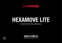 HEXAMOVE LITE ÉCOUTEURS TRUE WIRELESS MODE D’EMPLOI ATTENTION Si le numéro de série sur le produit, sur la couverture du manuel ou au bas de la boîte est absent ou dégradé, veuillez retourner le produit au revendeur immédiatement. LISEZ-MOI Avant d’utiliser ce produit, lisez attentivement les informations de sécurité et de garantie contenues dans les brochures fournies. Veuillez également conserver les documents à portée afin qu’ils soient disponibles immédiatement en cas de besoin. Pour obtenir une version imprimable du manuel complet, rendez-vous sur www.v-moda.com/manuals À PROPOS DES ÉCOUTEURS Bienvenue chez V-MODA, l’ultime référence de style de vie des mélomanes. Nous espérons sincèrement que vous apprécierez nos écouteurs et leur équilibre parfait entre style intemporel, ergonomie moderne et technologie de pointe. Les Hexamove Lite sont des écouteurs true wireless combinant le superbe son qui est la marque de fabrique de V-MODA avec une liberté de mouvement illimitée, disponibles dans trois couleurs élégantes. Ils offrent un design ergonomique permettant des heures d’écoute en tout confort. Profitez de 6 heures de lecture sans fil en une seule charge et de 18 heures de batterie supplémentaire grâce à son étui de transport, pour vous permettre de passer toute votre journée en musique. Découvrez un design parfaitement conçu avec un son vibrant et précis grâce à des haut-parleurs à membrane de 6mm, qui offrent des basses puissantes, des médiums vifs et des aigus cristallins, dans des écouteurs à peine visibles et faciles à porter. Les Hexamove Lite sont prêts à vous suivre partout où la vie vous mène grâce à leur résistance IPX4 à la sueur, à l'eau et à la poussière. Contrôlez votre son, répondez aux appels et accédez à distance aux assistants vocaux grâce aux capteurs gyroscopiques intuitifs des Hexamove Lite. Un microphone intégré capte votre voix pour que vous puissiez utiliser les commandes vocales et prendre des appels en toute confiance. CONTENU 1 3 4 2 1 Écouteurs true wireless Hexamove Lite 2 Étui de chargement 3 3 jeux d’embouts BLISS (S, M, L) 4 Câble de chargement USB-C PORTER VOS ÉCOUTEURS 1 Insérez les embouts BLISS de votre choix sur les écouteurs 2 Très important: insérez l’écouteur correct pour chaque oreille. « L » dans l'oreille gauche, « R » dans l'oreille droite 3 Vérifiez que l'écouteur est bien inséré dans votre oreille, avec un ajustement serré (similaire à celui d’un bouchon d'oreille) pour assurer la meilleure qualité sonore et le plus grand confort possibles 4 Si vous ne vous sentez pas à 100% à l'aise une fois l'écouteur inséré dans votre oreille, essayez une autre taille d’embout STOCKAGE DE VOS ÉCOUTEURS 1 Rangez les écouteurs dans l'étui de chargement afin d’éviter de les endommager lorsque vous ne les utilisez pas ou ne les portez pas 2 L’étui de chargement charge automatiquement les écouteurs afin que vous disposiez toujours de l’autonomie nécessaire DESCRIPTION DES ÉCOUTEURS 1 3 1 Capteurs gyroscopiques 2 2 Embouts BLISS 4 1 2 3 4 3 Clips 4 Microphone POUR COMMENCER 1 Retirez les écouteurs Hexamove Lite de leur étui pour les allumer automatiquement; s'ils n'ont jamais été appariés avec un appareil actif, ils entreront automatiquement en mode d’appariement 2 Les écouteurs apparaîtront dans les paramètres Bluetooth de votre appareil sous le nom V-MODA HEXM LITE 3 Sélectionnez V-MODA HEXM LITE pour terminer l'appariement Nous vous recommandons de charger la batterie avant d'utiliser vos écouteurs pour la première fois. GUIDE ÉTAPE PAR ÉTAPE 1 ALLUMAGE/EXTINCTION a. Pour allumer les écouteurs, retirez-les de leur étui b. Pour éteindre les écouteurs, rangez-les dans leur étui 2 EXTINCTION AUTOMATIQUE a. Après 10 minutes d'inactivité, les écouteurs Hexamove Lite s'éteindront automatiquement b. Pour allumer les écouteurs après leur extinction automatique, appuyez sur l'un des écouteurs pour les réactiver 3 PREMIER APPARIEMENT SANS FIL a. Retirez les écouteurs Hexamove Lite de leur étui pour les allumer automatiquement; s'ils n'ont jamais été appariés avec un appareil actif, ils entreront automatiquement en mode d’appariement b. Lorsque “V-MODA HEXM LITE” apparaît dans la section « Nouveaux périphériques Bluetooth » dans votre téléphone, sélectionnez-le pour lancer l’appariement 4 CONNEXION D'UN NOUVEL APPAREIL a. Désactivez le Bluetooth sur tout appareil précédemment apparié b. Retirez les écouteurs Hexamove Lite de leur étui pour les allumer automatiquement; s'ils n'ont jamais été jumelés avec un appareil actif, ils entreront automatiquement en mode d’appariement c. Lorsque “V-MODA HEXM LITE” apparaît dans la section « Nouveaux périphériques Bluetooth » dans votre téléphone, sélectionnez-le pour lancer l’appariement 5 CONTRÔLES : CAPTEUR GYROSCOPIQUE TACTILE DROIT Lecture ou pause / Accepter ou mettre fin à un appel Un appui Passer au début de la piste suivante Deux appuis Aller au début de la piste précédente Trois appuis 6 CONTRÔLES : CAPTEUR GYROSCOPIQUE GAUCHE Lecture ou pause / Accepter ou terminer un appel Un appui Appeler ou ignorer l'assistant vocal Trois appuis 7 CHARGEMENT DES ÉCOUTEURS Insérez les écouteurs dans l'étui de chargement pour les charger Batterie faible, en charge LED rouge clignotant lentement Chargement terminé LED verte fixe 8 ALERTES DE BATTERIE DES ÉCOUTEURS Batterie restante Alerte 30 minutes 1er avertissement sonore de batterie faible 10 minutes 2e avertissement sonore de batterie faible 5 minutes 3e avertissement sonore de batterie faible 1 minute Avertissement sonore de batterie faible final 9 INDICATEURS LED DE L'ÉTUI DE CHARGEMENT Indicateur LED ... avec les écouteurs dans l'étui ... sans les écouteurs dans l'étui Rouge clignotant Batterie des écouteurs faible Batterie de l'étui faible Vert pâle Écouteurs en char