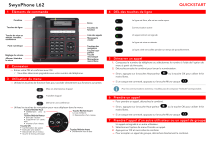 SwyxPhone L62 1 QUICKSTART Éléments de commande 4 Combine DEL des touches de ligne La ligne est libre, elle est en mode repos. Ecran Touches de ligne L1 L2 Touche de mise en attente, transfert, conférence Touches de fonction Communication active Liste des appels Messagerie vocale Un appel entrant est signalé. La ligne est mise en attente. Pavé numérique Touches des navigation Touche hautparleur Touche microasque Microphone mains libres Réglage du volume Allumer /éteindre le micro 2 La ligne a été verrouillée pendant un temps de parachèvement. 5 1. Composez le numéro de téléphone ou sélectionnez le numéro à l‘aide de l‘option de menu à partir du Annuaire. 2. Décrochez ensuite le combiné pour lancer la numérotation. Connexion Entrez votre PIN et confirmez avec OK. Vous êtes désormais joignable sous votre numéro de téléphone. 3 Sinon, appuyez sur la touches Haut-parleur mains libres. Utilisation du menu . Pour les communications externes, n‘oubliez pas de composer l‘indicatif correspondant. Mise en attente/prise d‘appel 6 Prendre un appel Pour prendre un appel, décrochez le combiné. Démarrer une conférence Sinon, appuyez sur la touche Haut-parleur mains libres. Utilisez les touches de navigation pour vous déplacer dans le menu: Touche fléchée Haut • Défilement vers le haut Touche fléchée Retour • Annuler l‘action • Supprimer un caractère • monter d‘un niveau Touche OK • Confirmation de saisie • Exécuter une action • Descendre d‘un niveau • Ouvrir le menu principal ou la touche OK pour utiliser le kit Si un casque est connecté, appuyez sur la touche Micro-casque Utilisez les touches de fonction fixes pour accéder directement aux fonctions suivantes: Transfert d‘appel Démarrer un appel Touche fléchée Avant Le cas échéant: • Descendre d‘un niveau Si un casque est connecté, appuyez sur la touche Micro-casque 7 OK Touche fléchée Avant • Défilement vers le bas ou la touche OK pour utiliser le kit . Prendre l‘appel d‘un autre utilisateur ou un appel de groupe Un appel est signalé à un autre utilisateur. 1. Sélectionnez l‘option de menu Prendre un appel. 2. Appuyez sur OK et raccrochez le combiné. Pour accepter un appel de groupe, décrochez directement le combiné. SwyxPhone L62 8 Désactiver le micro Appuyez sur la touche Allumer / éteindre le micro , pour mettre le micro en mode silencieux. Pour réallumer le micro, appuyez de nouveau sur la touche. 9 Activation du kit mains libres en cours de conversation Vous êtes en train de téléphoner via le combiné et souhaitez activer le kit mains libres. Appuyez sur la touche Haut-parleur et maintenez-la appuyée pendant que vous raccrochez le combiné. Votre appel utilise désormais le kit mains libres. Prenez le combiné pour désactiver le kit mains libres et poursuivre la conversation en utilisant le combiné. 10 Démarrer und deuxième appel (permuter ligne) 1. Pendant la communication, appuyez sur la touche En attente . Votre correspondant est mis en attente et écoute une musique pour le faire patienter. 2. Pour maintenir un autre appel, appuyez sur une touche de ligne libre et composez le numéro du deuxième correspondant. Vous pouvez passer alternativement de l‘un à l‘autre en appuyant sur la touche de ligne correspondante. 11 Connecter des participants Vous avez un appel en cours et souhaitez mettre l‘appelant en relation avec un autre correspondant. 1. Appuyez sur la touche Transfert . Votre correspondant est mis en attente et écoute une musique pour le faire patienter. 2. Composez le numéro d‘appel du deuxième correspondant. 3. Appuyez sur la touche OK. Les deux correspondants sont désormais connectés et vous pouvez raccrocher. 12 Démarrer une conférence Vous maintenez deux appels sur deux lignes différentes et vous souhaitez initier une conférence. Appuyez sur la touche Conférence . Vous êtes maintenant en conférence avec les deux correspondants. QUICKSTART 13 Rappel si occupé Si votre appel vers un correspondant interne sonne occupé, 1. sélectionnez l‘élément de menu Demande de rappel, puis cliquez sur OK. Une fois l‘abonné à nouveau libre, vous recevrez un signal sonore et à l‘écran, vous verrez apparaître le message Prendre un rappel. 2. Décrochez le combiné afin d‘être connecté avec votre correspondant. Si vous n‘avez pas accepté un rappel pendant que la ligne était occupée, la liste Appels en absence apparaît sur l‘écran. 14 Écouter des messages vocaux Les nouveaux messages vocaux sont affichés à l‘écran et également envoyées par email. Appuyez sur la touche Messagerie vocale pour écouter les messages vocaux. Suivez les instructions données par le menu sonore. 15 Renumérotation 1. Appuyez sur la touche de fonction Reunmérotation . Montre les 20 derniers numéros composés. 2. Décrochez le combiné et appuyez sur la touche Reunmérotation. Le dernier numéro que vous avez composé est rappelé. 16 Activer et désactiver les déviation d‘appels 1. Appuyez sur la touche de fonction Déviation d‘appels , pour activer / désactiver la déviation immédiate de tous les appels vers votre messagerie vocale. Lors de l‘activation, la touche de fonction Déviation d‘appels clignote de façon prolongée. Configurer la déviation d‘appels 1. Sélectionnez l‘option de menu 4 > Transférer appel dans le menu principal et sélectionnez le type d‘appel que vous souhaitez modifier (immédiatement, si occupé, temporisé). 2. Déterminer si un appel vers la messagerie vocale ou un numéro de téléphone doit être dévié. 3. Confirmez cotre choix avec OK. SwyxPhone L62 17 Touches de ligne Vous pouvez déterminer quels appels arrivent sur quelles lignes de votre SwyxPhone. 1. Sélectionnez l‘option de menu 8 > Configuration | 3 > Lignes dans le menu principal. 2. Sélectionnez la ligne que vous souhaitez configurer. 3. Appuyez sur la touche OK. Vous pouvez rendre indisponi