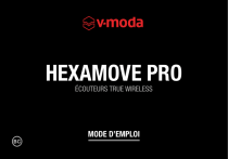 HEXAMOVE PRO ÉCOUTEURS TRUE WIRELESS MODE D’EMPLOI ATTENTION Si le numéro de série sur le produit, sur la couverture du manuel ou au bas de la boîte est absent ou dégradé, veuillez retourner le produit au revendeur immédiatement. LISEZ-MOI Avant d’utiliser ce produit, lisez attentivement les informations de sécurité et de garantie contenues dans les brochures fournies. Veuillez également conserver les documents à portée afin qu’ils soient disponibles immédiatement en cas de besoin. Pour obtenir une version imprimable du manuel complet, rendez-vous sur www.v-moda.com/manuals À PROPOS DES ÉCOUTEURS Bienvenue chez V-MODA, l’ultime référence de style de vie des mélomanes. Nous espérons sincèrement que vous apprécierez nos écouteurs et leur équilibre parfait entre style intemporel, ergonomie moderne et technologie de pointe. Les écouteurs Hexamove Pro sont les premiers écouteurs true wireless capables de vous offrir à la fois le son classique V-MODA de haute qualité et une liberté de mouvement infinie. Avec leur autonomie allant jusqu'à 6 heures de lecture et leur étui de transport doublé d'une station de charge offrant 18 heures de batterie supplémentaires, les écouteurs Hexamove Pro offriront une nouvelle dimension à votre vie quotidienne, sans encombrer vos poches. Le design des écouteurs Hexamove Pro leur permet de s’adapter à l’oreille de chacun. Grâce aux années de R&D consacrées à l’amélioration de leur conception ergonomique, les écouteurs Hexamove Pro vous garantissent un confort optimal et une tenue parfaitement sûre grâce à l’ensemble des accessoires de sport et ailettes de maintien ainsi que des 3 tailles d’embouts BLISS (Bass Level Isolating Soft Silicone). Choisissez la configuration qui vous convient et qui accompagnera parfaitement votre routine quotidienne, pour sublimer votre musique en toute sécurité. Exprimez-vous avec les clips interchangeables Hexamove. Changez de look comme d’humeur en un rien de temps avec les clips coulissants et verrouillables : chaque paire d'Hexamove Pro est livrée avec trois paires de clips pour vous permettre de personnaliser vos écouteurs avec des combinaisons de couleurs reflétant votre style unique. Téléchargez l'application V-MODA pour profiter d’une expérience audio parfaitement personnalisée. Personnalisez votre signature sonore à l'aide de l'outil EQ : sélectionnez le préréglage d'égalisation parfait pour tous vos morceaux ou prenez les choses en main en personnalisant chaque niveau à votre guise. CONTENU 1 2 5 6 8 9 3 7 4 1. Écouteurs true wireless Hexamove Pro 2. Étui de chargement 3. 1 paire d'anneaux 4. 1 paire d’ailettes de maintien 5. 3 jeux d’embouts BLISS (S, M, L) 6. 2 paires de clips coulissants et verrouillable 7. Câble de chargement USB-C 8. Tour de cou 9. Stabilisateur PORTER VOS ÉCOUTEURS 1 Insérez les embouts BLISS de votre choix sur les écouteurs 2 Très important : insérez l’écouteur correct pour chaque oreille. « L » dans l'oreille gauche, « R » dans l'oreille droite 3 Vérifiez que l'écouteur est bien inséré dans votre oreille, avec un ajustement serré (similaire à celui d’un bouchon d'oreille) pour assurer la meilleure qualité sonore et le plus grand confort possibles 4 Si vous ne vous sentez pas à 100% à l'aise une fois l'écouteur inséré dans votre oreille, essayez une autre taille d’embout ou ajoutez les ailettes de sport ou de maintien à votre convenance 5 Pour plus de tranquillité d’esprit, serrez le tour de cou INSTALLATION DES ACCESSOIRES 1 Placez l'accessoire choisi autour de l'écouteur correspondant (L et R). Alignez la parie insérable de l'accessoire avec le trou de l'écouteur 2 Insérez l'écouteur dans l'oreille correspondante (L et R) 3 Ajustez l'accessoire pour qu'il s'adapte parfaitement STOCKAGE DE VOS ÉCOUTEURS 1 Rangez les écouteurs dans l'étui de chargement afin d’éviter de les endommager lorsque vous ne les utilisez ou ne les portez pas 2 L’étui de chargement charge automatiquement les écouteurs afin que vous disposiez toujours de l’autonomie nécessaire 3 Vous pouvez ranger les Hexamove Pro dans l’étui en même temps que leurs ailettes de maintien ou de sport. a. Placez d’abord l'écouteur du côté L dans l'étui b. Placez ensuite l'écouteur du côté R dans l'étui. Ranger les écouteurs dans cet ordre garantira leur parfaite protection dans l'étui DESCRIPTION DES ÉCOUTEURS 2 1 Touch-Gyro Sensors 2 Sport Fins 1 2 3 3 BLISS Fittings 4 Neck Strap Attachment Input 5 4 1 3 5 Shields 5 4 6 6 Microphone GETTING STARTED 1 Download the V-MODA app and open it on your device 2 Remove Hexamove Pro from their case to automatically turn the earbuds on; if they have not been paired with an active device previously, they will automatically enter pairing mode 3 The earbuds will appear in the Bluetooth settings of your device as V-MODA HEXM PRO 4 Select V-MODA HEXM PRO to complete pairing Get the V-MODA app on Google Play or the App Store. It is recommended to charge the battery before using your headphones for the first time. GUIDE ÉTAPE PAR ÉTAPE 1 ALLUMAGE/EXTINCTION a. Pour allumer les écouteurs, retirez-les de leur étui b. Pour éteindre les écouteurs, rangez-les dans leur étui 2 EXTINCTION AUTOMATIQUE a. Après 10 minutes d'inactivité, les écouteurs Hexamove Pro s'éteindront automatiquement b. Pour allumer les écouteurs après leur extinction automatique, appuyez sur l'un des écouteurs pour les réactiver 3 PREMIER APPARIEMENT SANS FIL a. Retirez les écouteurs Hexamove Pro de leur étui pour les allumer automatiquement; s'ils n'ont jamais été appariés avec un appareil actif, ils entreront automatiquement en mode d’appariement b. Lorsque « V-MODA HEXM PRO » apparaît dans la section « Nouveaux périphériques Bluetooth » dans votre téléphone, sélectionnez-le pour lancer l’appariement 4 CONNEXION D'UN NOUVEL APPAREIL a. Désactivez le Bluetooth s