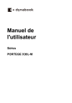 Manuel de l'utilisateur Séries PORTEGE X30L-M Table des matières Chapitre 1 Mentions légales Copyright, responsabilités et marques ............................................... 1-1 Règlements ............................................................................................ 1-2 Avis concernant les normes vidéo ...................................................... 1-9 OpenSSL Toolkit License Issues ......................................................... 1-9 FreeType License Issues .................................................................... 1-12 Programme ENERGY STAR® ............................................................. 1-15 Mise au rebut de l'ordinateur et de sa batterie ................................. 1-15 Précautions générales ........................................................................ 1-16 Icônes de sécurité ............................................................................... 1-19 Chapitre 2 Prise en main Liste de contrôle de l'équipement ....................................................... 2-1 Conventions ........................................................................................... 2-1 Première utilisation de l'ordinateur ..................................................... 2-2 Prise en main de Windows ................................................................... 2-7 Arrêt de l'ordinateur .............................................................................. 2-9 Récupération du système ................................................................... 2-13 Chapitre 3 Présentation Vue avant écran fermé .......................................................................... 3-1 Vue de gauche ....................................................................................... 3-1 Vue de droite .......................................................................................... 3-3 Retour ..................................................................................................... 3-5 Vue de dessous ..................................................................................... 3-5 Vue avant avec écran ouvert ................................................................ 3-6 Composants matériels internes ......................................................... 3-10 Descriptions des conditions d'alimentation ..................................... 3-12 Chapitre 4 Concepts de base Utilisation de l'écran tactile .................................................................. 4-1 Utilisation du TouchPad ....................................................................... 4-2 Clavier .................................................................................................... 4-4 Utilisation du lecteur d'empreintes ...................................................... 4-7 Batterie ................................................................................................... 4-9 Cartes mémoire ................................................................................... 4-13 Carte à puce ......................................................................................... 4-16 Appareil réseau étendu sans fil ......................................................... 4-16 Manuel de l'utilisateur ii Fonction GPS ....................................................................................... 4-18 Port de sortie HDMI™ ......................................................................... 4-18 Adaptateurs USB Type-C™ ................................................................ 4-20 Réseau local ........................................................................................ 4-23 WiDi (Wireless Display) ...................................................................... 4-24 Prise de sécurité .................................................................................. 4-25 Accessoires en option ........................................................................ 4-26 Système audio et mode vidéo ............................................................ 4-27 Chapitre 5 Utilitaires et fonctions avancées Utilitaires et applications ...................................................................... 5-1 Fonctions spéciales .............................................................................. 5-9 Chapitre 6 Résolution des problèmes Processus de résolution des problèmes ............................................ 6-1 Liste de contrôle du matériel et du système ...................................... 6-4 Assistance technique ......................................................................... 6-16 Chapitre 7 Annexe Spécifications ........................................................................................ 7-1 Cordons et connecteurs d'alimentation .............................................. 7-2 Appareils sans fil ................................................................................... 7-3 Informations sur Intel AMT® .............................................................. 7-14 Accessibilité ........................................................................................ 7-18 Options d'ergonomie des ordinateurs portables Dynabook ........... 7-18 Remarques légales .............................................................................. 7-22 Glossaire .............................................................................................. 7-24 Index Manuel de l'utilisateur iii Chapitre 1 Mentions légales Le présent chapitre regroupe les remarques légales et de sécurité qui s'appliquent à votre ordinateur. Copyright, responsabilités et marques Copyright © 2024 Dynabook Inc. Tous droits réservés. Selon la loi du Copyright, le présent guide ne peut pas être reproduit, sous quelque forme que ce soit, sans l'autorisation écrite préalable de Dynabook Inc. Dynabook n'engage aucunement sa responsabilité