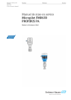 BA02263F/14/FR/04.25-00 71707023 2025-05-09 Products Solutions 01.00.zz (Firmware de l'appareil) Manuel de mise en service Micropilot FMR63B PROFIBUS PA Radar à émission libre Services Micropilot FMR63B PROFIBUS PA 1. Order code: XXXXX-XXXXXX Ser. no.: XXXXXXXXXXXX Ext. ord. cd.: XXX.XXXX.XX Serial number 2. www.endress.com/deviceviewer Endress+Hauser Operations App 3. A0023555 • Conserver le présent document à un endroit sûr de manière à ce qu'il soit toujours accessible lors des travaux sur et avec l'appareil • Afin d'éviter tout risque pour les personnes ou l'installation : lire soigneusement le chapitre "Consignes de sécurité de base" ainsi que toutes les autres consignes de sécurité de ce document spécifiques aux procédures de travail Le fabricant se réserve le droit de modifier les caractéristiques techniques sans avis préalable. Consulter Endress+Hauser pour obtenir les informations actuelles et les éventuelles mises à jour du présent manuel. 2 Endress+Hauser Micropilot FMR63B PROFIBUS PA Sommaire Sommaire 1 Informations relatives au document . . . . . . . . . . . . . . . . . . . . . . . . . . 5 1.1 1.2 1.3 1.4 1.5 But du présent document . . . . . . . . . . . . . . . . . 5 Symboles . . . . . . . . . . . . . . . . . . . . . . . . . . . . . 5 1.2.1 Symboles d'avertissement . . . . . . . . . . 5 1.2.2 Symboles pour certains types d'information et graphiques . . . . . . . . . 5 Liste des abréviations . . . . . . . . . . . . . . . . . . . . 6 Documentation . . . . . . . . . . . . . . . . . . . . . . . . 6 Marques déposées . . . . . . . . . . . . . . . . . . . . . . 6 2 Consignes de sécurité de base . . . . . . . 8 2.1 2.2 2.3 2.4 2.5 2.6 2.7 Exigences imposées au personnel . . . . . . . . . . . 8 Utilisation conforme . . . . . . . . . . . . . . . . . . . . 8 Sécurité du travail . . . . . . . . . . . . . . . . . . . . . . 9 Sécurité de fonctionnement . . . . . . . . . . . . . . . 9 Sécurité du produit . . . . . . . . . . . . . . . . . . . . . . 9 Sécurité informatique . . . . . . . . . . . . . . . . . . . . 9 Sécurité informatique spécifique à l'appareil . . . 9 3 Description du produit . . . . . . . . . . . . . 11 3.1 Construction du produit . . . . . . . . . . . . . . . . . 11 4 Réception des marchandises et identification du produit . . . . . . . . . . . 12 4.1 4.2 Réception des marchandises . . . . . . . . . . . . . . 12 Identification du produit . . . . . . . . . . . . . . . . . 12 4.2.1 Plaque signalétique . . . . . . . . . . . . . . 12 4.2.2 Adresse du fabricant . . . . . . . . . . . . . 13 Stockage et transport . . . . . . . . . . . . . . . . . . . 13 4.3.1 Conditions de stockage . . . . . . . . . . . 13 4.3.2 Transport de l'appareil vers le point de mesure . . . . . . . . . . . . . . . . . . . . . 13 4.3 5 Montage . . . . . . . . . . . . . . . . . . . . . . . . . . 14 5.1 5.2 Instructions générales . . . . . . . . . . . . . . . . . . 14 Exigences liées au montage . . . . . . . . . . . . . . 14 5.2.1 Éléments internes de la cuve . . . . . . . 14 5.2.2 Éviter les échos parasites . . . . . . . . . . 15 5.2.3 Orientation verticale de l'axe de l'antenne . . . . . . . . . . . . . . . . . . . . . . 15 5.2.4 Orientation radiale de l'antenne . . . . . 15 5.2.5 Possibilités d'optimisation . . . . . . . . . 15 Montage de l'appareil . . . . . . . . . . . . . . . . . . . 15 5.3.1 Antenne intégrée, PEEK 20 mm (0,75 in) . . . . . . . . . . . . . . . . 15 5.3.2 Antenne, plaquée PTFE, affleurante 50 mm (2 in) . . . . . . . . . . . . . . . . . . 16 5.3.3 Antenne, plaquée PTFE, affleurante 80 mm (3 in) . . . . . . . . . . . . . . . . . . 16 5.3 Endress+Hauser 5.3.4 5.4 Antenne, plaquée PEEK, 20 mm (0,75 in) montage affleurant avec NEUMO Bio Control D25 . . . . . . 5.3.5 Antenne, plaquée PEEK, 40 mm (1,5 in) montage affleurant avec NEUMO Bio Control D50 . . . . . . 5.3.6 Antenne, plaquée PEEK, 40 mm (1,5 in) montage affleurant avec tube Varivent N . . . . . . . . . . . . . 5.3.7 Rotation du boîtier . . . . . . . . . . . . . . 5.3.8 Rotation du module d'affichage . . . . . 5.3.9 Changement de la position de montage du module d'affichage . . . . . 5.3.10 Fermeture des couvercles de boîtier . . Contrôle du montage . . . . . . . . . . . . . . . . . . . 6 Raccordement électrique . . . . . . . . . . . 23 6.1 6.4 Exigences de raccordement . . . . . . . . . . . . . . 23 6.1.1 Couvercle avec vis de fixation . . . . . . . 23 6.1.2 Compensation de potentiel . . . . . . . . 23 Raccordement de l'appareil . . . . . . . . . . . . . . . 24 6.2.1 Tension d'alimentation . . . . . . . . . . . 24 6.2.2 Spécification de câble . . . . . . . . . . . . 25 6.2.3 Parafoudre . . . . . . . . . . . . . . . . . . . . 25 6.2.4 Câblage . . . . . . . . . . . . . . . . . . . . . . 26 6.2.5 Affectation des bornes . . . . . . . . . . . 27 6.2.6 Entrées de câble . . . . . . . . . . . . . . . . 28 6.2.7 Connecteurs d'appareil disponibles . . 28 Garantir l'indice de protection . . . . . . . . . . . . 28 6.3.1 Entrées de câble . . . . . . . . . . . . . . . . 28 Contrôle du raccordement . . . . . . . . . . . . . . . 29 7 Options de configuration . . . . . . . . . . . 30 7.1 7.2 Aperçu des options de configuration . . . . . . . . 30 Touches de configuration et commutateurs DIP sur l'électronique PROFIBUS PA . . . . . . . . 30 7.2.1 Adressage hardware . . . . . . . . . . . . . 30 7.2.2 Adressage software . . . . . . . . . . . . . . 31 Structure et principe de fonctionnement du menu de configuration . . . . . . . . . . . . . . . . . 31 7.3.1 Rôles utilisateur et leurs droits d'accès . . . . . . . . . . . . . . . . . . . . . . . 31 Accès au menu de configuration via afficheur local . . . . . . . . . . . . . . . . . . . . . . . . . . . . . . . 31 7.4.1 Affichage de l'appareil (en option) . . . 31 7.4.2 Configuration via technologie sans fil Bluetooth® (en option) . . . . . . . . . . . 32 Accès au menu de configuration via l'outil de configuration . . . . . . . . 
