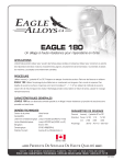 EAGLE 180 Un alliage à haute résistance pour réparations en fonte APPLICATIONS L’électrode peut être utiliser pour souder des fontes grises ductiles et nodulaires. Utiliser pour construire ou joindre des réparations de blocs moteurs, encastrements, pignons, encastrement de transmission, roue dentée, et bases de machines. Les dépôts sont entièrement usinables. PROCÉDURE Utiliser inverse ( + ) polarité AC ou DC. Préparer et nettoyer l’endroit de soudure. Rainurer les fissures en utilisant EAGLE 188. Utiliser l'ampérage le plus faible tout en maintenant une longueur d'arc courte à moyenne. Des dépôts de soudure courtes à moyennes sont recommandées (1” – 1 1/2”) en utilisant la méthode de soudure sauter afin de réduire l'apport de chaleur. Martelage pendant chaud aidera à réduire le stress. Laisser le moulage refroidir lentement. CARACTÉRISTIQUES GÉNÉRALES L’EAGLE 180 est une électrode centrale spéciale à un alliage à haute résistance qui produira de soudures sans porosité sur toute fonte.. DONÉES TECHNIQUES Couleur de la pointe: Verte foncée Dureté (BH): 200 L’étirement à résistance typique: Jusqu’à 70,000 psi (483 N/mm2) Limite d'élasticité typique: Jusqu’à 50,000 psi (345N/mm2) Élongation: Environ 18% Dureté typique: 87-90 HRB(DGRH) Polarité/Courant: Inverse AC ou DC (électrode +) PARAMÈTRES DE SOUDAGE Courant Inverse ( + ) polarité AC ou DC Grandeur Pouces 3/32 1/8 5/32 mm 2.50 3.25 4.00 Ampérage 35-70 70-110 120-130 DEPUIS 1990 Produits De Soudage De Haute Qualité 10077 - 166 STREET, EDMONTON, ALBERTA T5P 4Y1 • BUS: (780) 481-8082 POUR UNE ASSISTANCE TECHNIQUE, APPELEZ-NOUS SANS FRAIS 1-800-447-1415 021224 ">