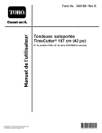Form No. 3455-881 Rev B Tondeuse autoportée TimeCutter® 107 cm (42 po) N° de modèle 75748—N° de série 412570000 et suivants Enregistrez votre produit à www.Toro.com. Traduction du texte d'origine (FR) *3455-881* Introduction Vous commettez une infraction à la section 4442 ou 4443 du Code des ressources publiques de Californie si vous utilisez cette machine dans une zone boisée, broussailleuse ou recouverte d'herbe, à moins d'équiper le moteur d'un pare-étincelles en bon état, tel que défini dans la section 4442, ou à moins que le moteur soit construit, équipé et entretenu correctement pour prévenir les incendies. Cette tondeuse autoportée à lames rotatives est destinée au grand public, pour un usage résidentiel. Elle est principalement conçue pour tondre les pelouses entretenues régulièrement. L'utilisation de ce produit à d'autres fins que celle prévue peut être dangereuse pour vous-même et toute personne à proximité. Couple brut ou net : le couple brut ou net de ce moteur a été calculé en laboratoire par le constructeur du moteur selon la norme SAE J1940 ou J2723 de la Society of Automotive Engineers (SAE). Étant configuré pour satisfaire aux normes de sécurité, antipollution et d'exploitation, le moteur monté sur cette classe de tondeuse aura un couple effectif nettement inférieur. Reportez-vous au manuel du constructeur du moteur fourni avec la machine. Lisez attentivement cette notice pour apprendre comment utiliser et entretenir correctement votre produit, et éviter ainsi de l'endommager ou de vous blesser. Vous êtes responsable de l'utilisation sûre et correcte du produit. Rendez-vous sur www.Toro.com pour tout document de formation à la sécurité et à l'utilisation des produits, pour tout renseignement concernant un produit ou un accessoire, pour obtenir l'adresse des dépositaires ou pour enregistrer votre produit. Le manuel du propriétaire du moteur ci-joint est fourni à titre informatif concernant la réglementation de l'Agence américaine pour la protection de l'environnement (EPA) et la réglementation antipollution de l'état de Californie relative aux systèmes antipollution, à leur entretien et à leur garantie. Vous pouvez vous en procurer un nouvel exemplaire en vous adressant au constructeur du moteur. Pour obtenir des prestations de service, des pièces Toro d'origine ou des renseignements complémentaires, munissez-vous des numéros de modèle et de série du produit et contactez un dépositaire-réparateur ou le service client Toro agréé. La Figure 1 indique l'emplacement des numéros de modèle et de série du produit. Inscrivez les numéros dans l'espace réservé à cet effet. ATTENTION Important: Avec votre appareil mobile, vous CALIFORNIE Proposition 65 - Avertissement Les gaz d'échappement de ce produit contiennent des substances chimiques considérées par l'état de Californie comme susceptibles de provoquer des cancers, des malformations congénitales et autres troubles de la reproduction. Les bornes de la batterie et accessoires connexes contiennent du plomb et des composés de plomb. L'état de Californie considère ces substances chimiques comme susceptibles de provoquer des cancers et des troubles de la reproduction. Lavez-vous les mains après avoir manipulé la batterie. L'utilisation de ce produit peut entraîner une exposition à des substances chimiques considérées pas l'état de Californie comme capables de provoquer des cancers, des anomalies congénitales ou d'autres troubles de la reproduction. pouvez scanner le code QR sur l'autocollant du numéro de série (le cas échéant) pour accéder à l'information sur la garantie, les pièces et autres renseignements concernant le produit. g297763 Figure 1 Sous le siège 1. Emplacement des numéros de modèle et de série Notez les numéros de modèle et de série du produit dans l'espace ci-dessous : © 2025—The Toro® Company 8111 Lyndale Avenue South Bloomington, MN 55420 2 Contactez-nous sur www.Toro.com. Imprimé aux États-Unis Tous droits réservés Consignes de sécurité pendant l'utilisation ..................................................... 15 Utilisation de la commande des lames (PDF) ............................................................ 18 Utilisation de l'accélérateur ............................... 18 Utilisation du volet de départ ............................. 18 Démarrage du moteur....................................... 19 Arrêt du moteur................................................. 19 Utilisation des leviers de commande de déplacement ................................................. 20 Conduite de la machine .................................... 20 Utilisation du système de commande Smart SpeedTM ........................................................ 22 Utilisation de l'éjection latérale.......................... 23 Réglage de la hauteur de coupe ....................... 24 Réglage des galets anti-scalp ........................... 24 Conseils d'utilisation ........................................ 25 Après l'utilisation ................................................. 26 Consignes de sécurité après l'utilisation............ 26 Nettoyage de la machine .................................. 26 Pousser la machine à la main ........................... 27 Transport de la machine ................................... 28 Entretien ................................................................. 30 Consignes de sécurité pendant l'entretien ...................................................... 30 Programme d'entretien recommandé .................. 31 Procédures avant l'entretien ................................ 32 Levage de la machine....................................... 32 Lubrification ......................................................... 32 Graissage des roulements................................ 32 Entretien du moteur ............................................. 33 Consignes de sécurité pour 