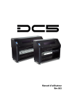 Manuel d’utilisateur Rév 003 Avis FCC La machine DC5 a été testée et trouvée conforme aux limites pour classe A des appareils numériques, conformément à la partie 15 des règles de la FCC. Ces limites sont conçues pour fournir une protection raisonnable contre les interférences nuisibles lorsque l'équipement soit utilisé dans un environnement commercial. Les systèmes d'impression de résine et découpe à transfert thermique génèrent, utilisent et peuvent émettre une énergie de radiofréquence et, si non installés et utilisés conformément au manuel d'instructions, peut provoquer des interférences dans les communications radio. Des opérations des machines dans une zone résidentielle sont susceptibles de provoquer des interférences nuisibles. Dans ce cas l'utilisateur sera tenu de corriger les interférences à ses propres frais. Précaution! Des changements ou des modifications qui n’ont pas été expressément approuvés par Summa, qui est responsable pour la conformité FCC, pourraient annuler l'autorité de l'utilisateur à utiliser cet équipement. Avis DOC La DC5 ne dépasse pas les limites Classe A pour le bruit de la radio pour les appareils numériques énoncés dans le Règlement du Département des Communications du Canada sur les interférences radio. Avis Summa se réserve le droit de modifier les informations contenues dans ce manuel d'utilisation à tout moment sans préavis. Toute copie, modification, distribution ou publication est interdite. Tous droits réservés. Directive sur les déchets d'équipements électriques et électroniques Directive 2002/96/EC du Parlement européen et du Conseil Le symbole (droite) est visible sur ce produit. Il indique que le produit ne doit pas être jeté avec les ordures ménagères, mais doit être éliminé séparément. Les équipements électriques et électroniques peuvent contenir des matériaux qui sont dangereux pour l'environnement et la santé humaine et doivent donc être éliminés à un centre de déchets désigné ou retournés à votre détaillant pour le recyclage approprié. Si vous souhaitez vous débarrasser de ce produit mais le produit fonctionne encore, envisagez de recycler / réutiliser le produit en faisant un don à un magasin de la charité, vendez-le ou rechangez des pièces avec votre détaillant. Droit d’auteur © Summa Enregistrement de votre traceur à découpe Merci d’enregistrer votre traceur à découpe en vous rendant à l’adresse suivante : http://www.summa.be/registration.html Tout retard survenant dans le retour du Certificat de Garantie dûment complété est susceptible de ralentir vos démarches dans le cadre de la garantie. Contact Toute requête, commentaire ou suggestion concernant ce manuel ou tout autre manuel Summa doit être adressé à : Summa, nv Rochesterlaan 6 B-8470 GISTEL Belgium Website www.summa.be Bienvenue Félicitations pour votre achat de la nouvelle DC5! La DC5 est l'unité de production d'étiquettes ultime, combinant la durabilité d'image et une précision de découpe de contour dans un seul appareil. La DC5 utilise la technologie de transfert thermique. Ceci est un procédé d'impression de transfert à sec qui utilise la chaleur et la pression pour créer un lien durable avec les encres à base de résine et avec les matériaux. Les encres de résine sont fournies sur des rubans contenant des pigments denses en suspension dans un support en matière plastique solide. Cette haute densité de pigments aboute aux images qui sont très résistantes à l'abrasion, et elle fournit une résistance à l'eau et aux UV à long terme avec une longue durée de vie en plein air sans laminages. L’impression par transfert thermique ne produit aucune fumée ; ne crée pas de gâchis et ne nécessite pas d’entretien ni de l'utilisation de produits chimiques de nettoyage. Tous les aspects de la DC5 ont été conçus pour un fonctionnement simplifié. Le chargement de matériau est un jeu d’enfant grâce à l'alignement automatique du matériau. Des rubans peuvent être remplis aisément et ne peuvent pas être chargés incorrectement. Ce manuel est un guide de référence pour l'installation et l'exploitation de la DC5. Révisions minimales nécessaires pour ce manuel: Firmware DC5 main : 006 Firmware DC5 com : 006 Pilote USB : 6.4 Des outils d’impression Summa: 1.4.0.0 Color Control : 8.0 (Mars 2014 – installation 04/01/2014) Table des matières 1 Installation .................................................................................................... 1-1 1.1 Déballage de la DC5(sx) ................................................................................... 1-1 1.2 DC5(sx) des composants de l’imprimante ................................................... 1-4 1.2.1 La DC5(sx) telle que vue depuis l’avant ................................................................... 1-4 1.2.2 L’imprimante telle que vue de l’arrière ....................................................................... 1-6 1.3 Sécurité, Environnement de fonctionnement idéale Brancher l’appareil1-7 1.3.1 Sécurité...................................................................................................................................... 1-7 1.3.1.1 Général............................................................................................................................. 1-7 1.3.1.2 Symboles utilisés dans le manuel....................................................................... 1-7 1.3.1.3 Précautions de sécurité ........................................................................................... 1-8 1.3.2 Environnement d’exploitation ......................................................................................... 1-8 1.3.3 Connecter l’imprimante au réseau ............................................................................... 1-9 1.3.3.1 Échouage (“Mise à la terre”) ............